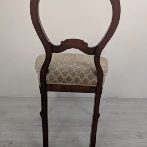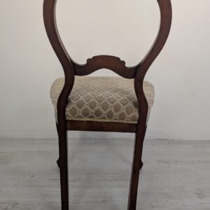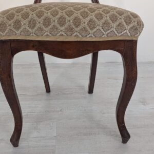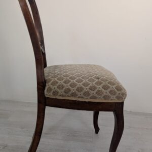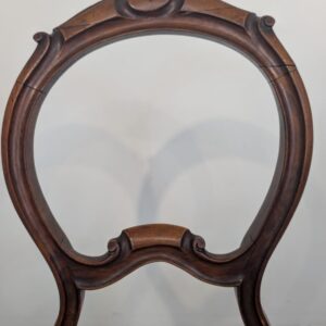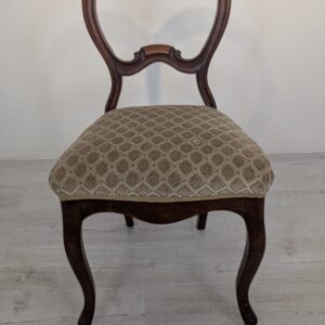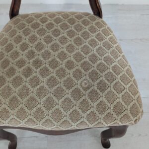 Stylowy fotel w stylu rokoko z drugiej połowy XIX wieku. Drewniana konstrukcja w ciemnym odcieniu, zdobiona rzeźbionymi elementami. Siedzisko tapicerowane w klasyczny wzór. Mebel w dobrym stanie, może być ciekawym uzupełnieniem klasycznego wnętrza.