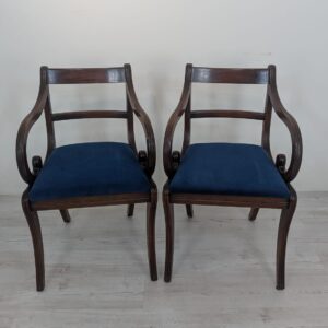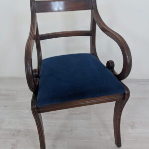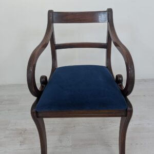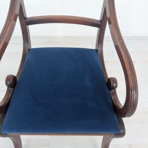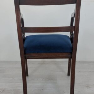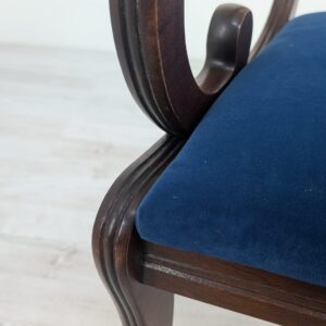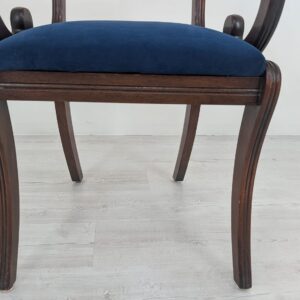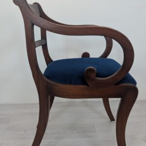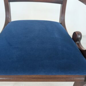 Stylowy fotel w stylu biedermeier wykonany z drewna mahoniowego. Mebel posiada charakterystyczne dla tego stylu profilowane oparcie i siedzisko tapicerowane niebieskim materiałem. Fotel jest w dobrym stanie użytkowym, może stanowić ciekawy dodatek do wnętrza w stylu retro.