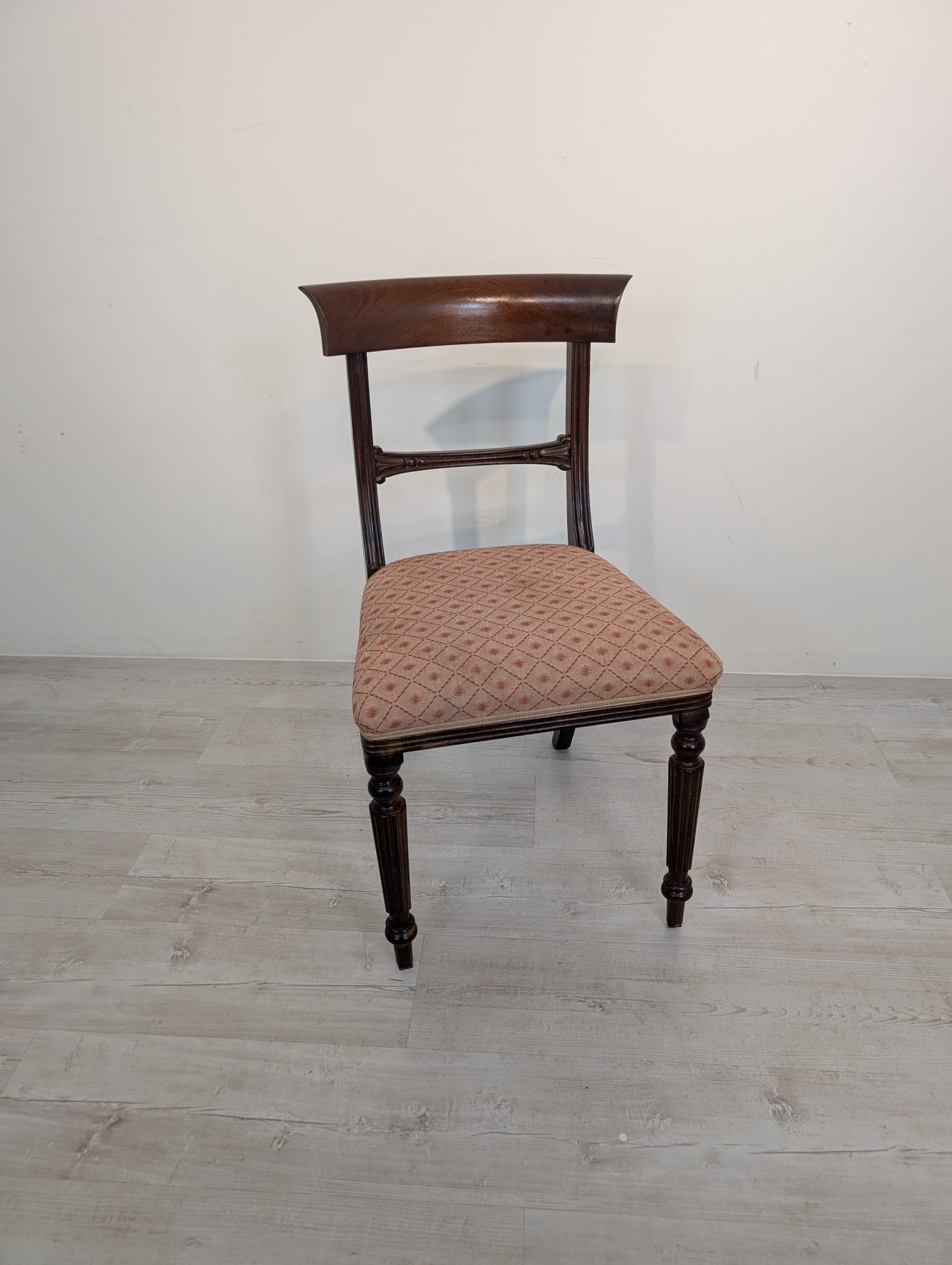 Stylowy fotel w stylu regencyjnym wykonany z ciemnego, mahoniowego drewna. Siedzisko tapicerowane w delikatny, geometryczny wzór. Mebel jest w dobrym stanie, nadaje się do użytku w salonie lub gabinecie.