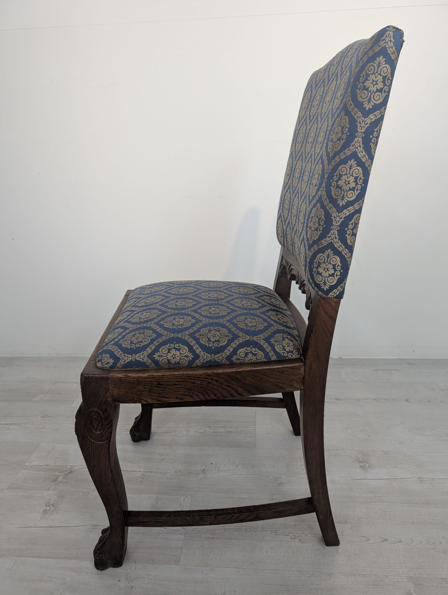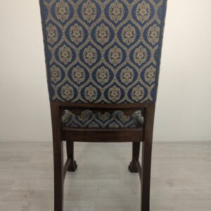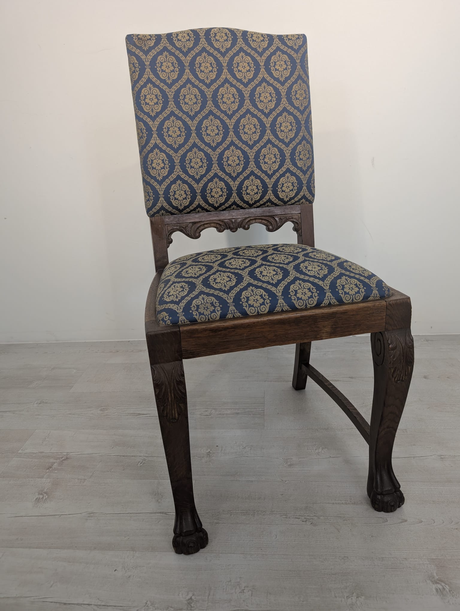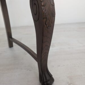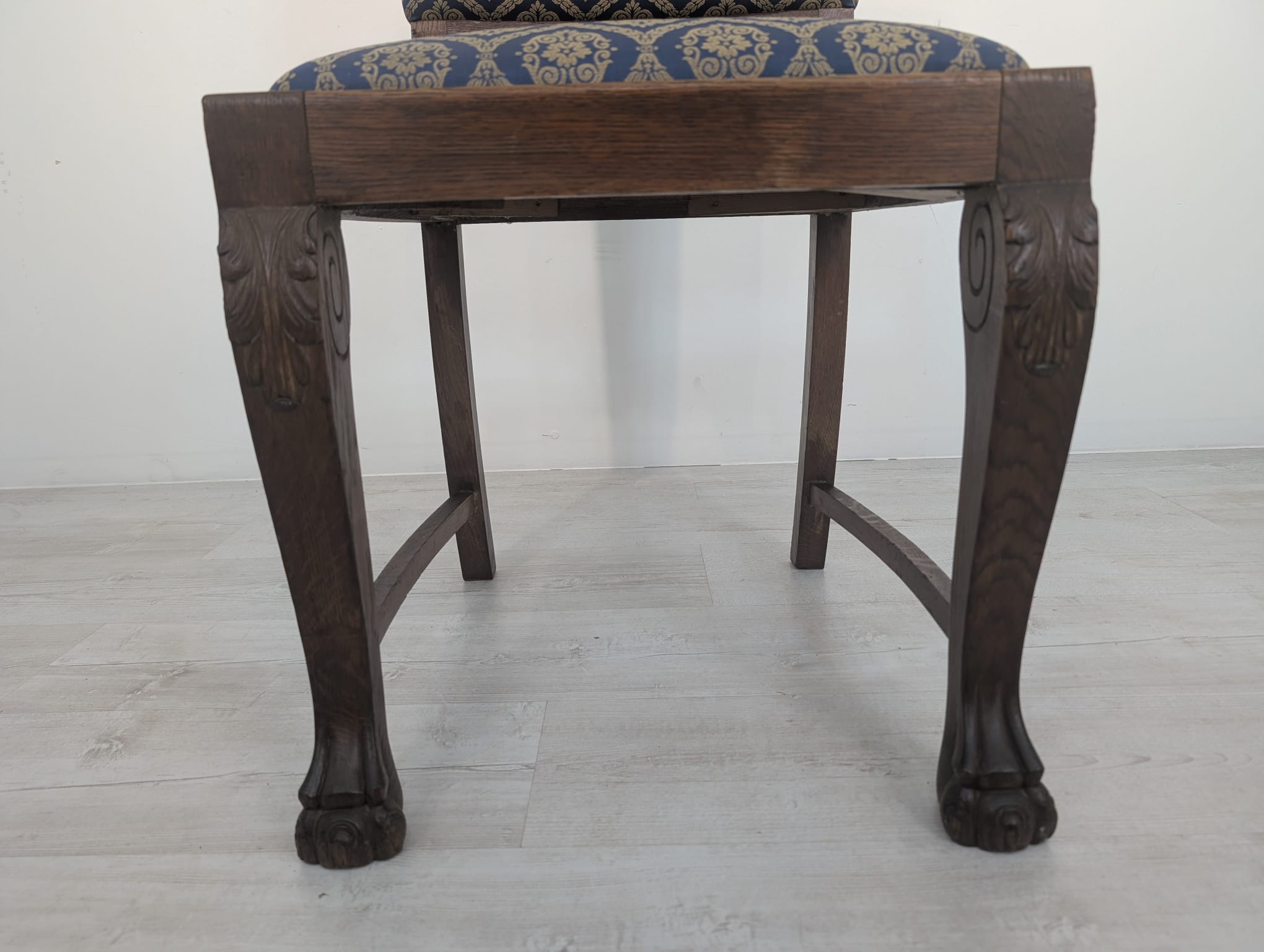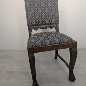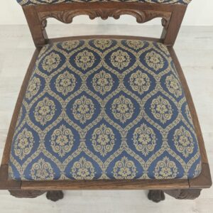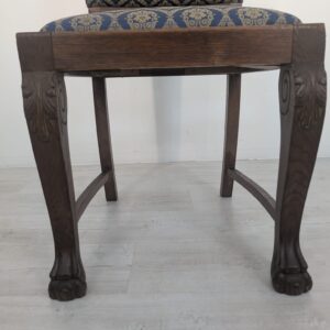 Solidne krzesło z drewna dębowego z rzeźbionymi zdobieniami w kształcie lwich łap z lat 20./30. XX wieku. Krzesło posiada piękny, stylowy wygląd i jest w dobrym stanie użytkowym.