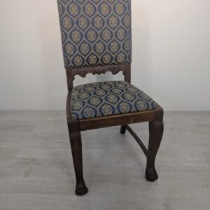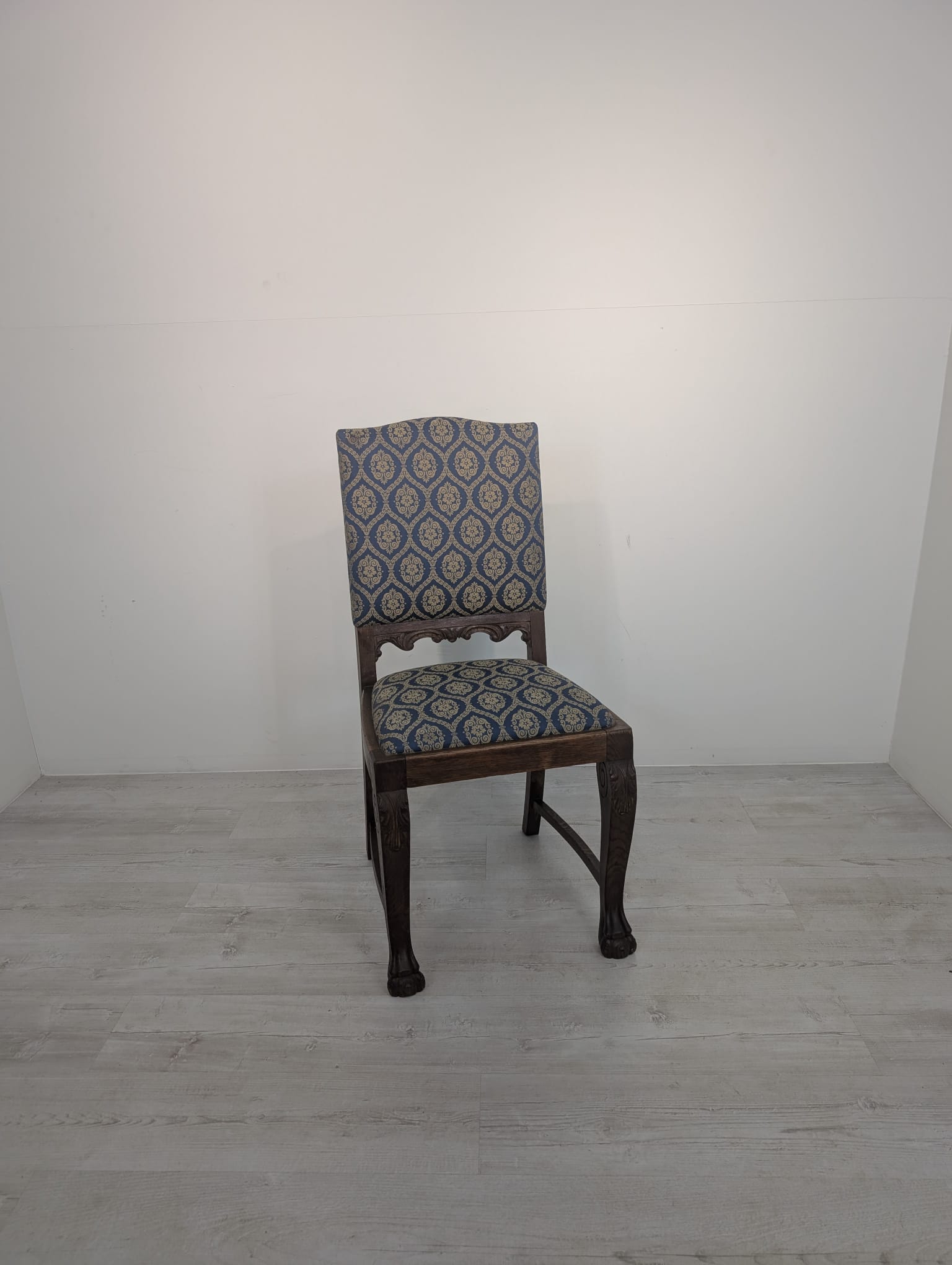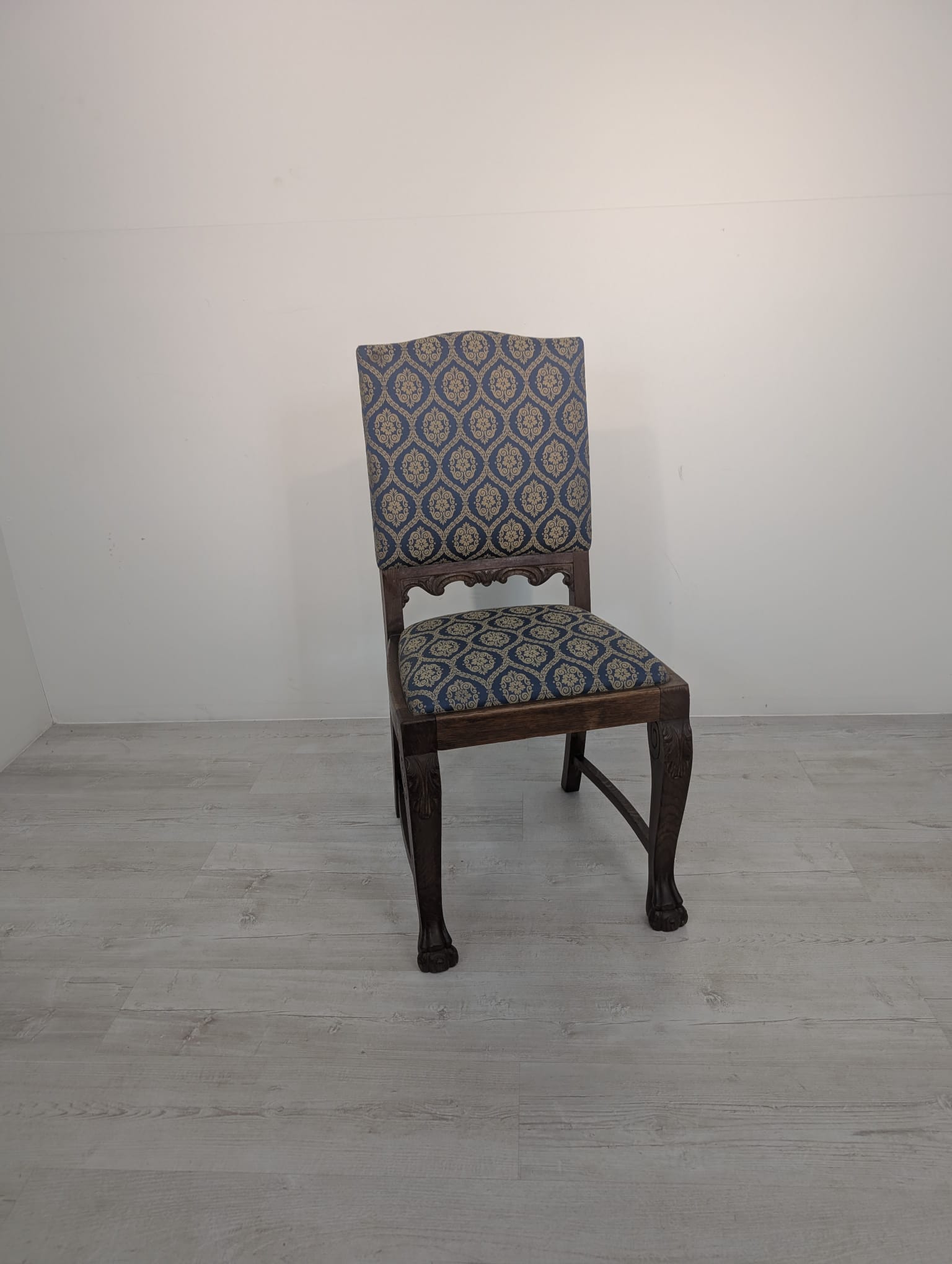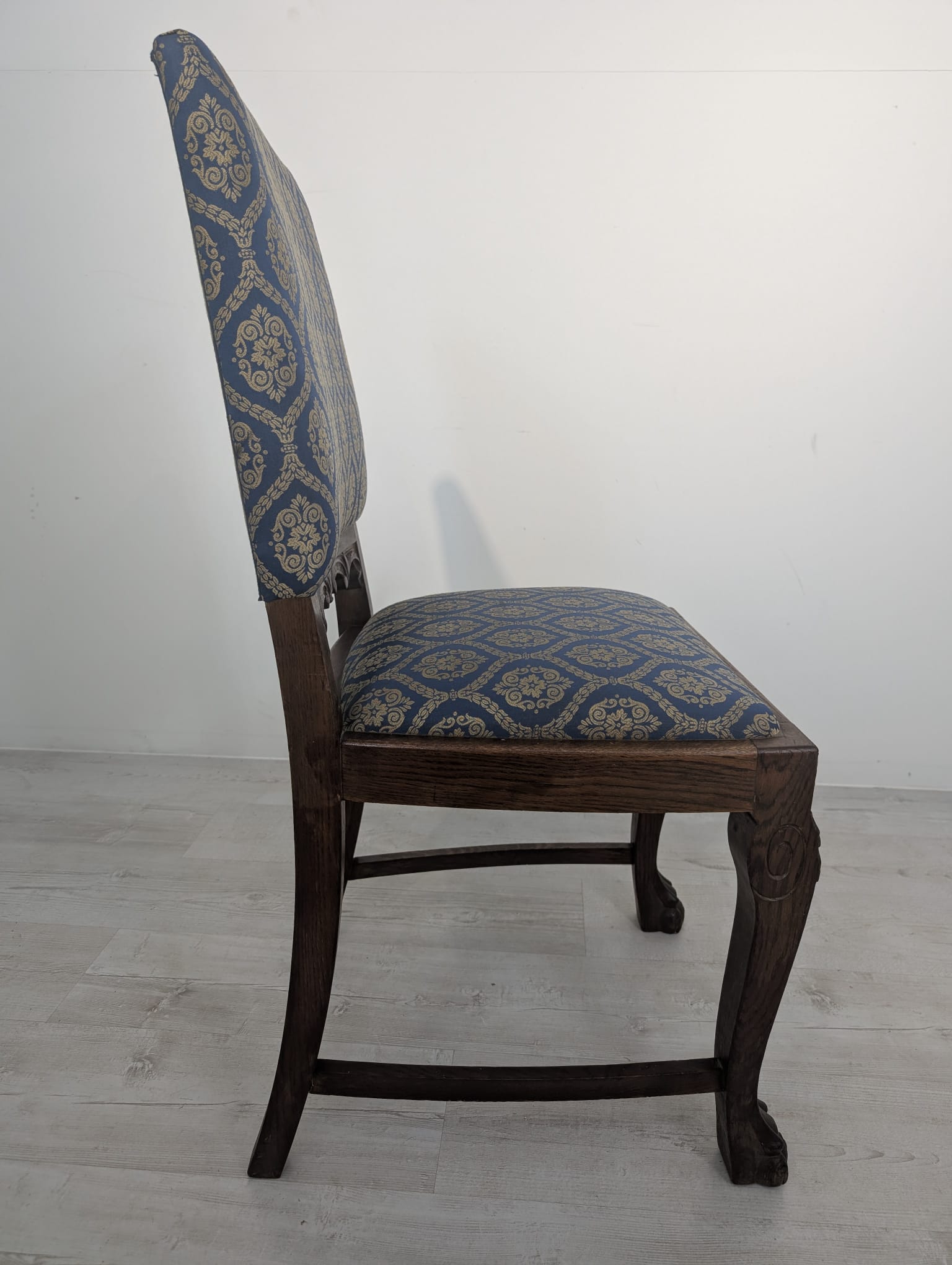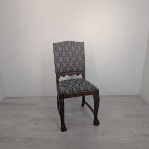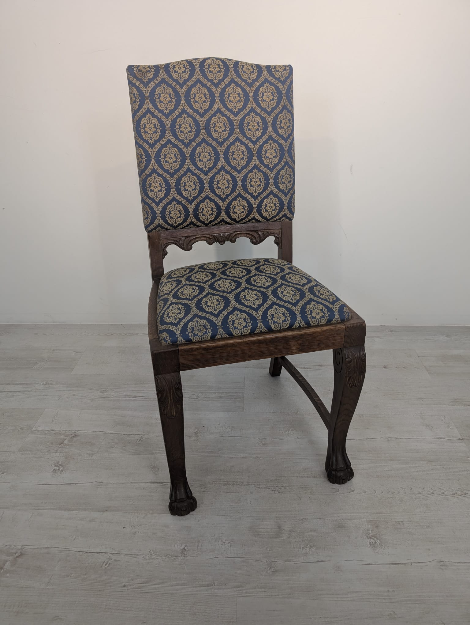Solidne krzesło z drewna dębowego z rzeźbionymi zdobieniami w kształcie lwich łap z lat 20./30. XX wieku. Krzesło posiada piękny, stylowy wygląd i jest w dobrym stanie użytkowym.