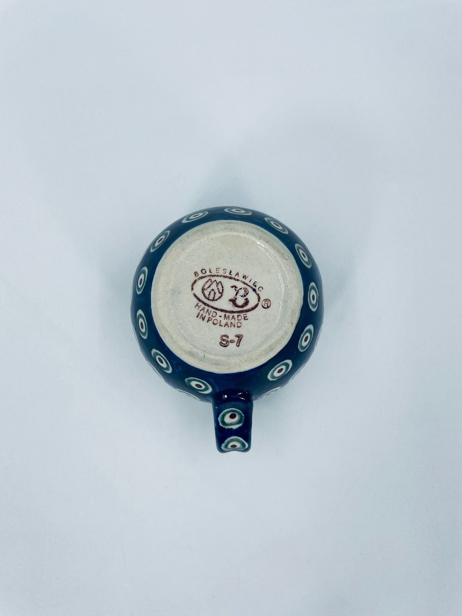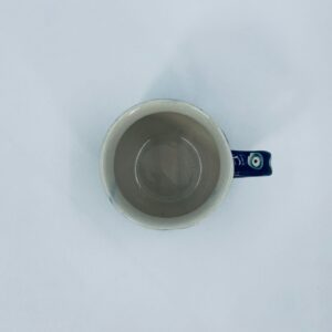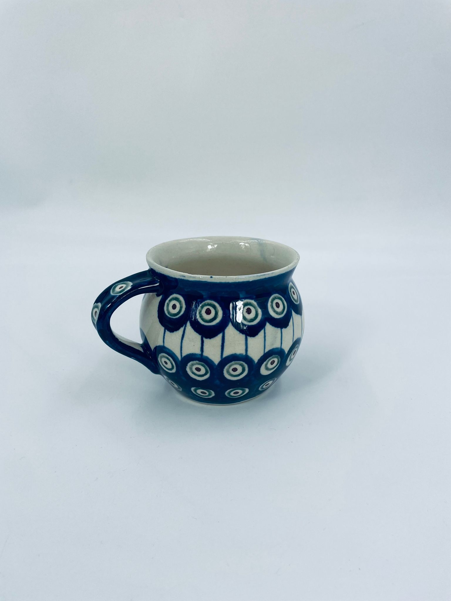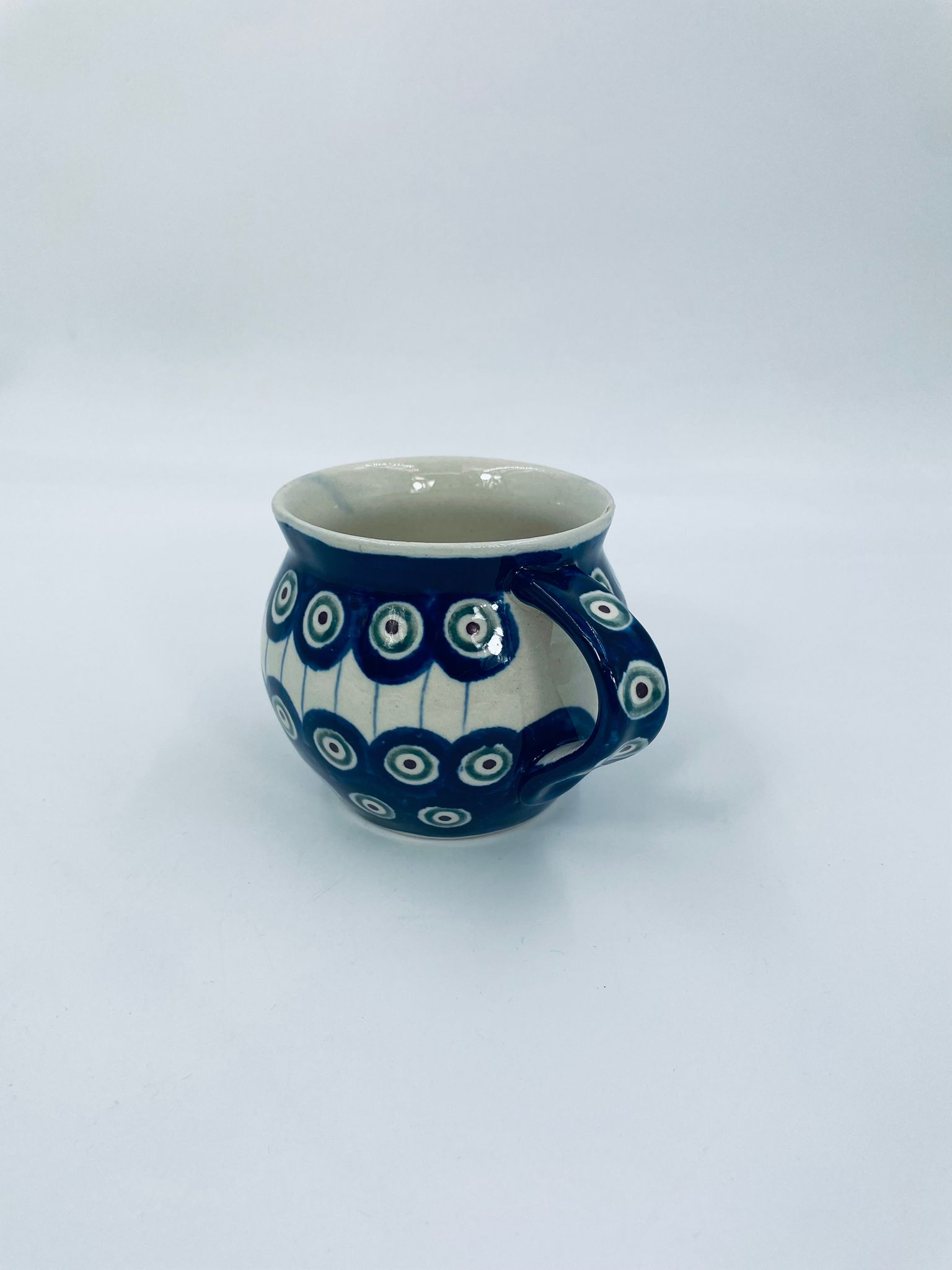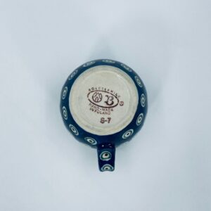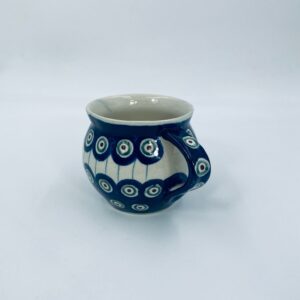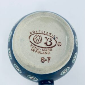 Kubek Polskiej wytwórni Bolesławiec, wykonany z najwyższej jakości ceramiki. Kubeczek w beczułkowatym kształcie , ręcznie robiony, ozdobiony jest ręcznie malowanym, tradycyjnym wzorem pawiego oczka. Wzory na Bolesławieckiej ceramice naniesione są metodą stempelkową oraz pędzlem. Posiada mały uszczerbek na górnym rancie.
