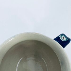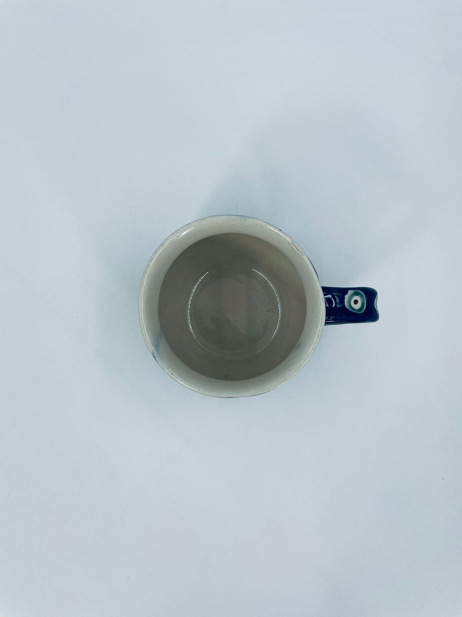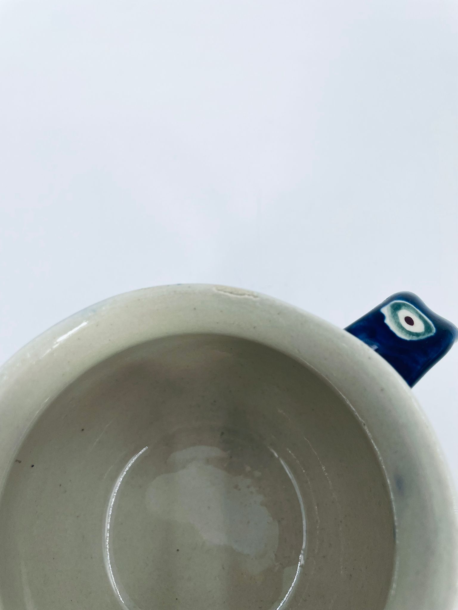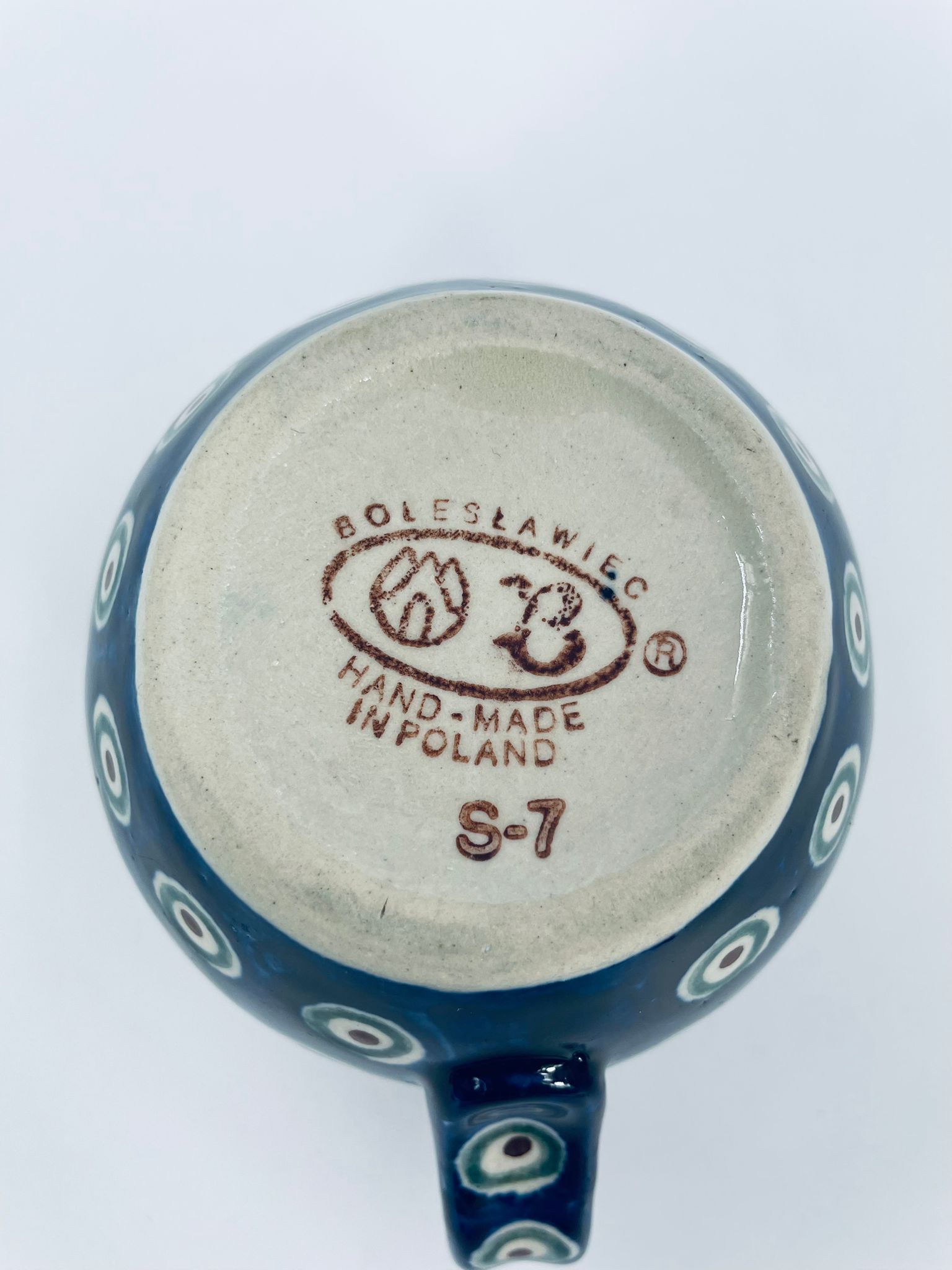 Kubek Polskiej wytwórni Bolesławiec, wykonany z najwyższej jakości ceramiki. Kubeczek w beczułkowatym kształcie , ręcznie robiony, ozdobiony jest ręcznie malowanym, tradycyjnym wzorem pawiego oczka. Wzory na Bolesławieckiej ceramice naniesione są metodą stempelkową oraz pędzlem. Posiada mały uszczerbek na górnym rancie.