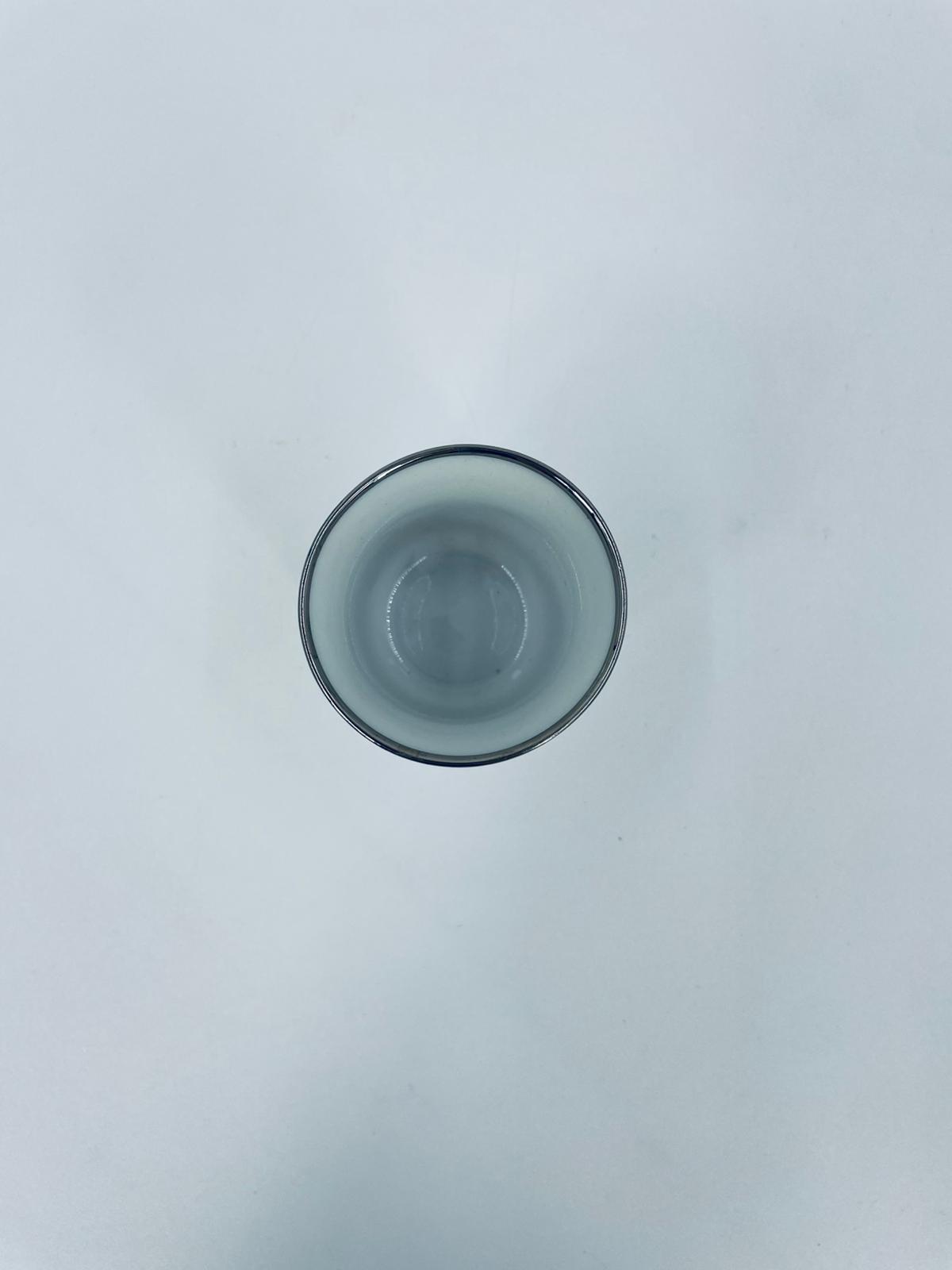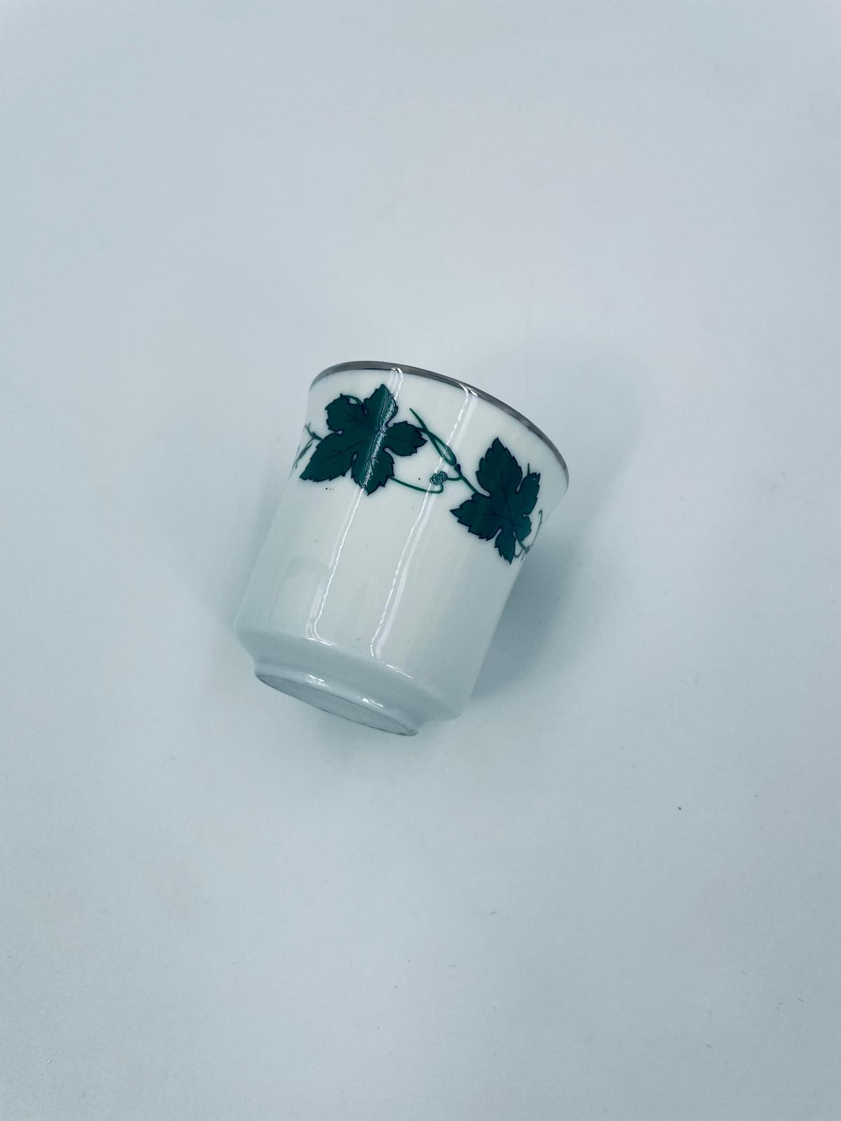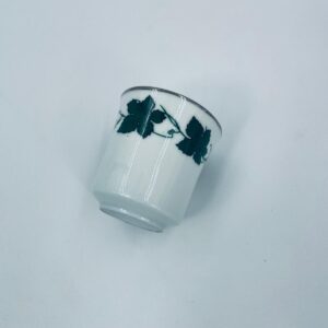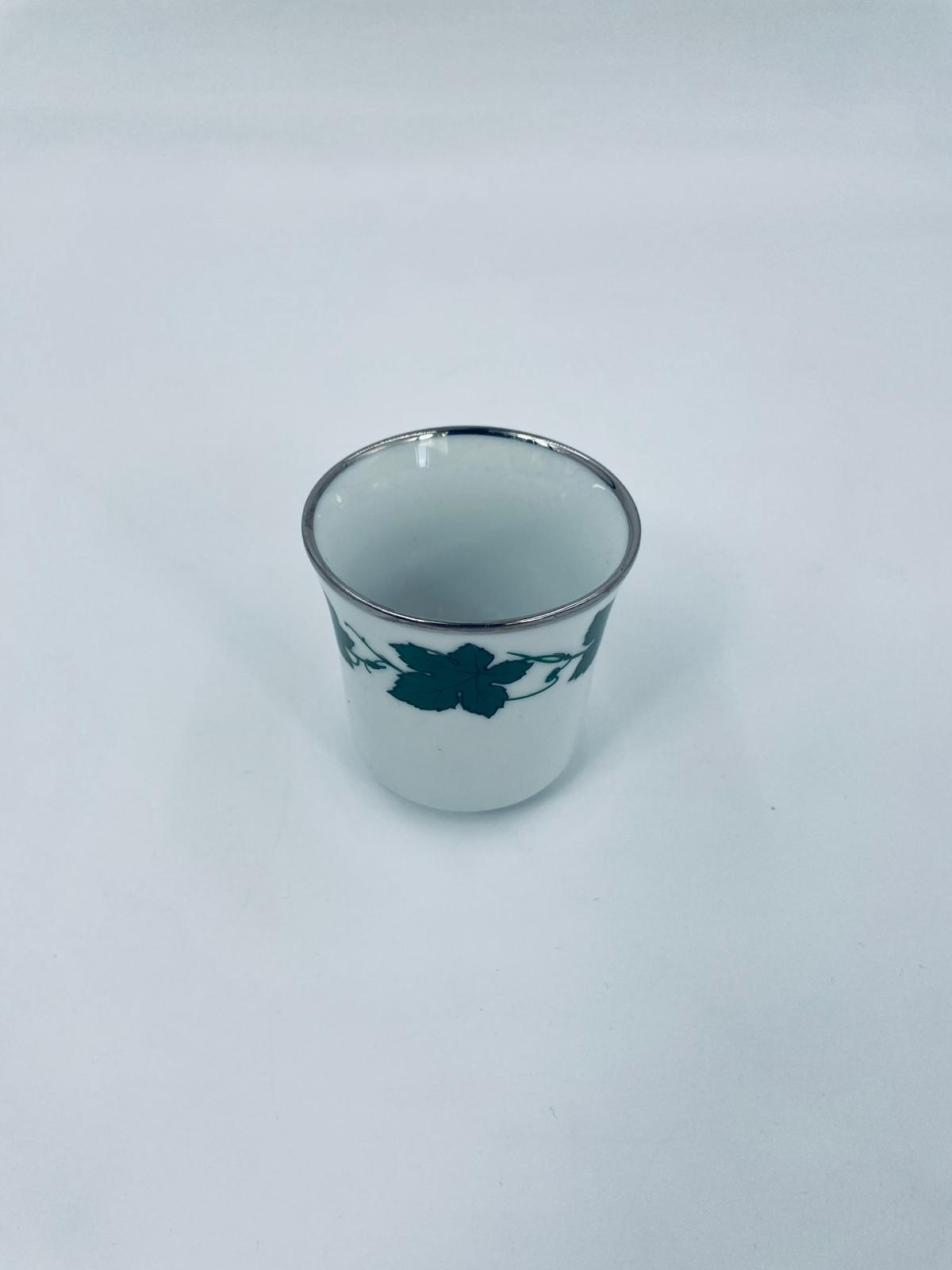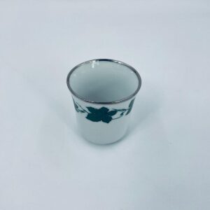 Mały kubek wytwórni Bareuther Waldsassen, wykonany z wysokiej jakości białej porcelany. Charakteryzuje się klasycznym kształtem i elegancką dekoracją przedstawiającą duże zielone liście winogron, oplatające górna część naczynia, wykończony kolorem srebrnym na rancie.