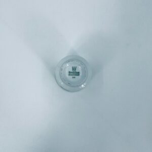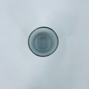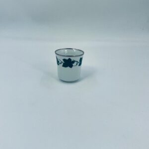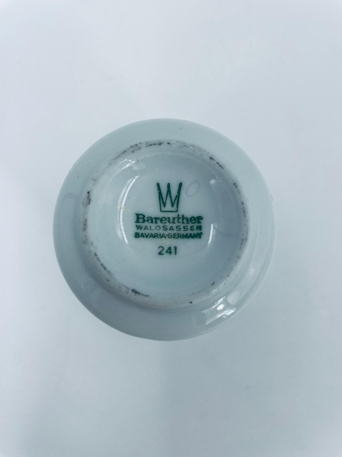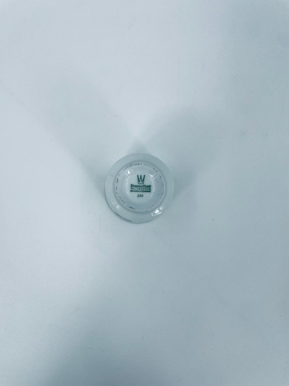 Mały kubek wytwórni Bareuther Waldsassen, wykonany z wysokiej jakości białej porcelany. Charakteryzuje się klasycznym kształtem i elegancką dekoracją przedstawiającą duże zielone liście winogron, oplatające górna część naczynia, wykończony kolorem srebrnym na rancie.