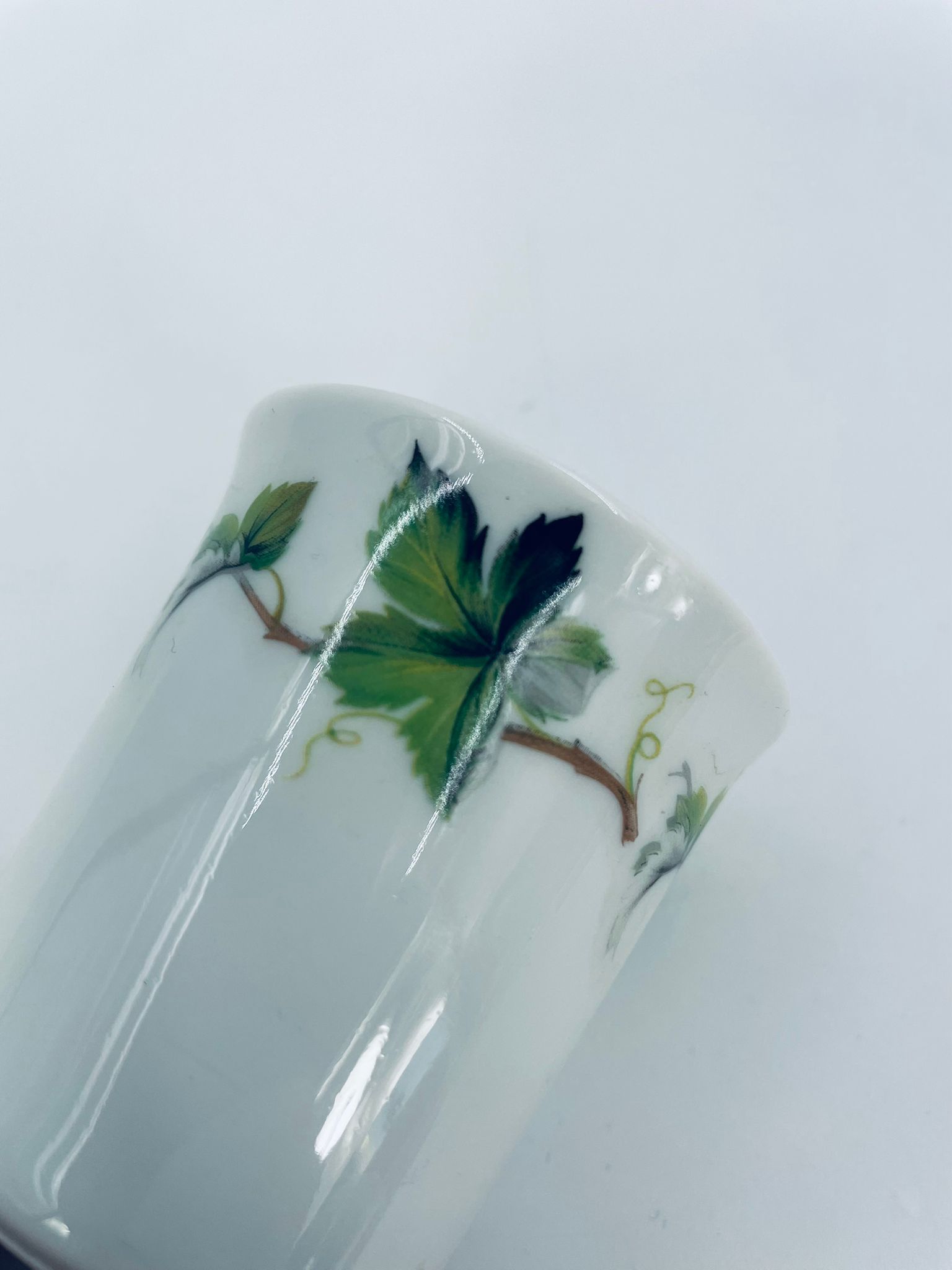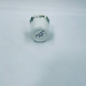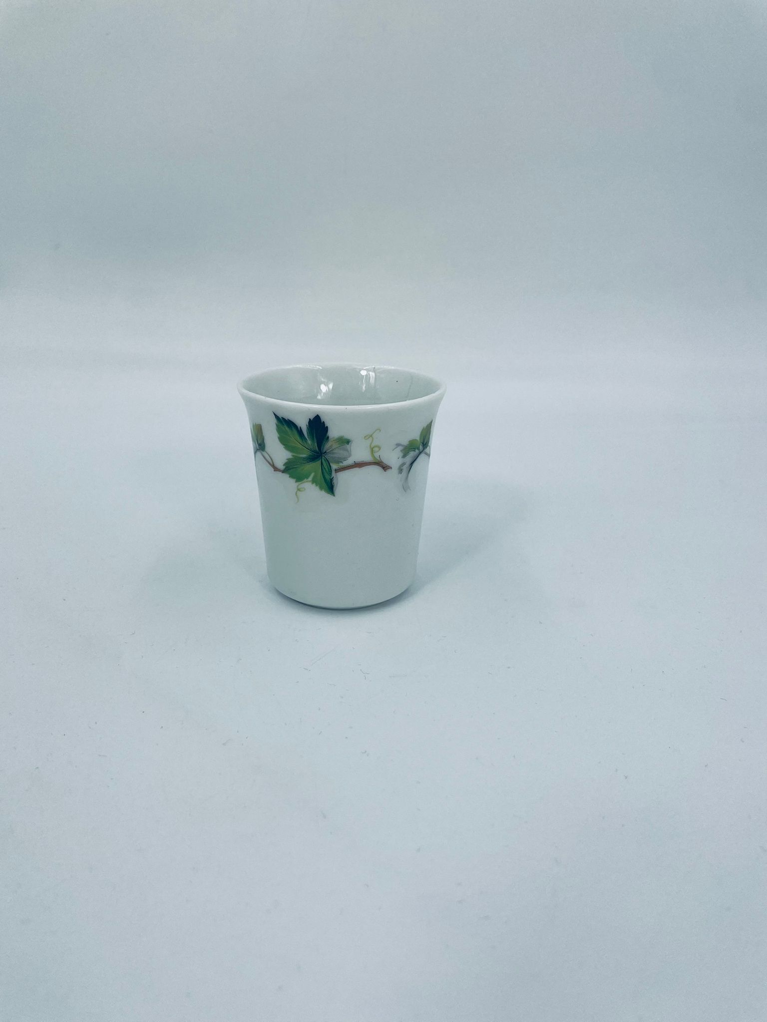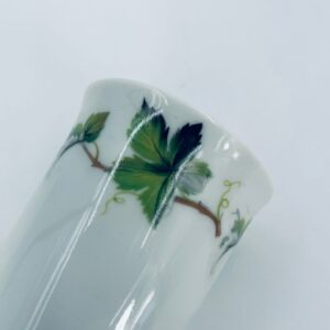 Mały kubek wytwórni Schwarzenhammer, wykonany z wysokiej jakości białej porcelany. Charakteryzuje się klasycznym kształtem i elegancką dekoracją przedstawiającą zielone liście na gałązkach, oplatające górna część naczynia.
