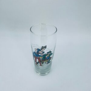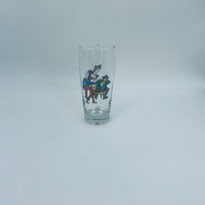 Zabytkowy kufel do piwa w stylu Vintage, wykonany z wysokiej jakości grubszego szkła przezroczystego, z grubszą podstawą. Na kuflu widnieje humorystyczny obrazek przedstawiający kobietę i mężczyznę. Posiada przetarcia na złoceniu na górnym rancie.