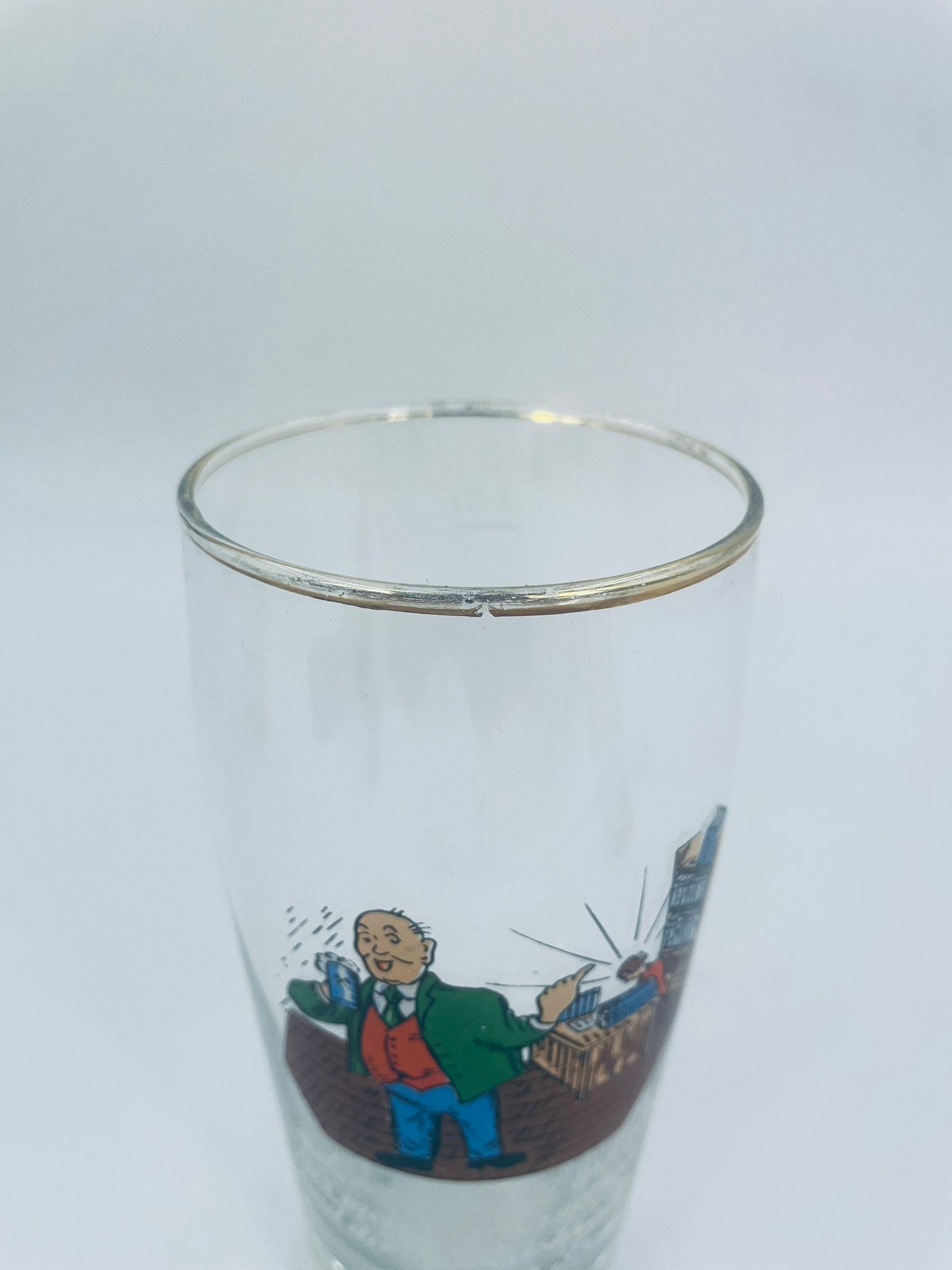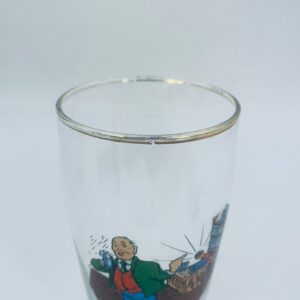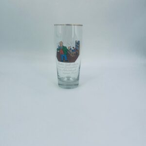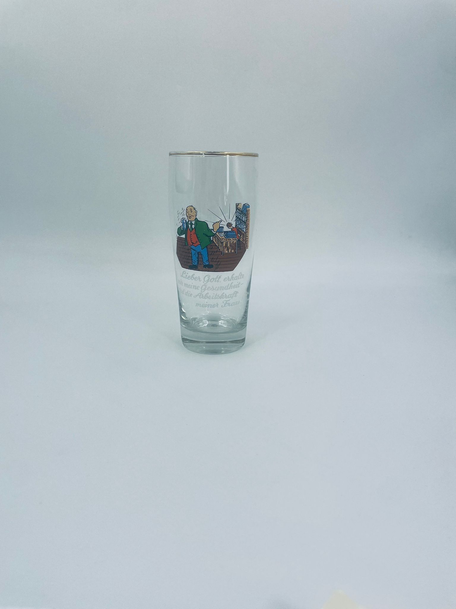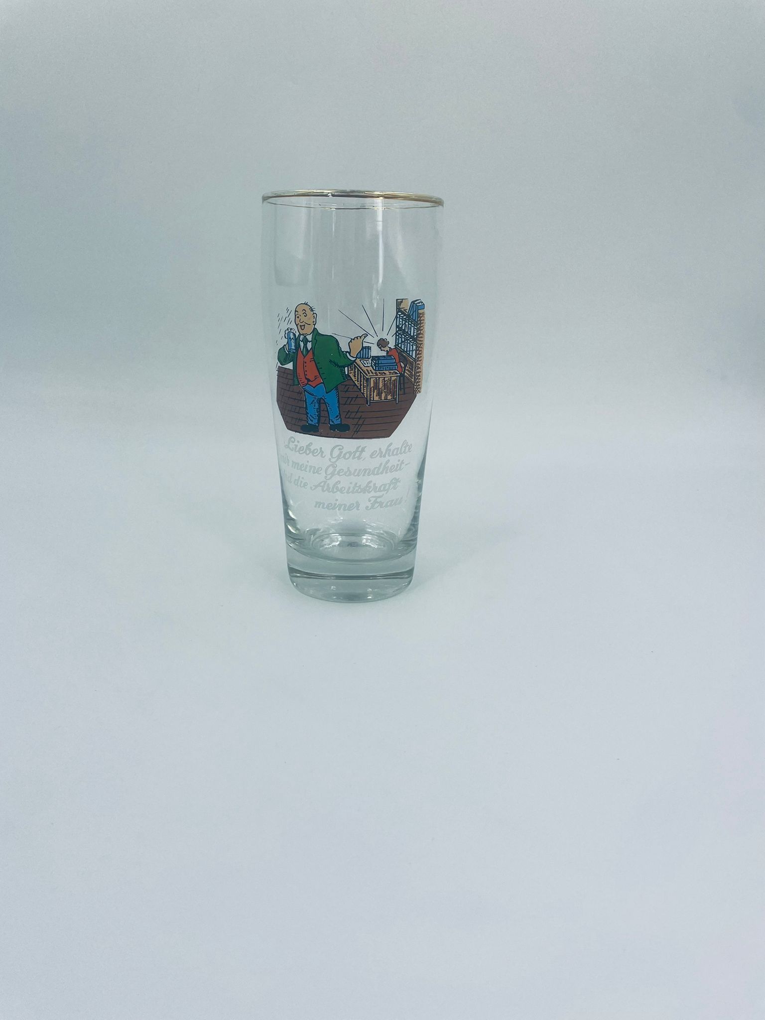 Zabytkowy kufel do piwa w stylu Vintage, wykonany z wysokiej jakości grubszego szkła przezroczystego, z grubszą podstawą. Na kuflu widnieje humorystyczny obrazek przedstawiający mężczyznę pijącego piwo i kobietę, pracaujaca, siedzącą przy biurku. Posiada przetarcia na złoceniu na górnym rancie.