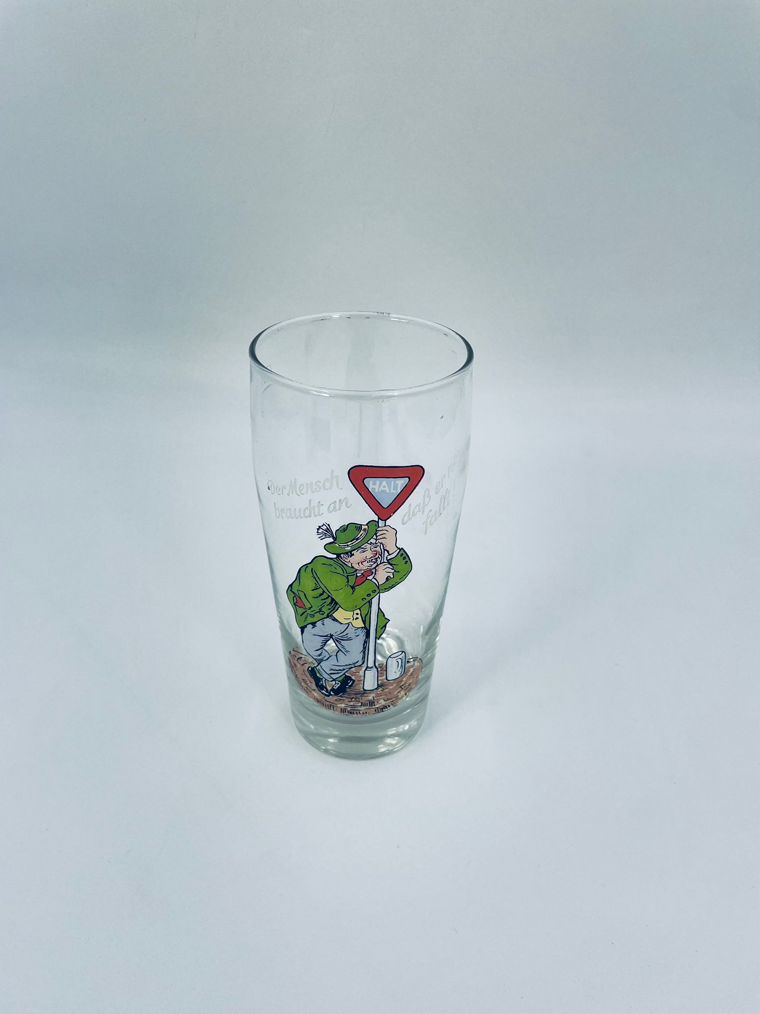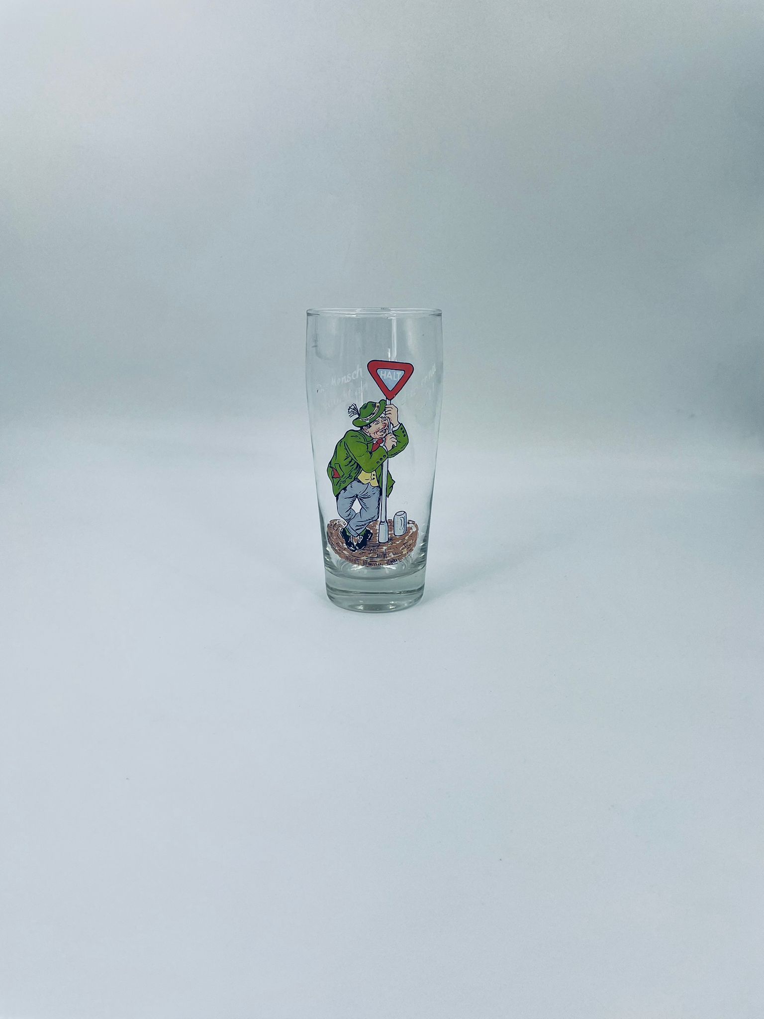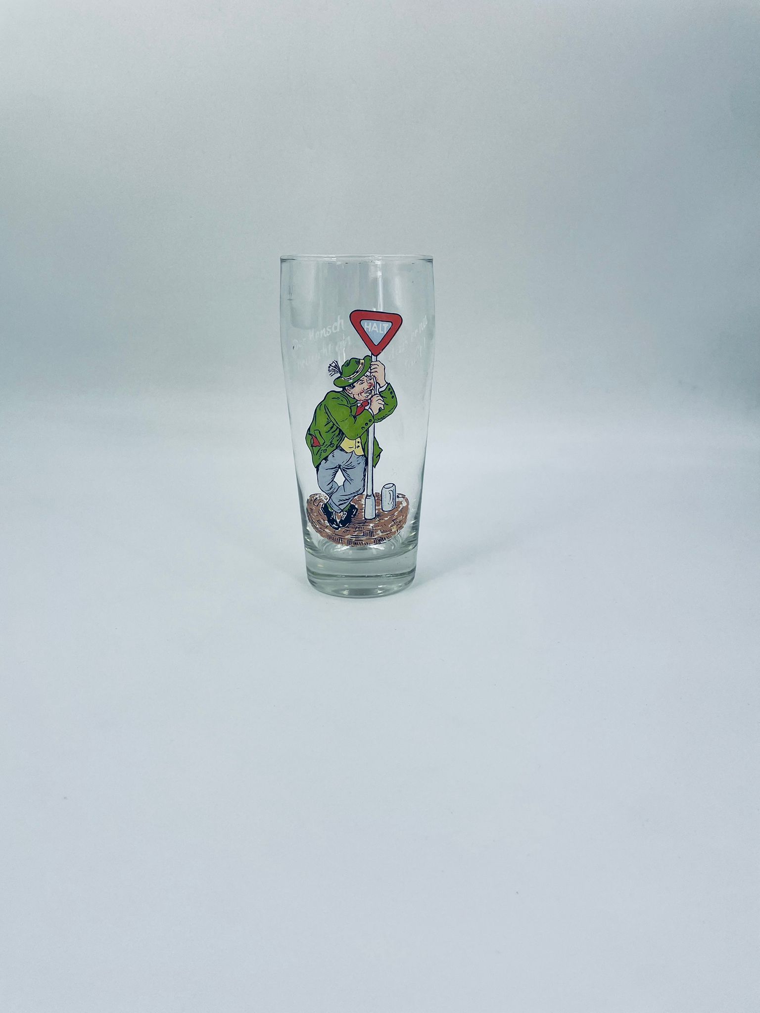 Zabytkowy kufel do piwa w stylu Vintage, wykonany z wysokiej jakości grubszego szkła przezroczystego, z grubszą podstawą. Na kuflu widnieje śmieszny obrazek, karykatura mężczyzny trzymającego znak z napisem „halt” (stop).