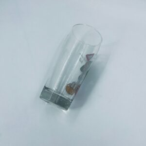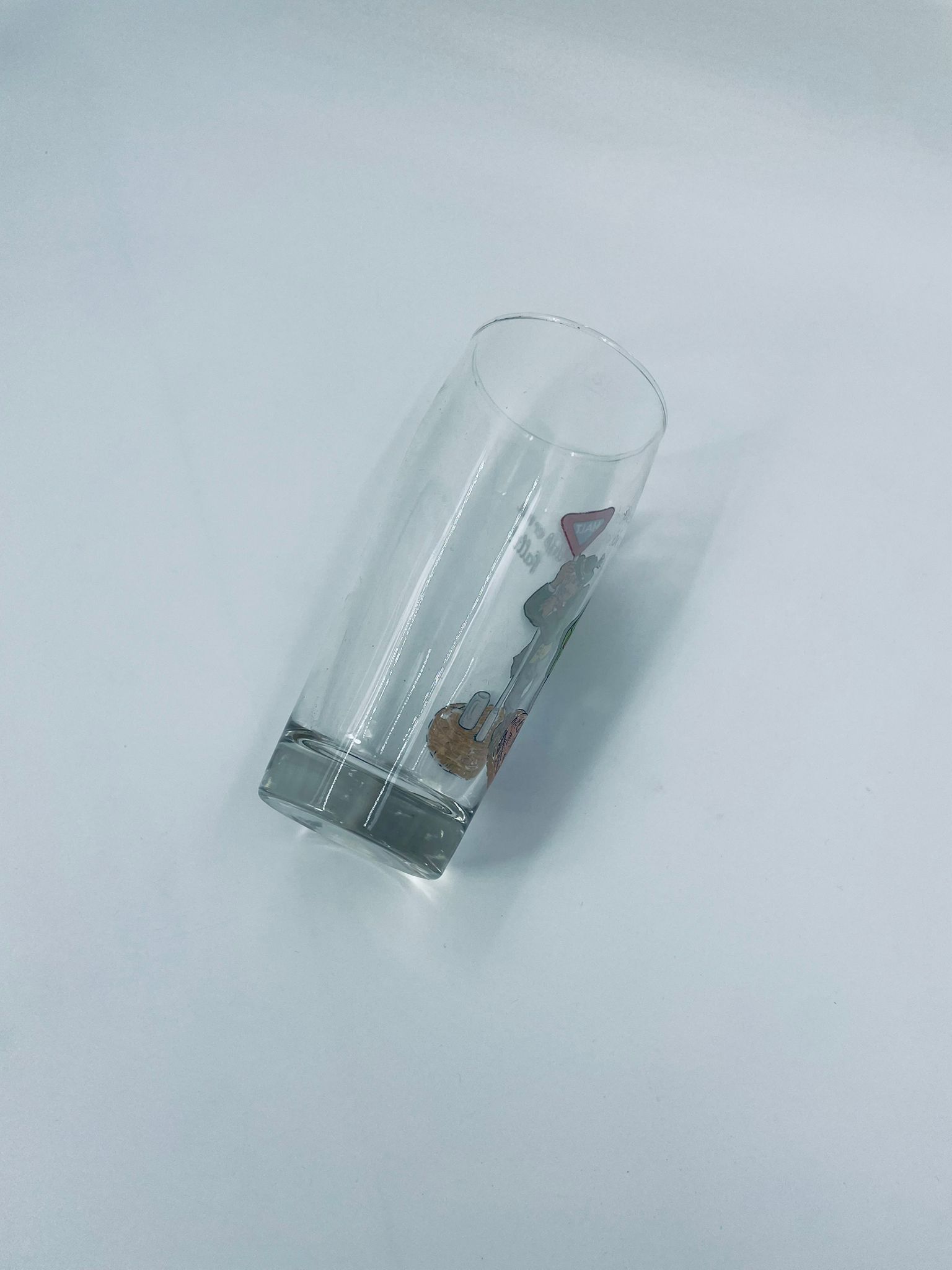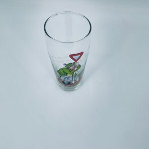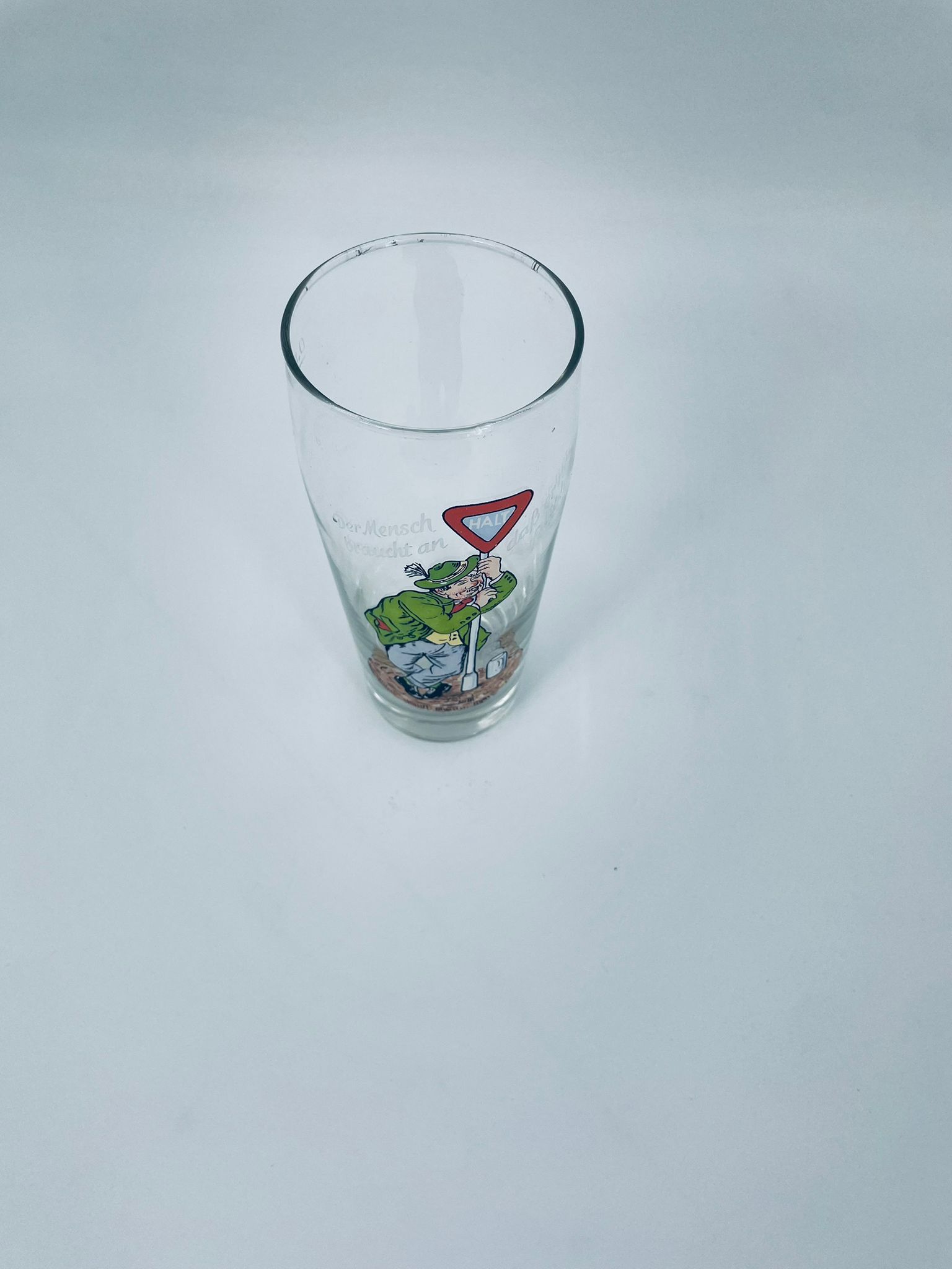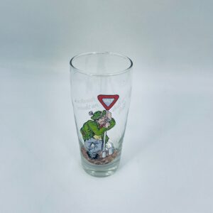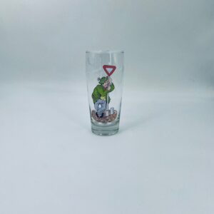 Zabytkowy kufel do piwa w stylu Vintage, wykonany z wysokiej jakości grubszego szkła przezroczystego, z grubszą podstawą. Na kuflu widnieje śmieszny obrazek, karykatura mężczyzny trzymającego znak z napisem „halt” (stop).