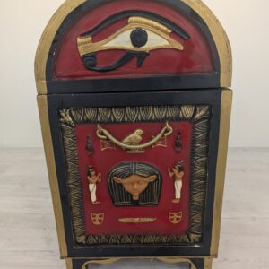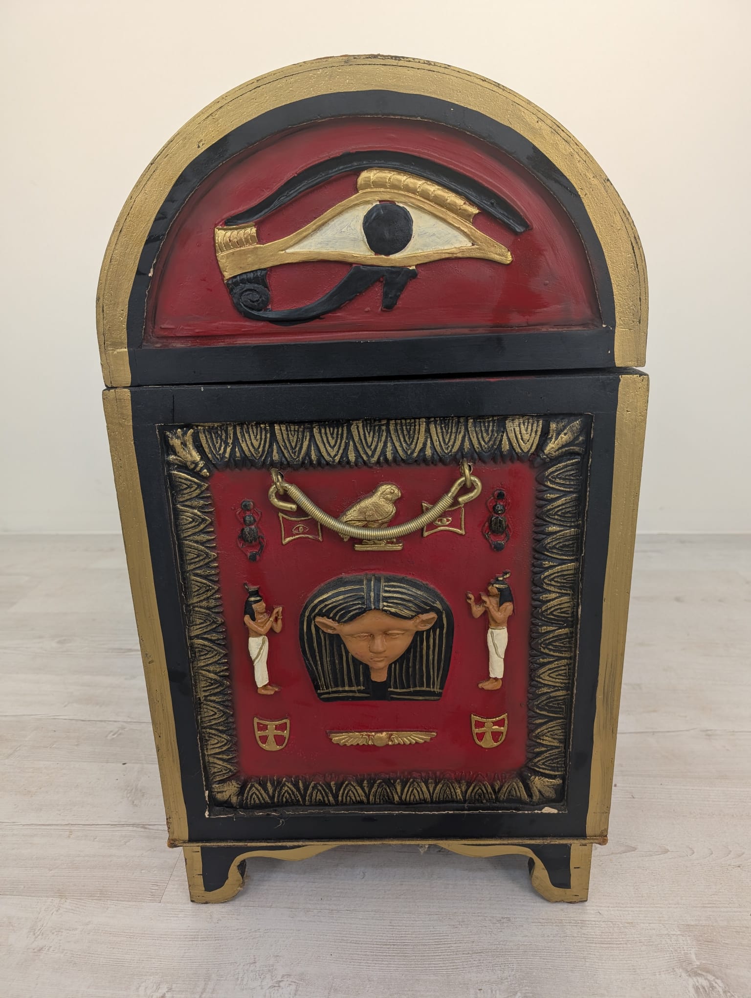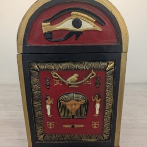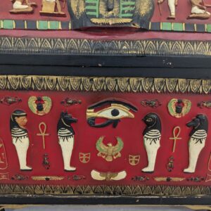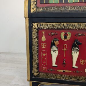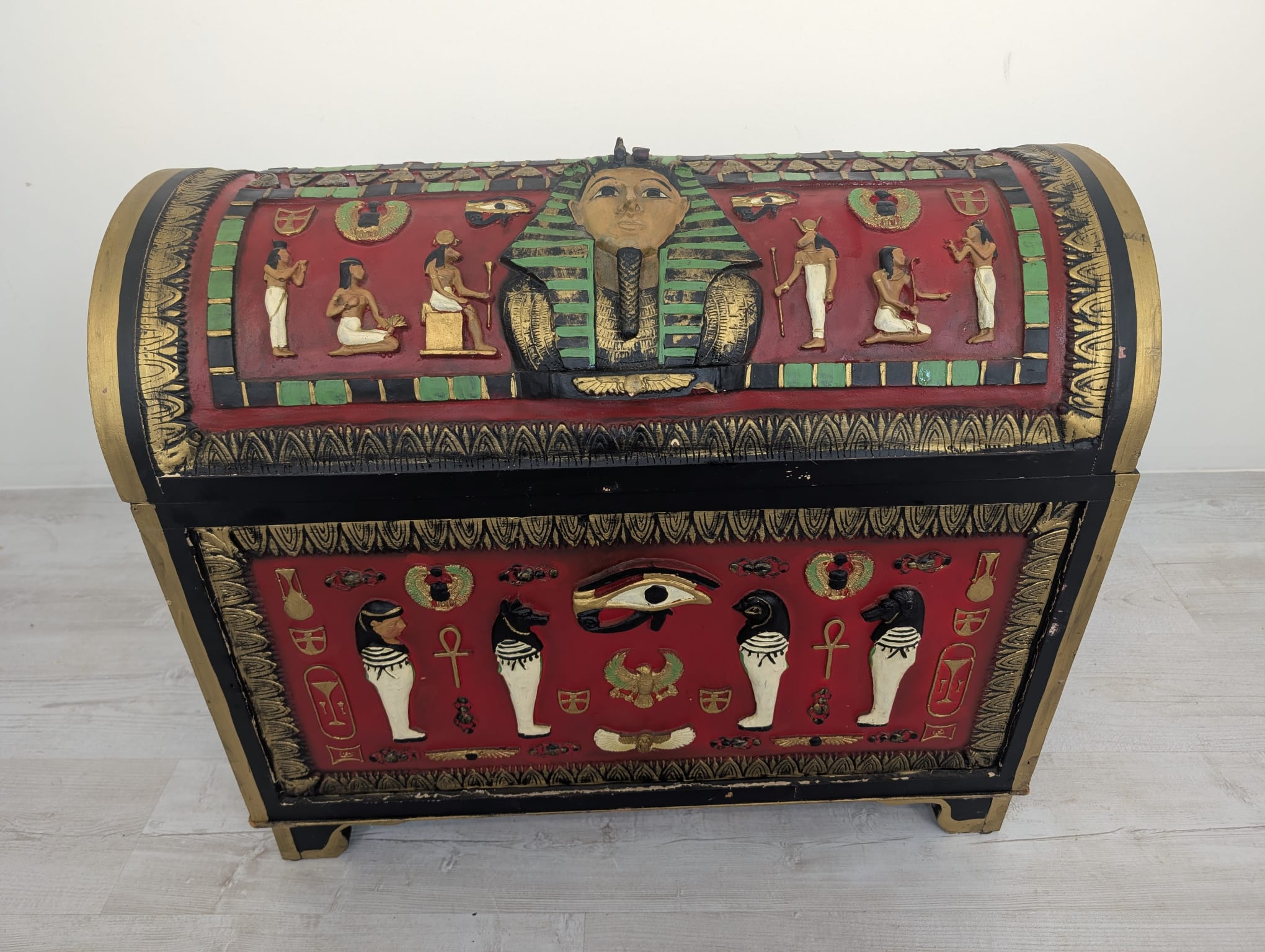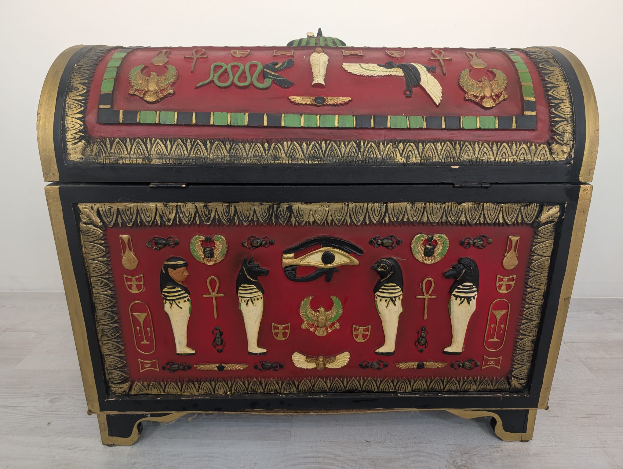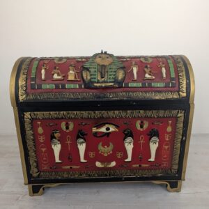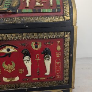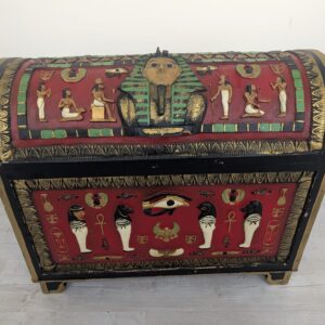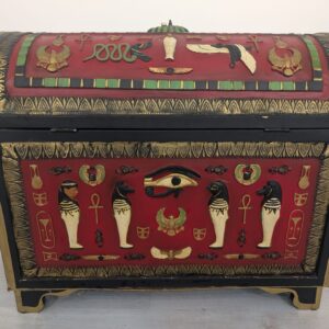 Przedstawiony na zdjęciu przedmiot to kufer lub skrzynia w stylu starożytnego Egiptu. Tego typu meble są często wykonane z drewna i ręcznie zdobione.