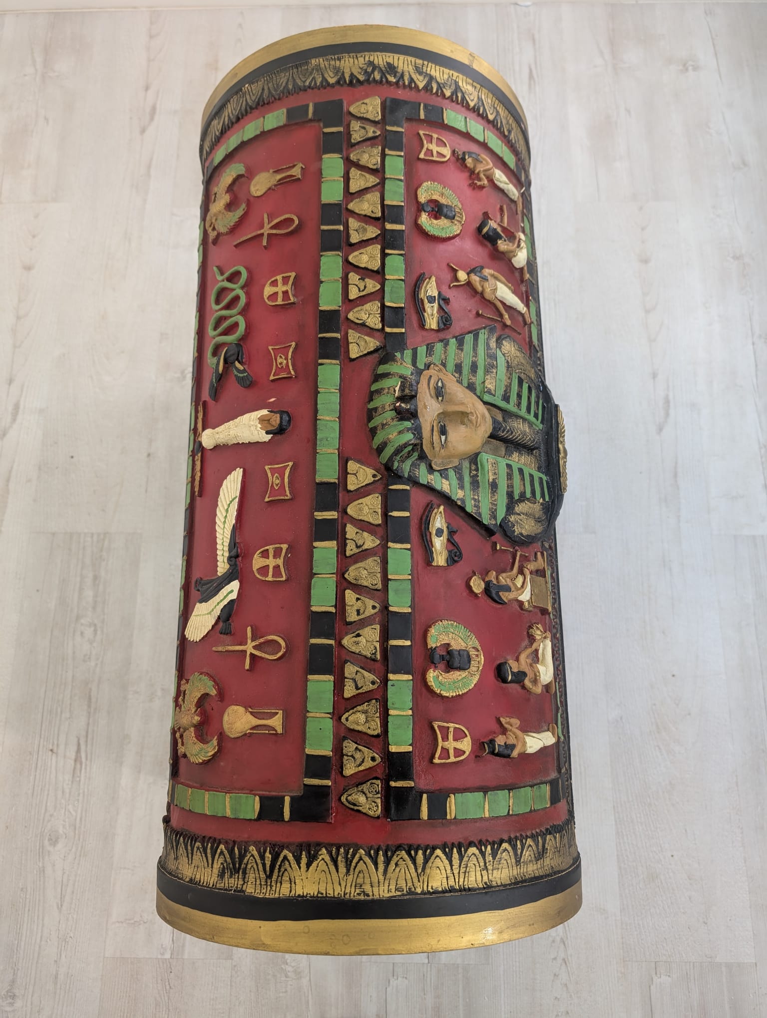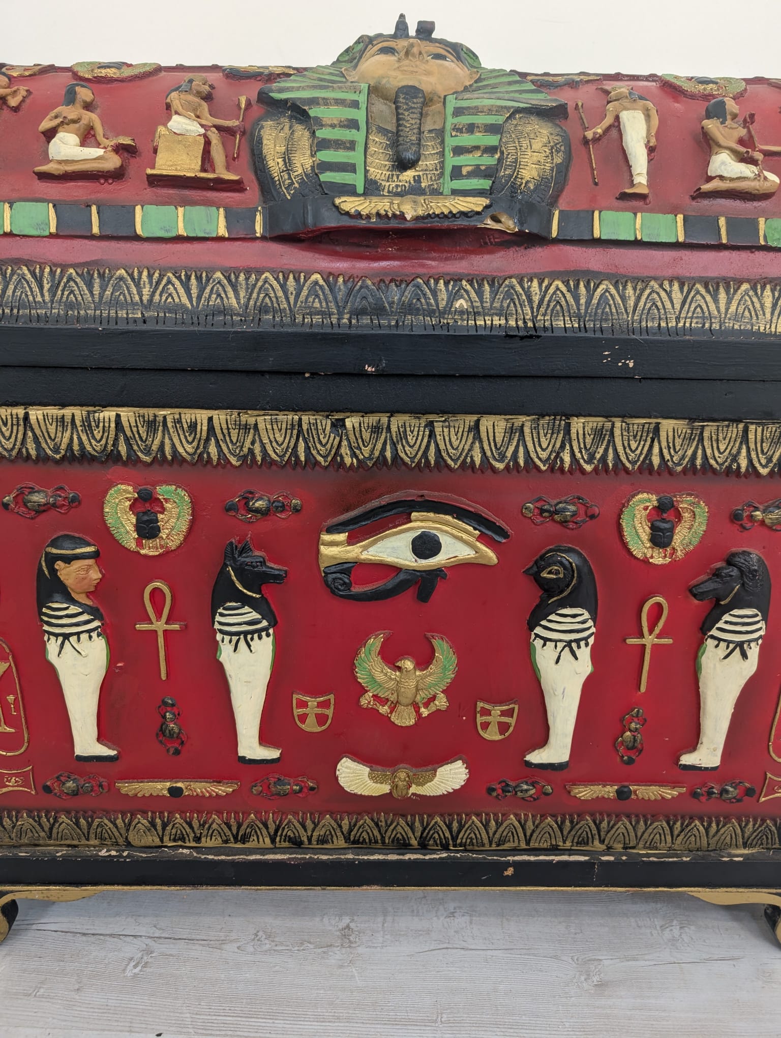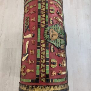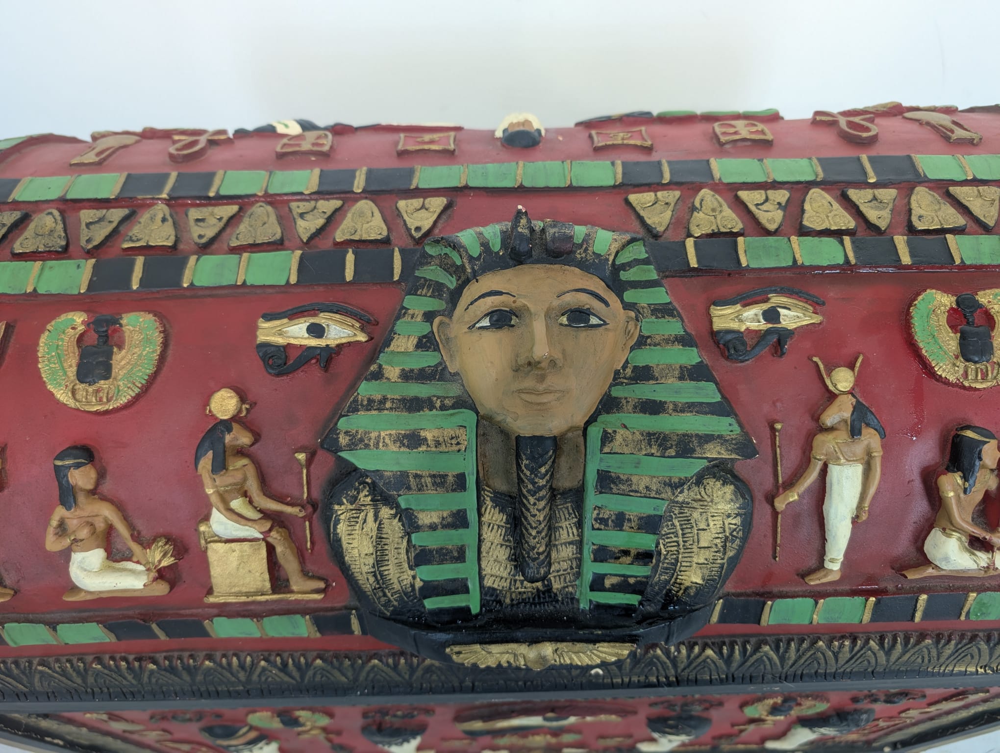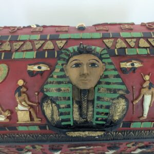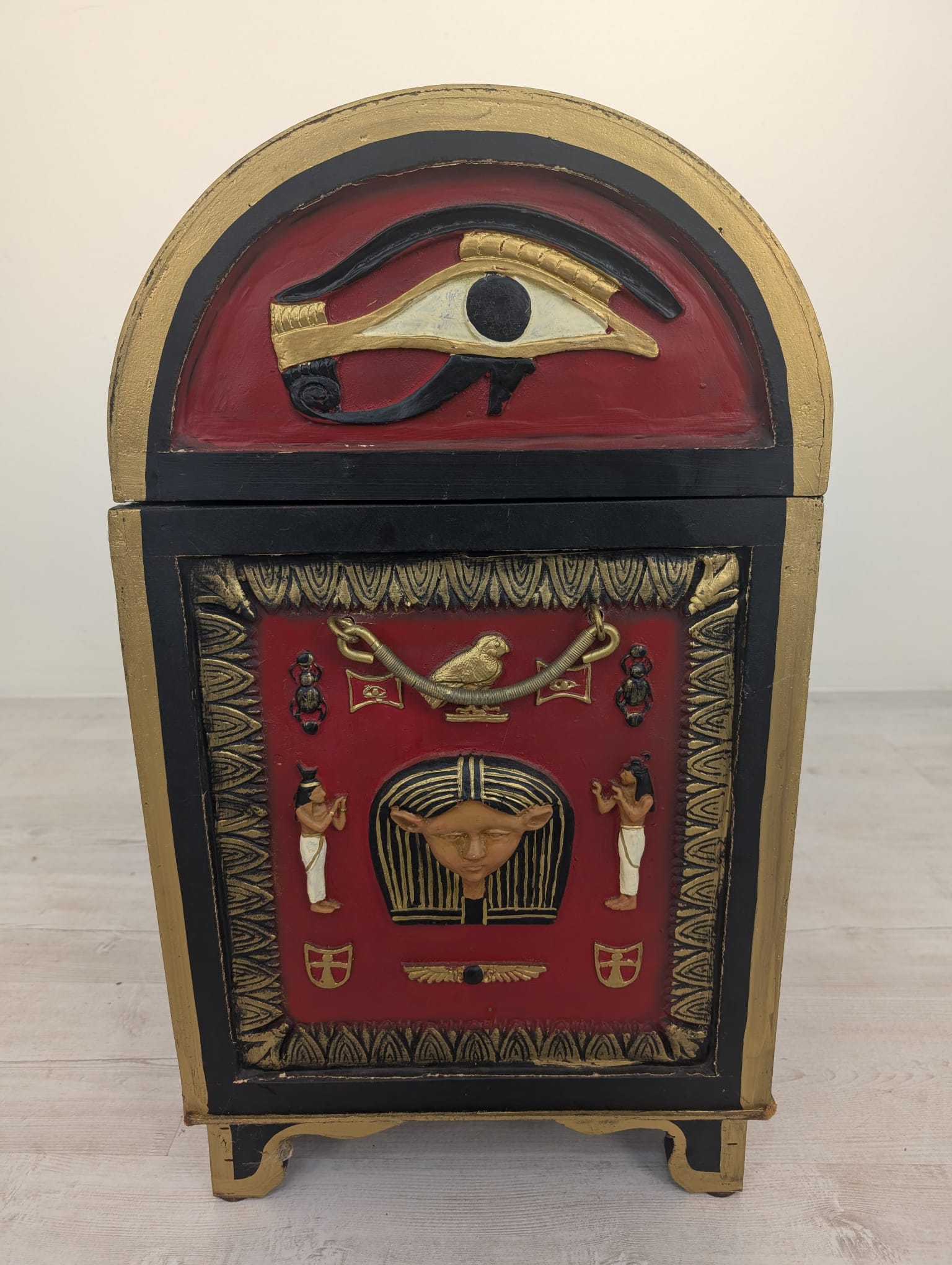 Przedstawiony na zdjęciu przedmiot to kufer lub skrzynia w stylu starożytnego Egiptu. Tego typu meble są często wykonane z drewna i ręcznie zdobione.