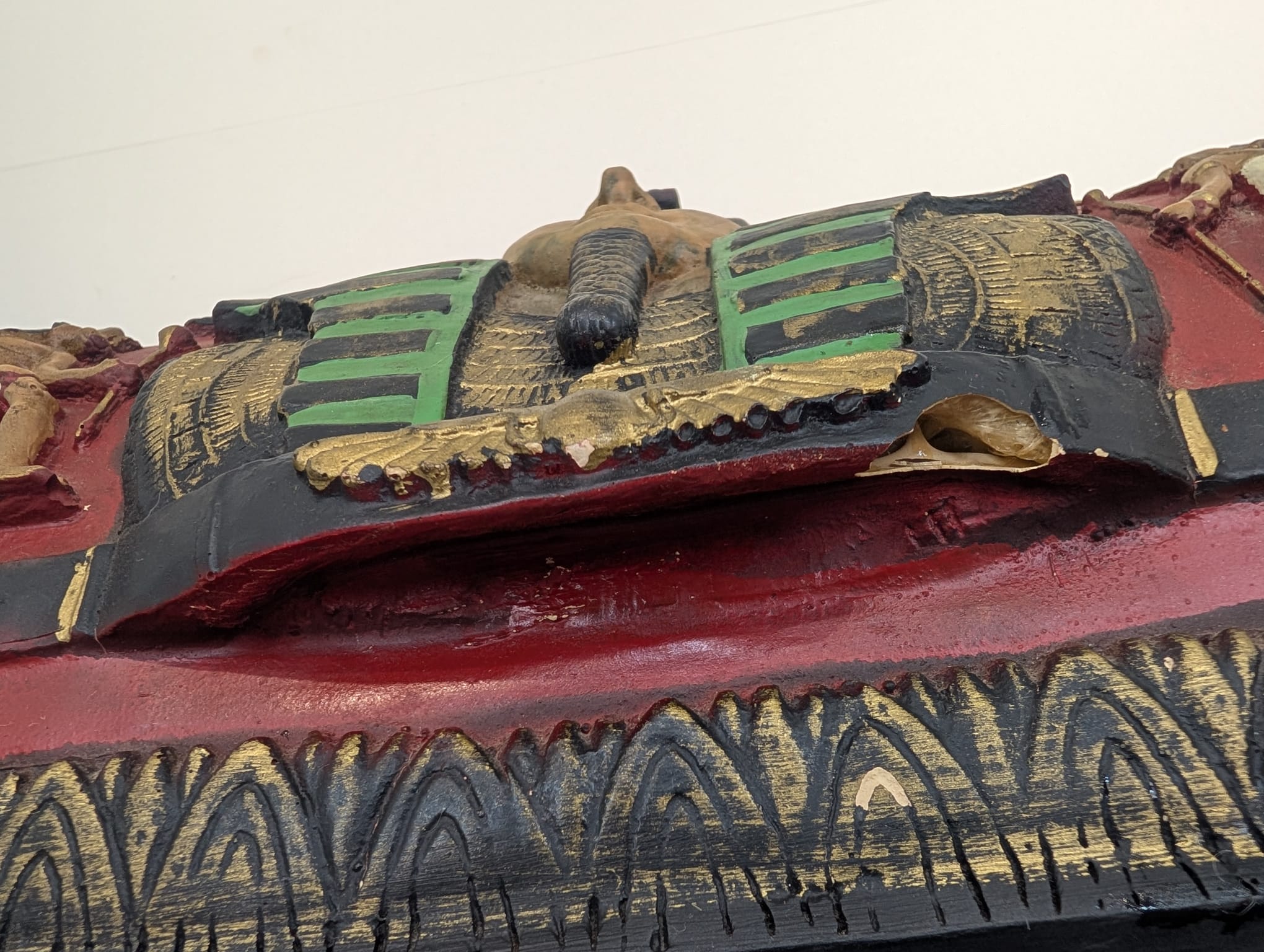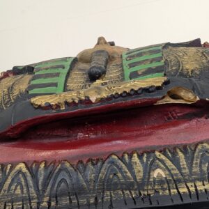 Na przodzie wieka widoczna jest stylizowana maska faraona, prawdopodobnie Tutenchamona.