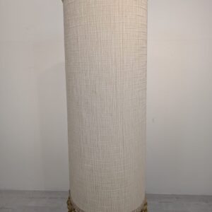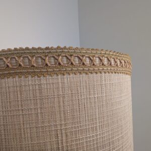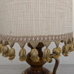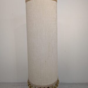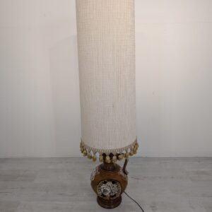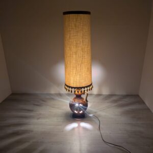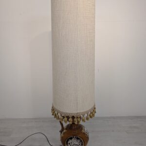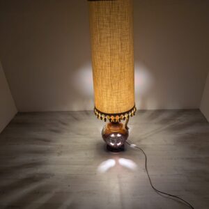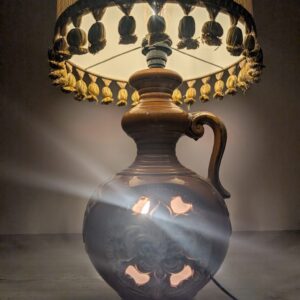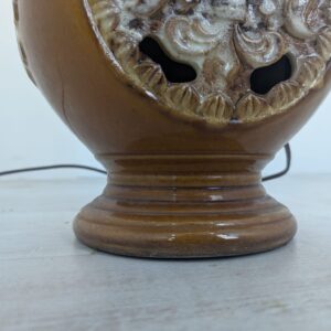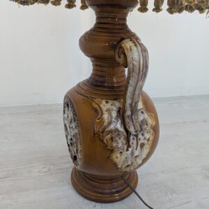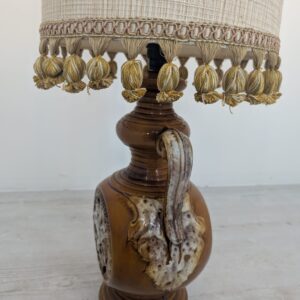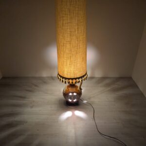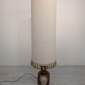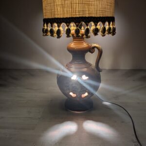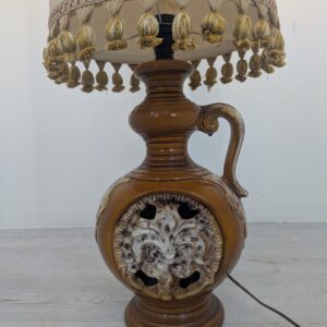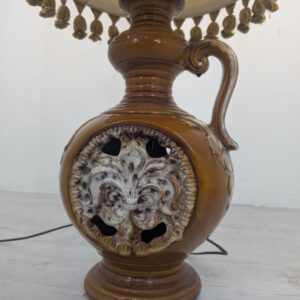 Stylowy, zabytkowy lampion ceramiczny z lat 60./70. XX wieku. Lampa posiada ozdobną podstawę w kolorze brązowym, a abażur wykonany jest z beżowego materiału. Całość nadaje przytulny i elegancki charakter pomieszczeniu.