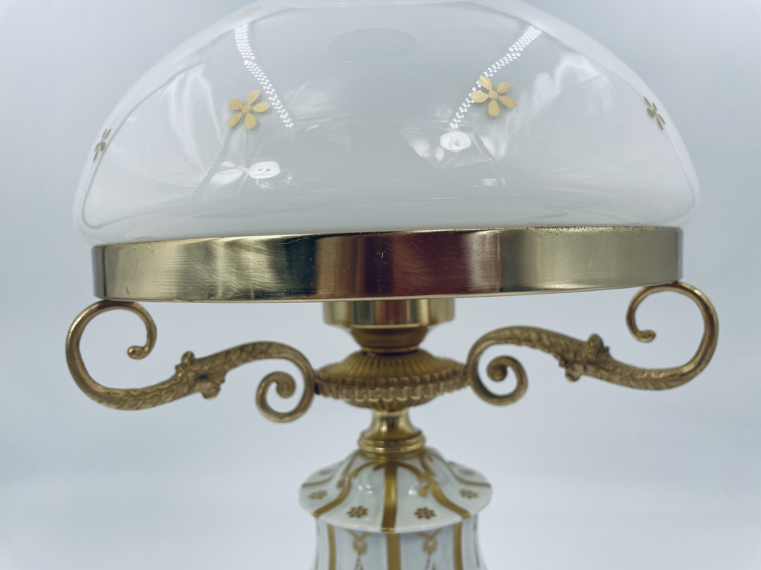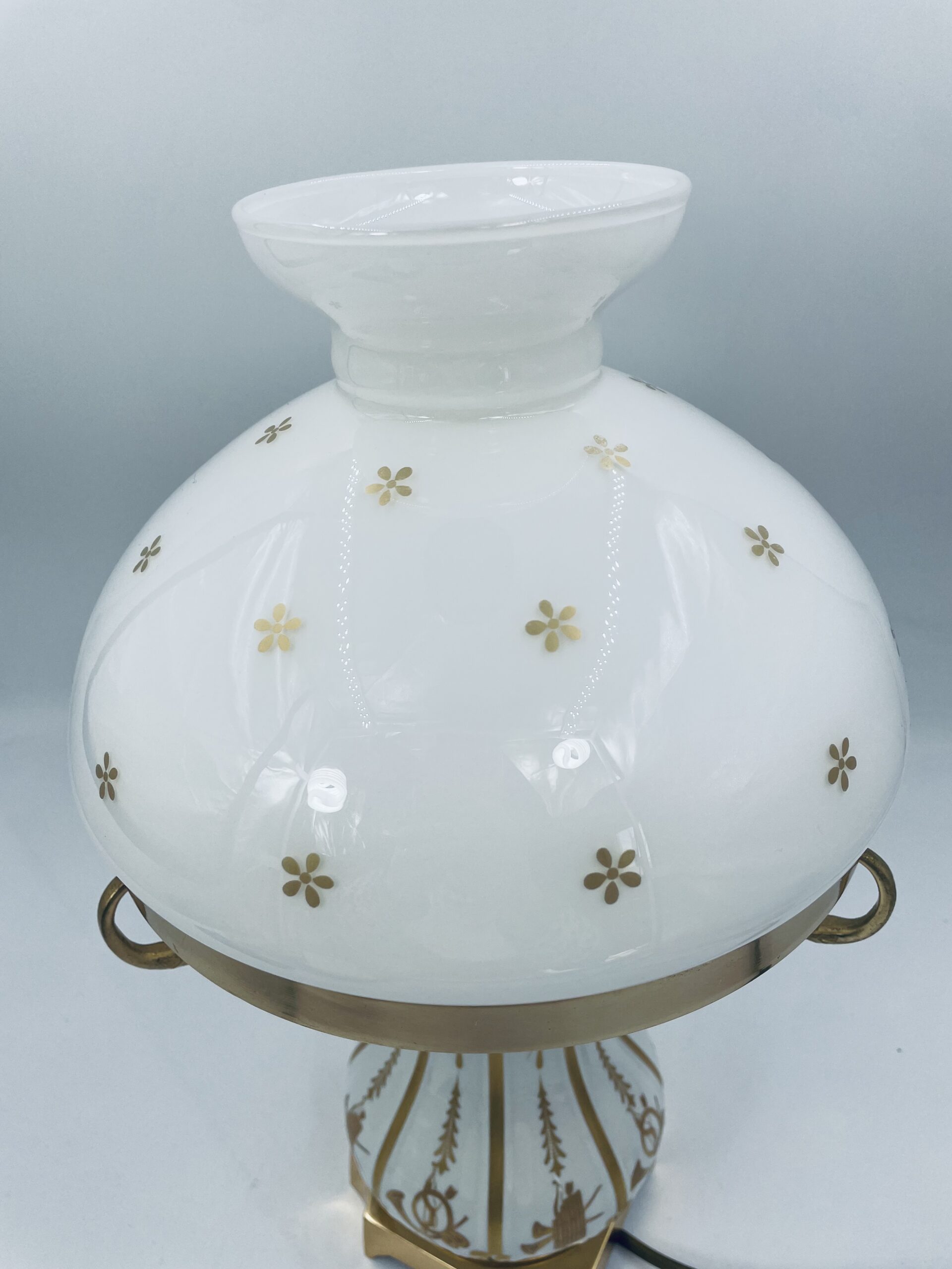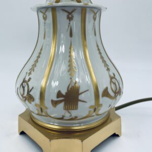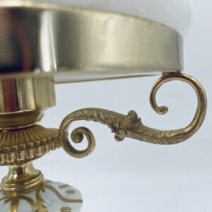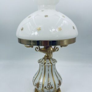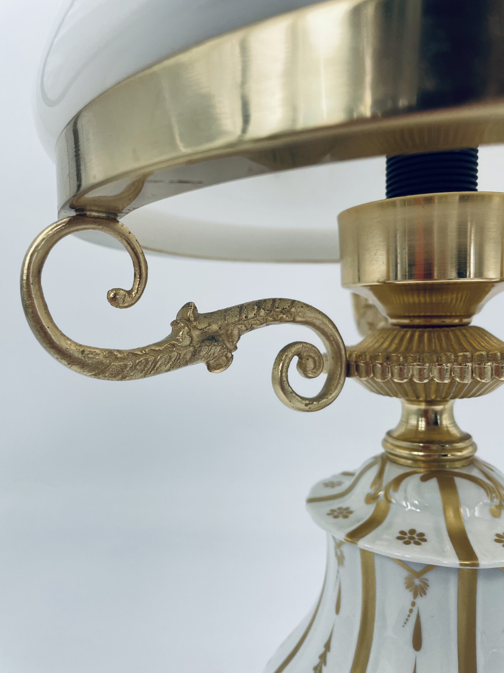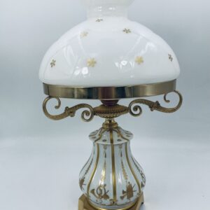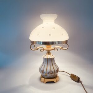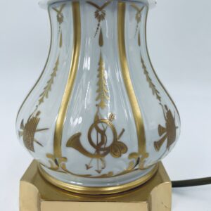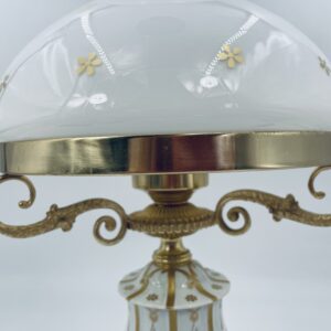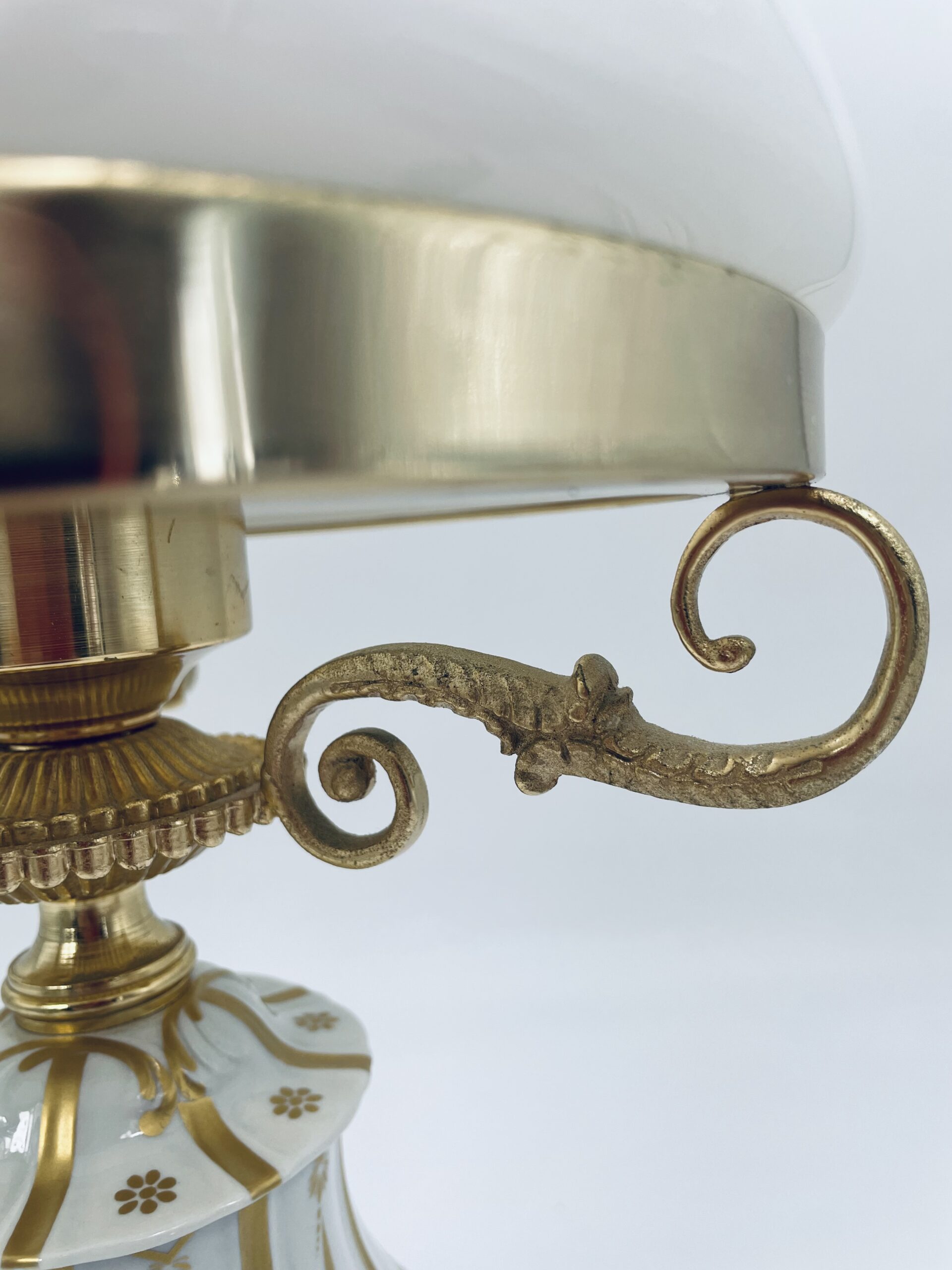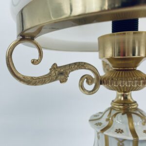 Piękna stylowa lampa porcelanowa złocona wykończona kloszem z mlecznego szkła oraz detalami z mosiądzu.
