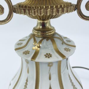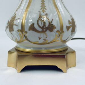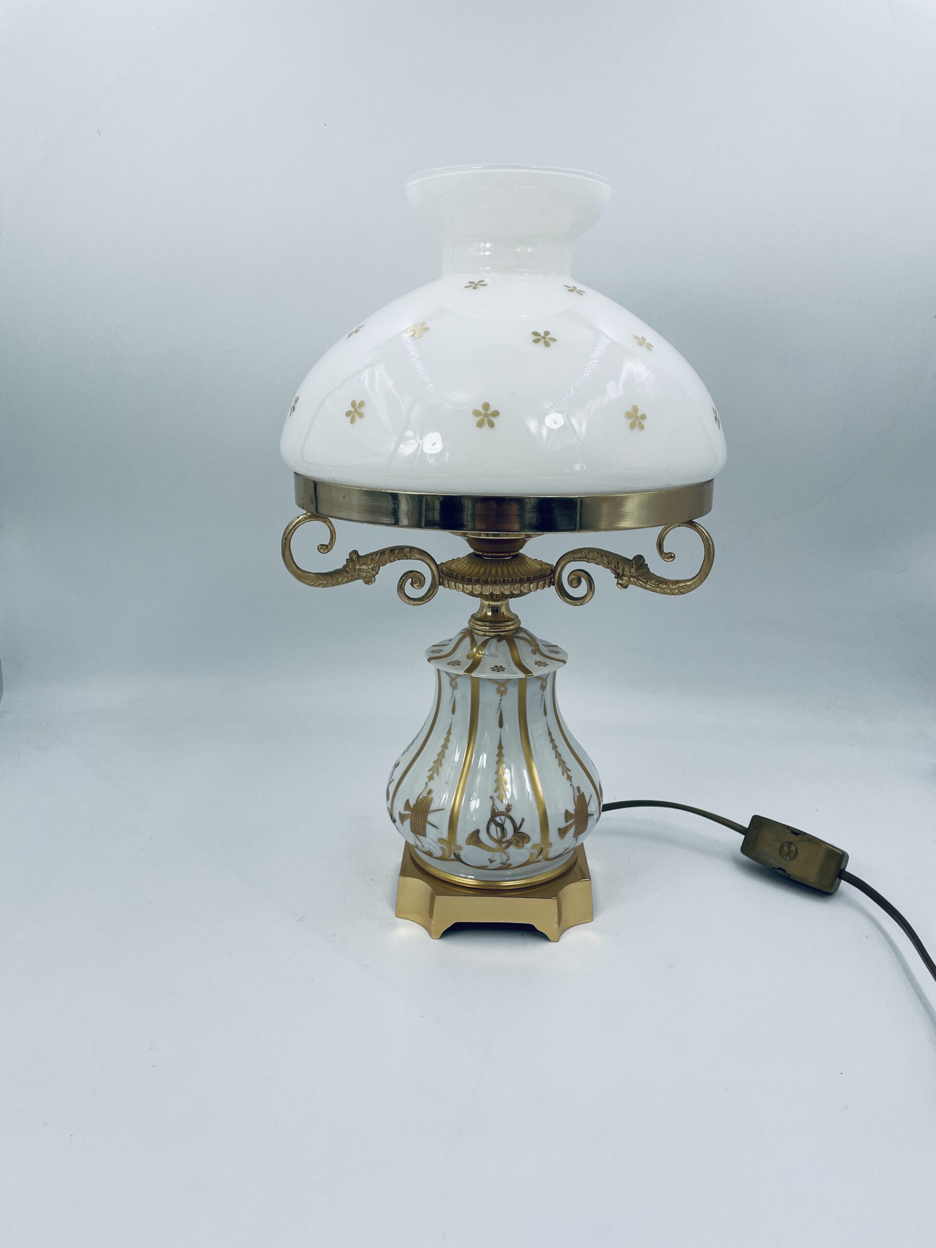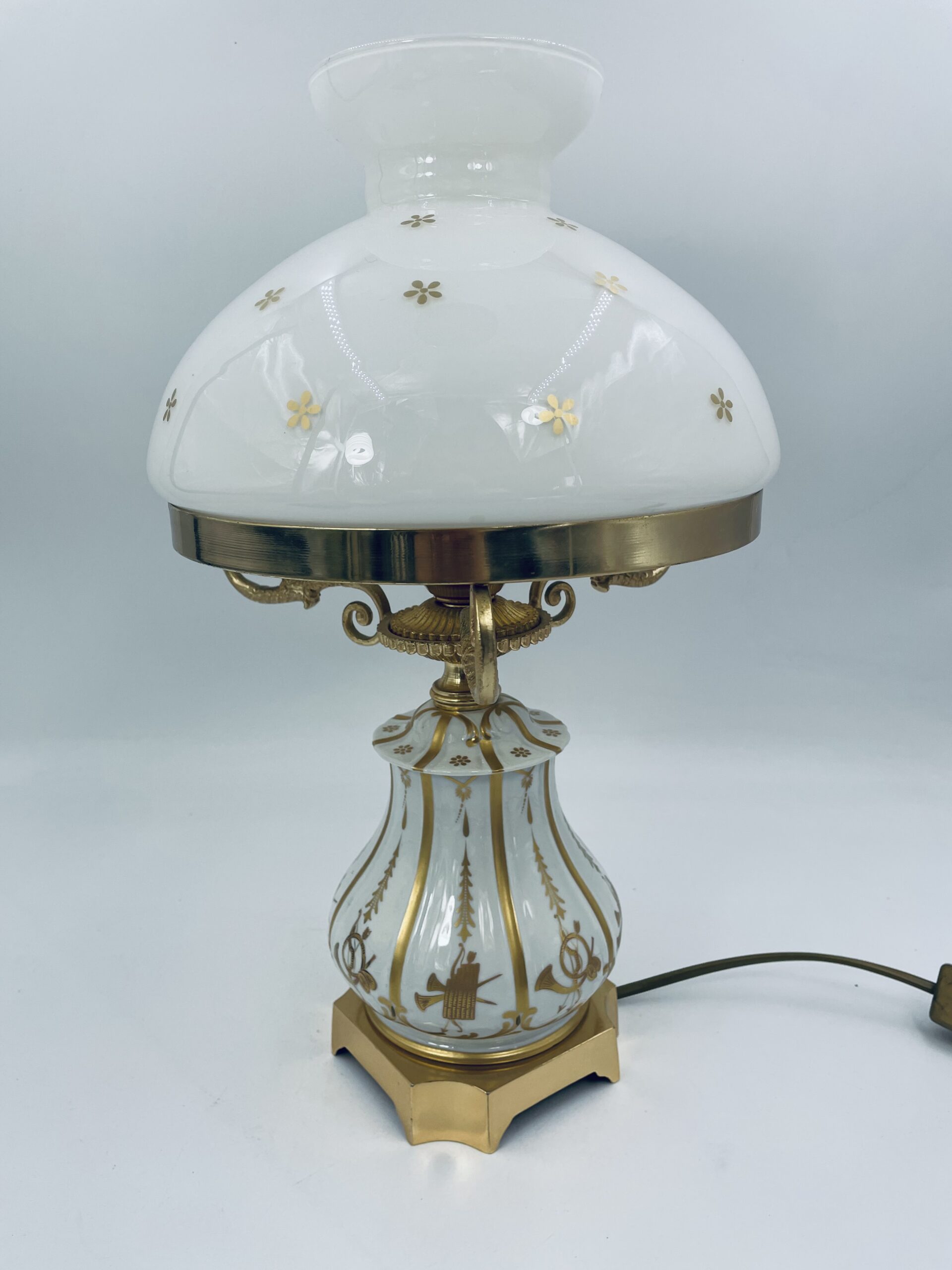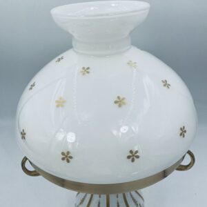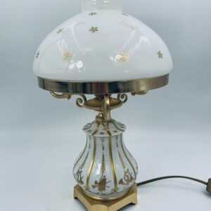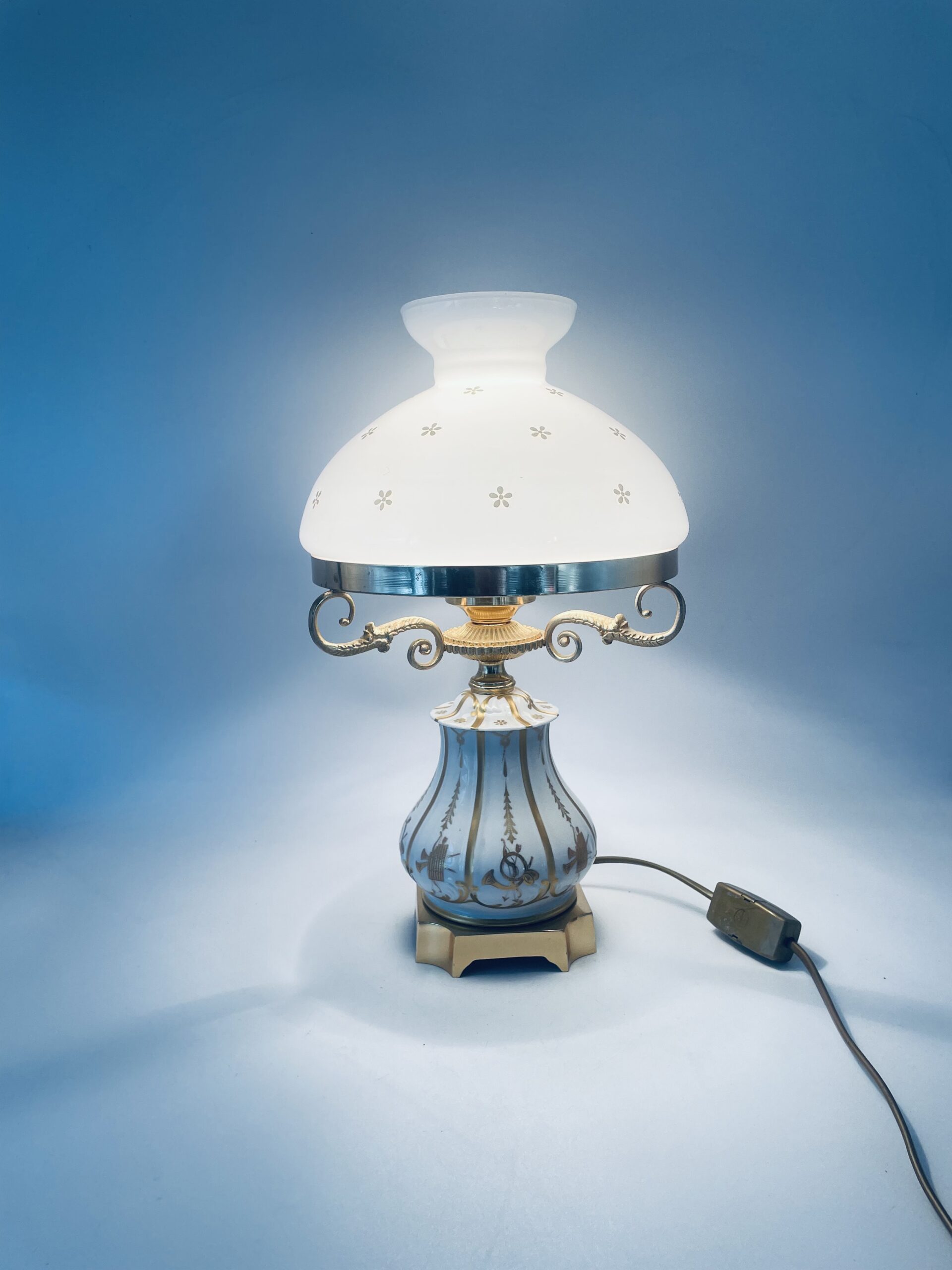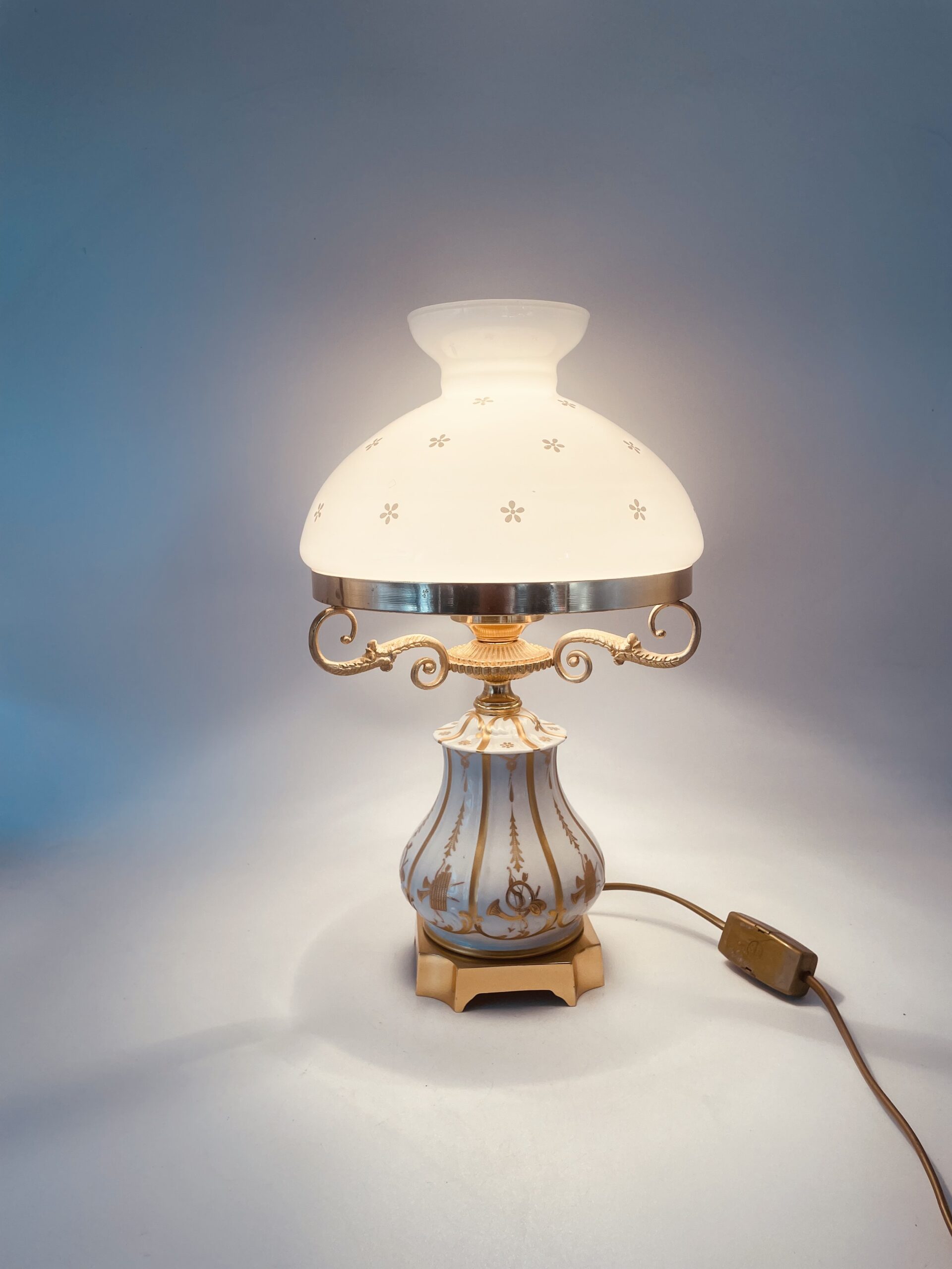Piękna stylowa lampa porcelanowa złocona wykończona kloszem z mlecznego szkła oraz detalami z mosiądzu.