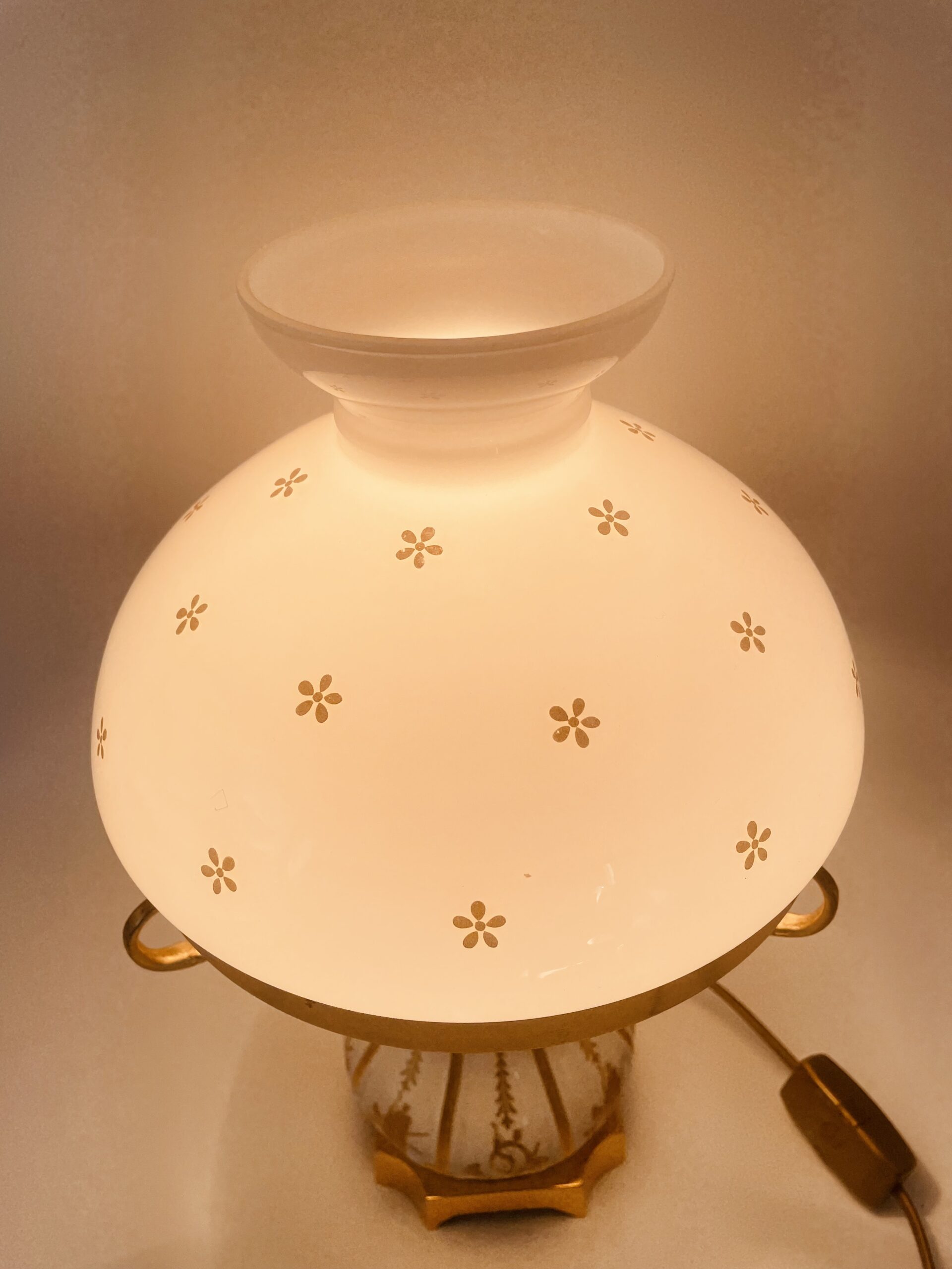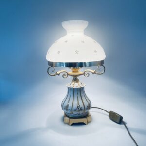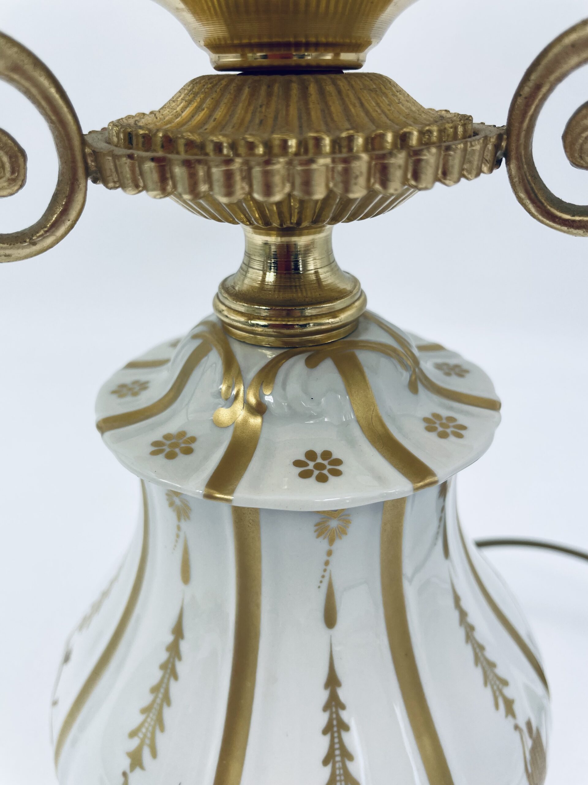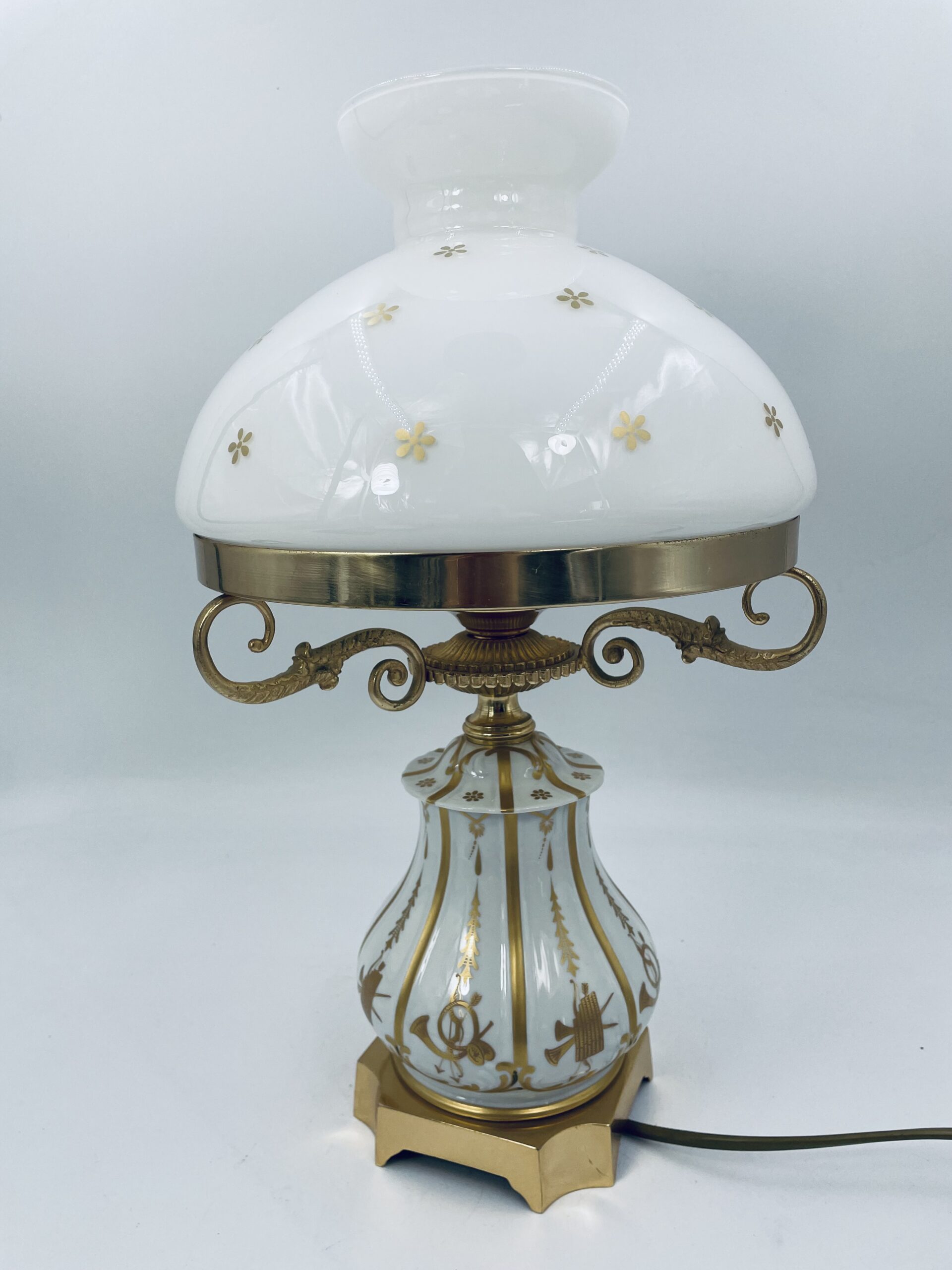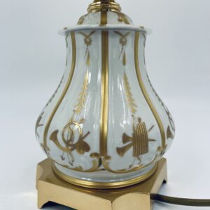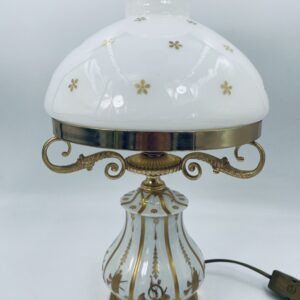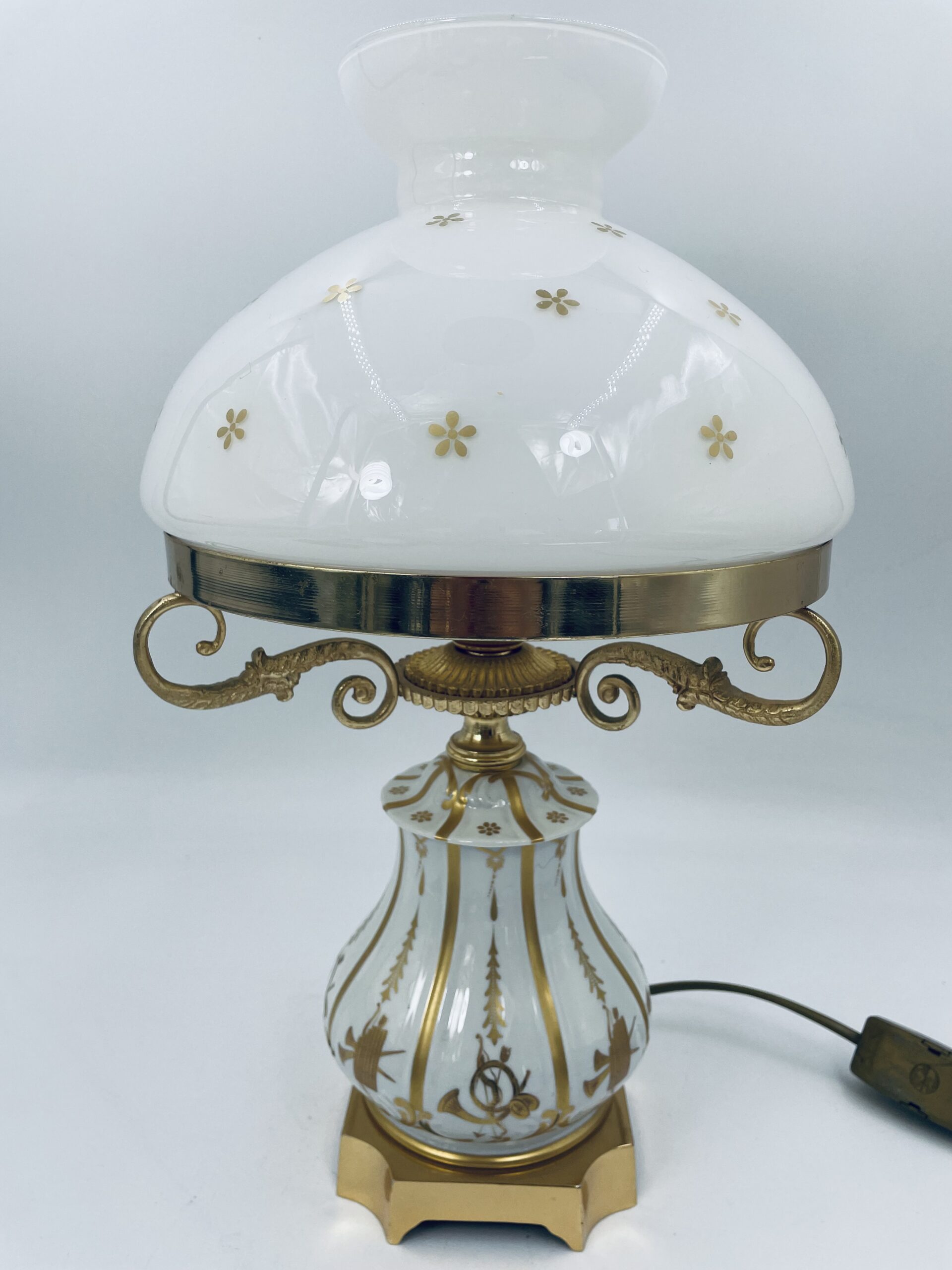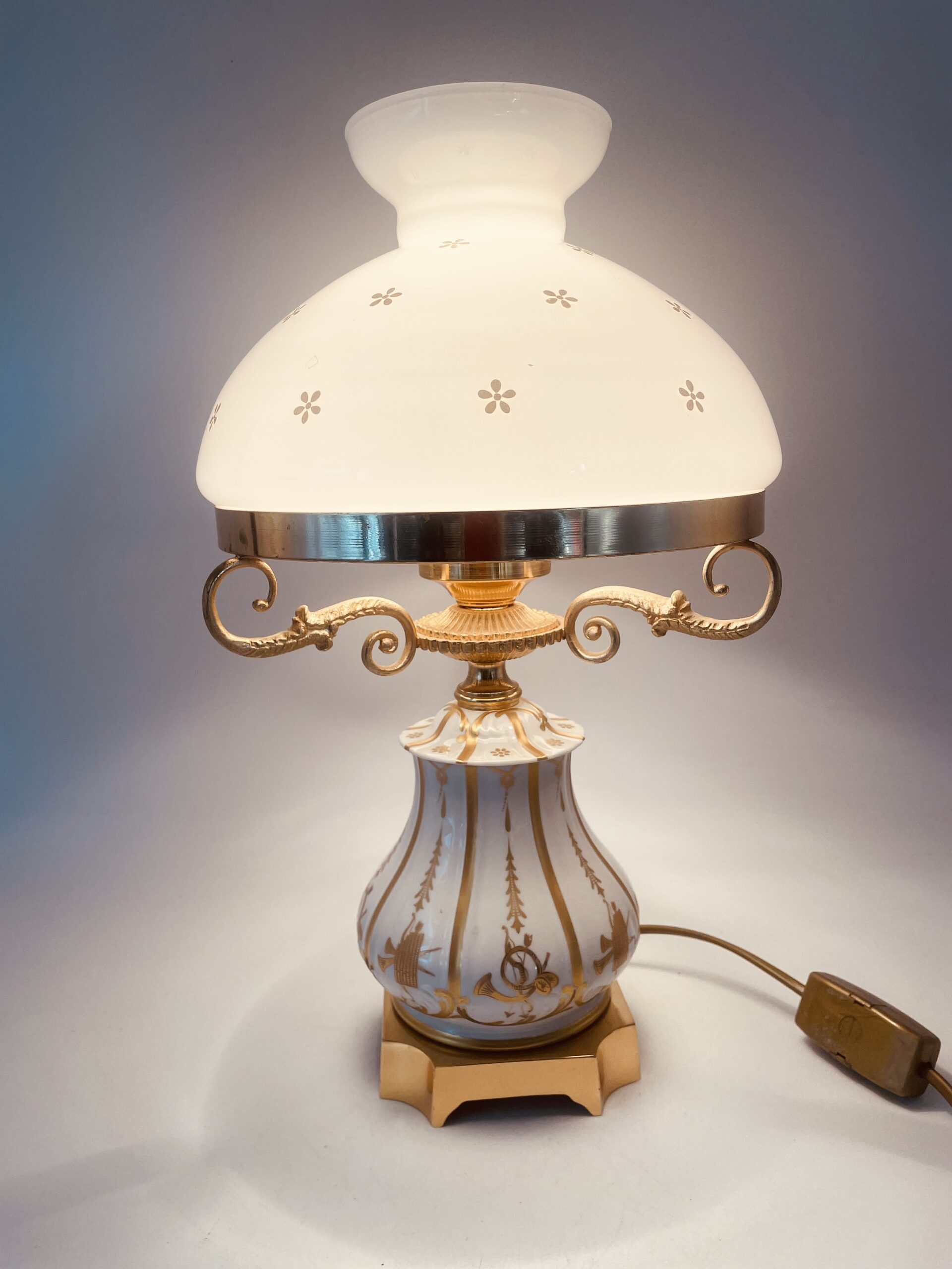 Piękna stylowa lampa porcelanowa złocona wykończona kloszem z mlecznego szkła oraz detalami z mosiądzu.