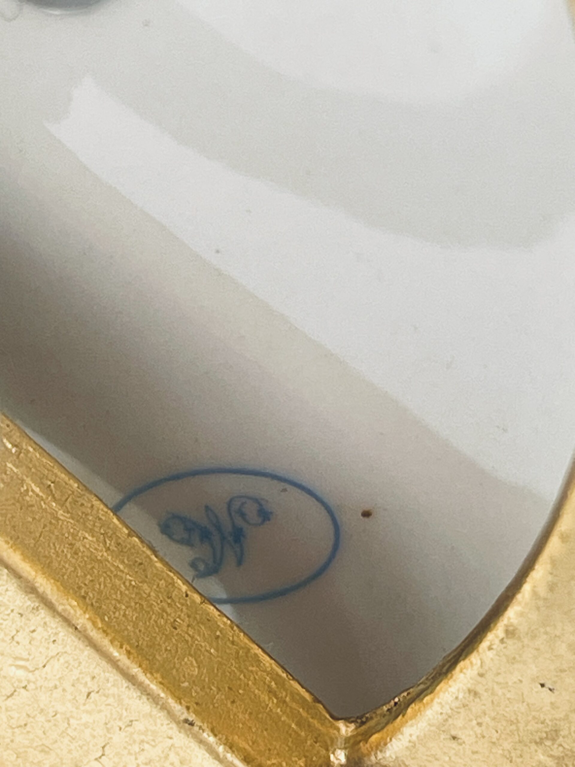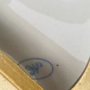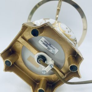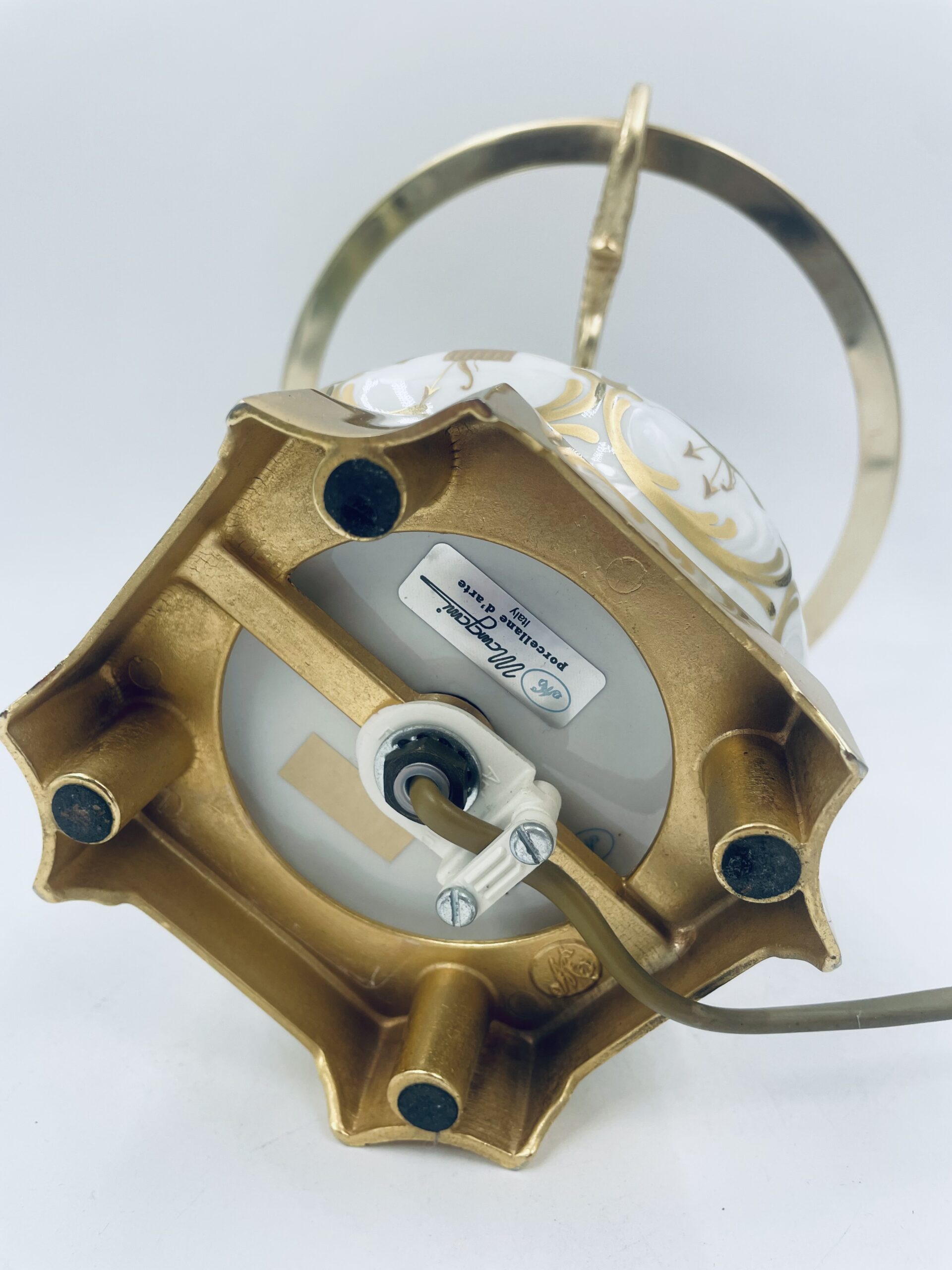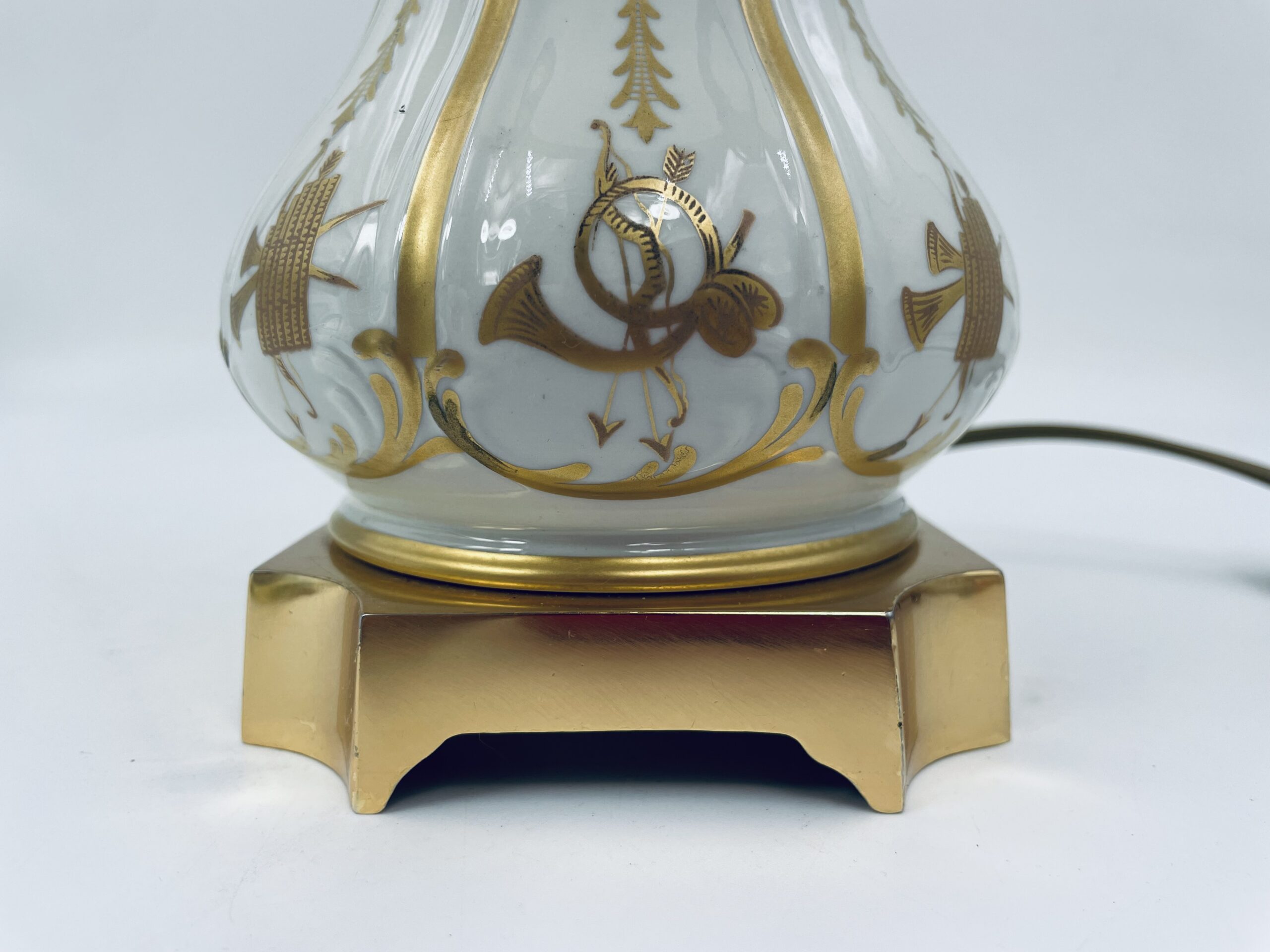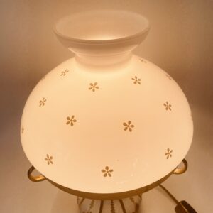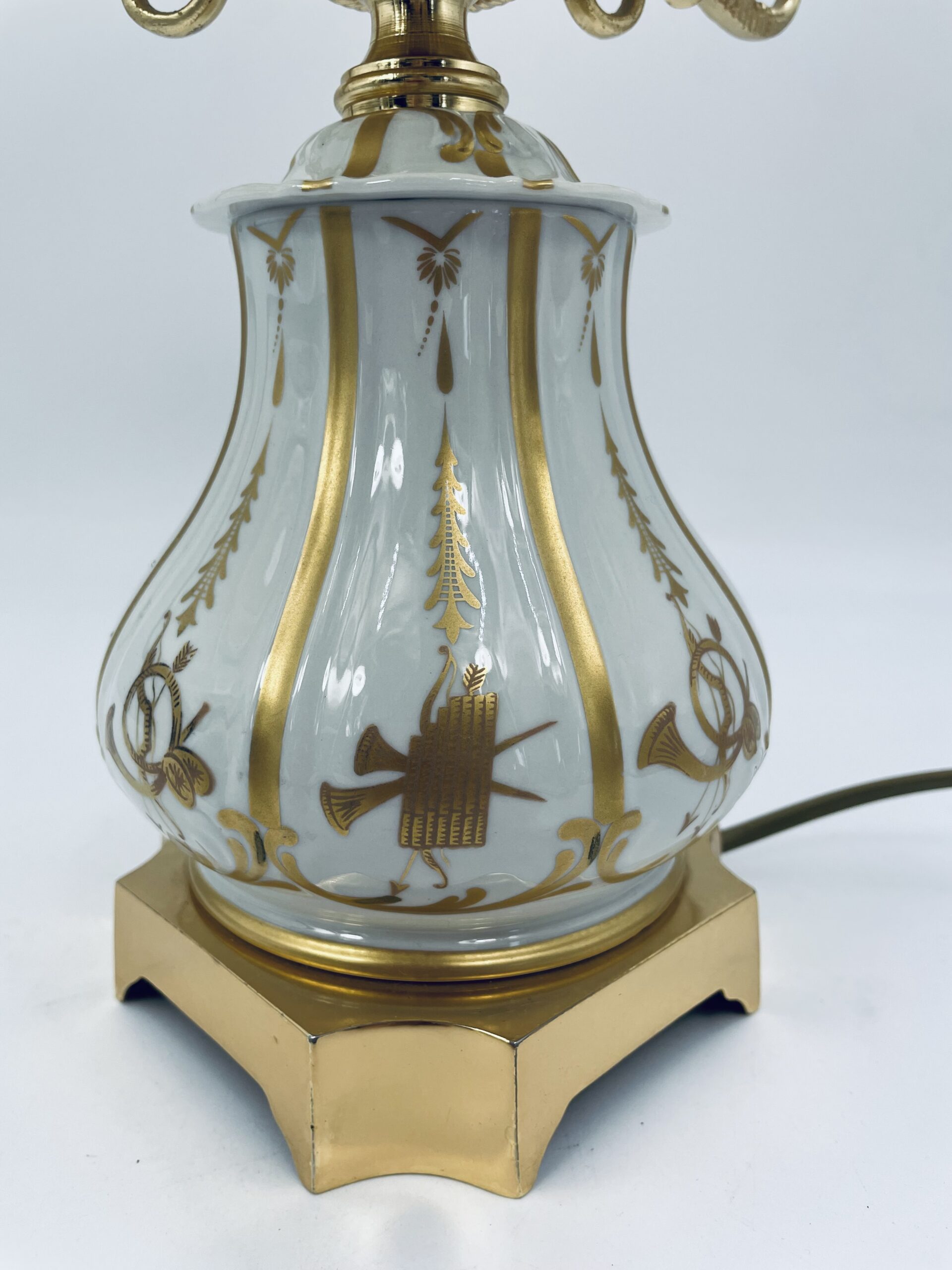 Piękna stylowa lampa porcelanowa złocona wykończona kloszem z mlecznego szkła oraz detalami z mosiądzu.
