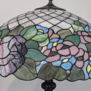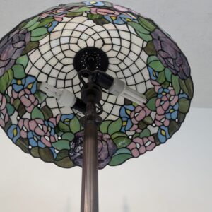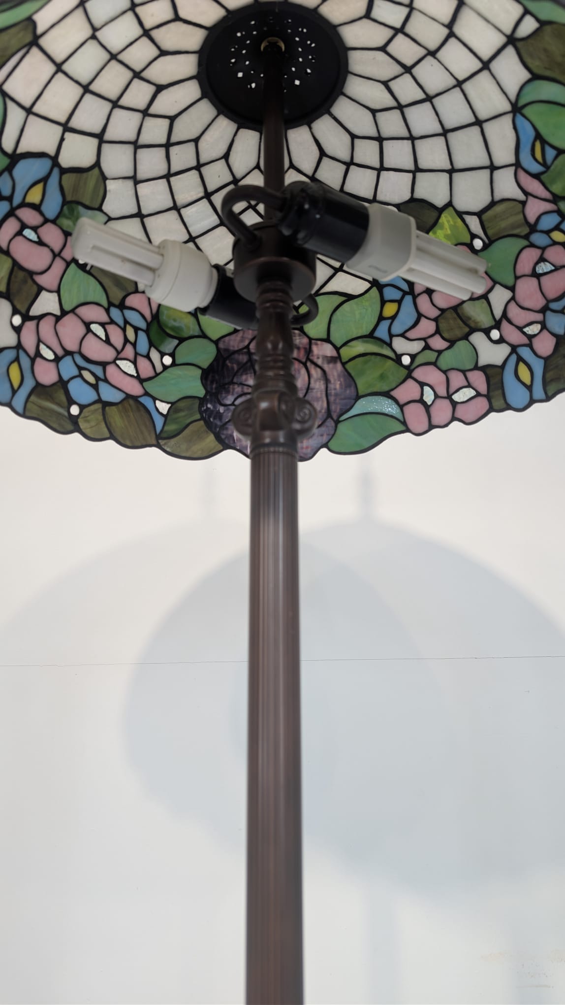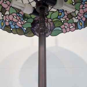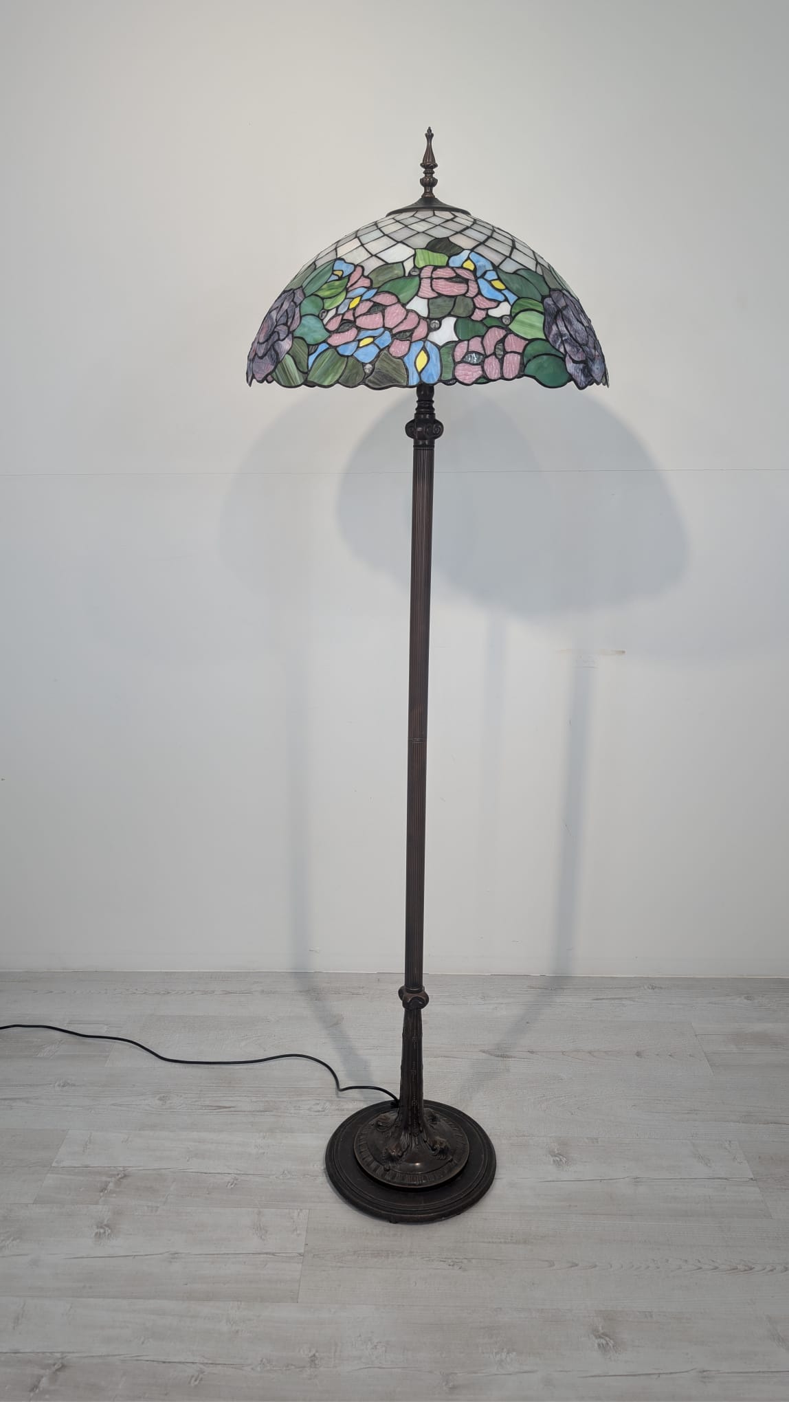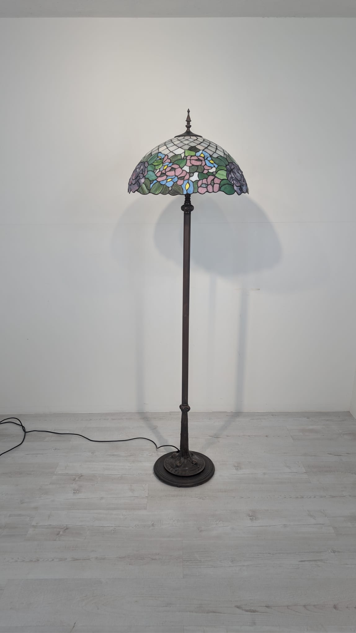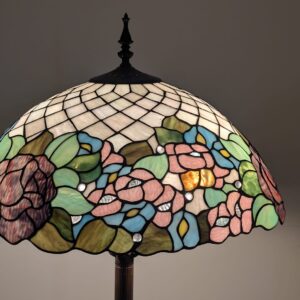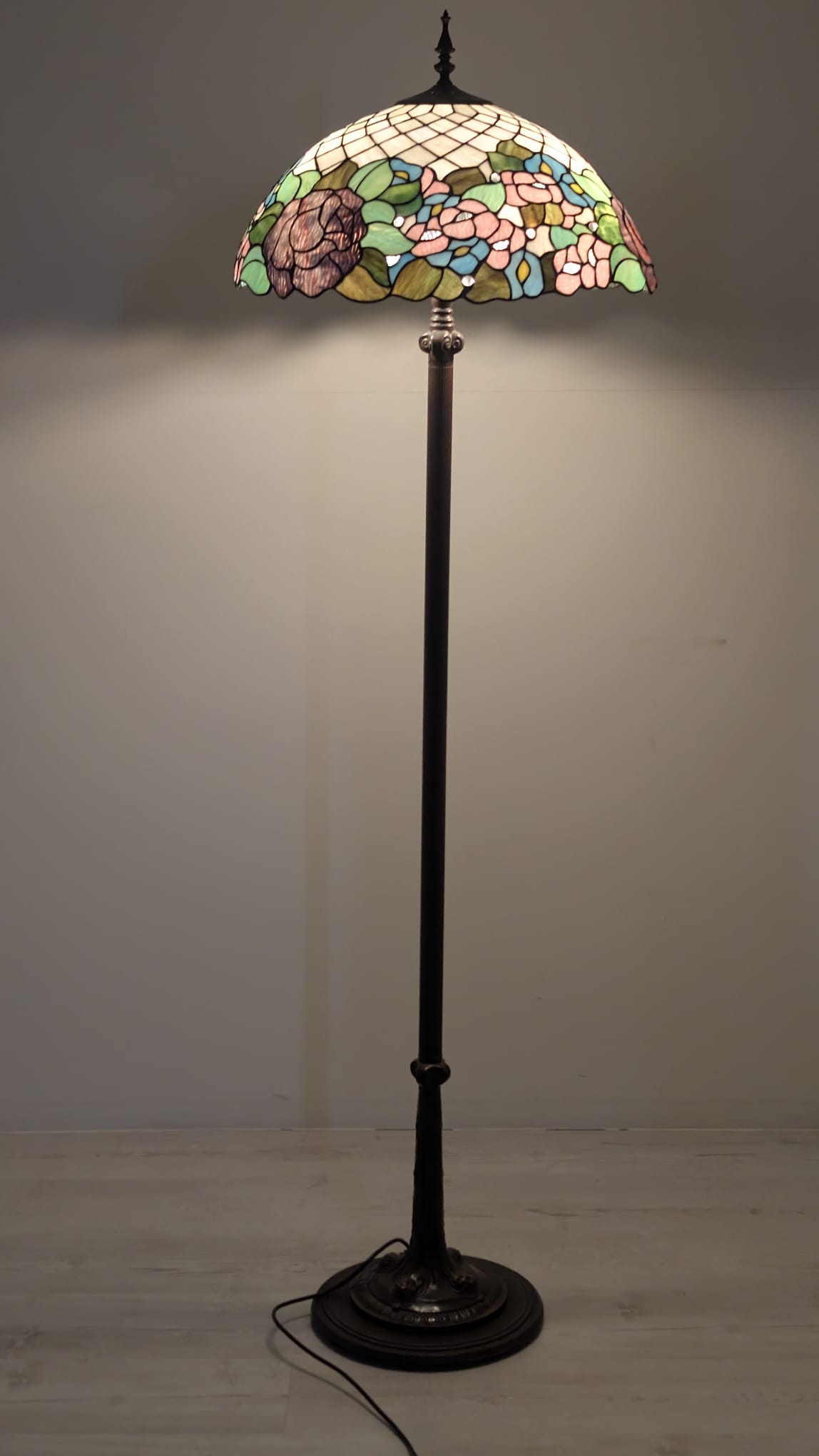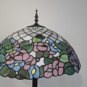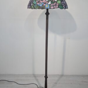 Piękna, stylowa lampa podłogowa w stylu Tiffany’ego. Klosz wykonany z kolorowego, witrażowego szkła tworzy niepowtarzalny, ciepły nastrój. Podstawa lampy w ciemnym kolorze doskonale komponuje się z całością. Produkt używany, ale w dobrym stanie. Świetna dekoracja do każdego wnętrza.