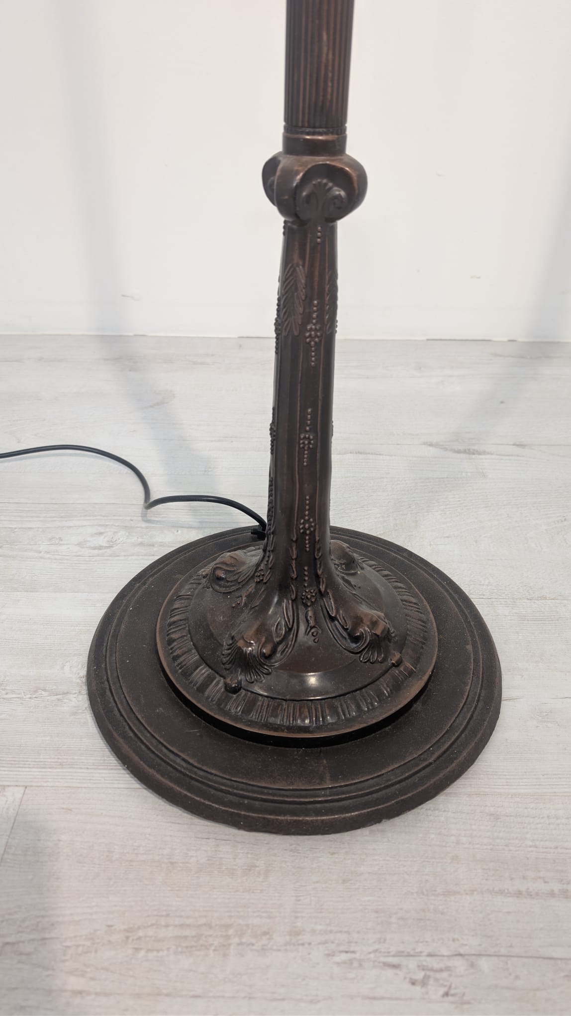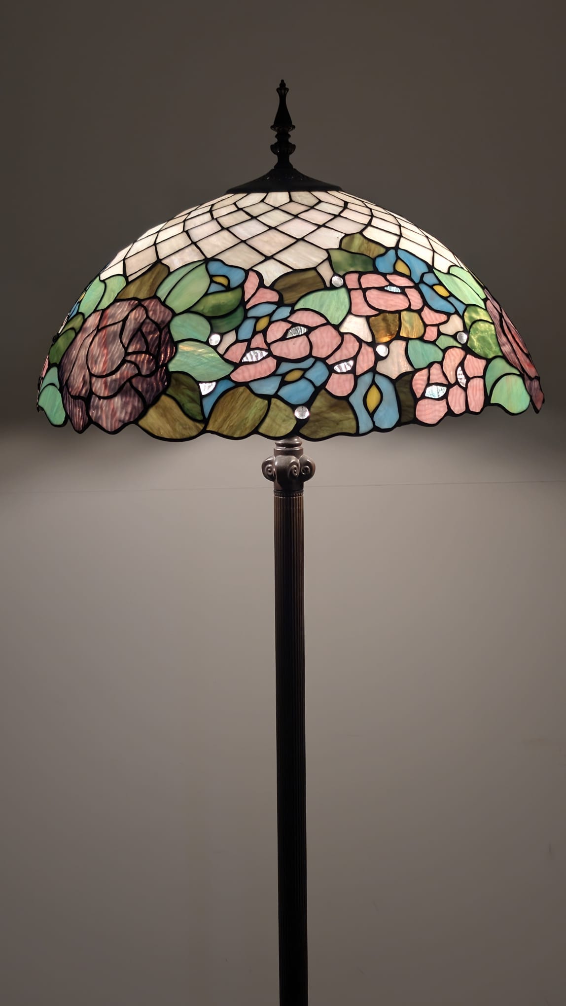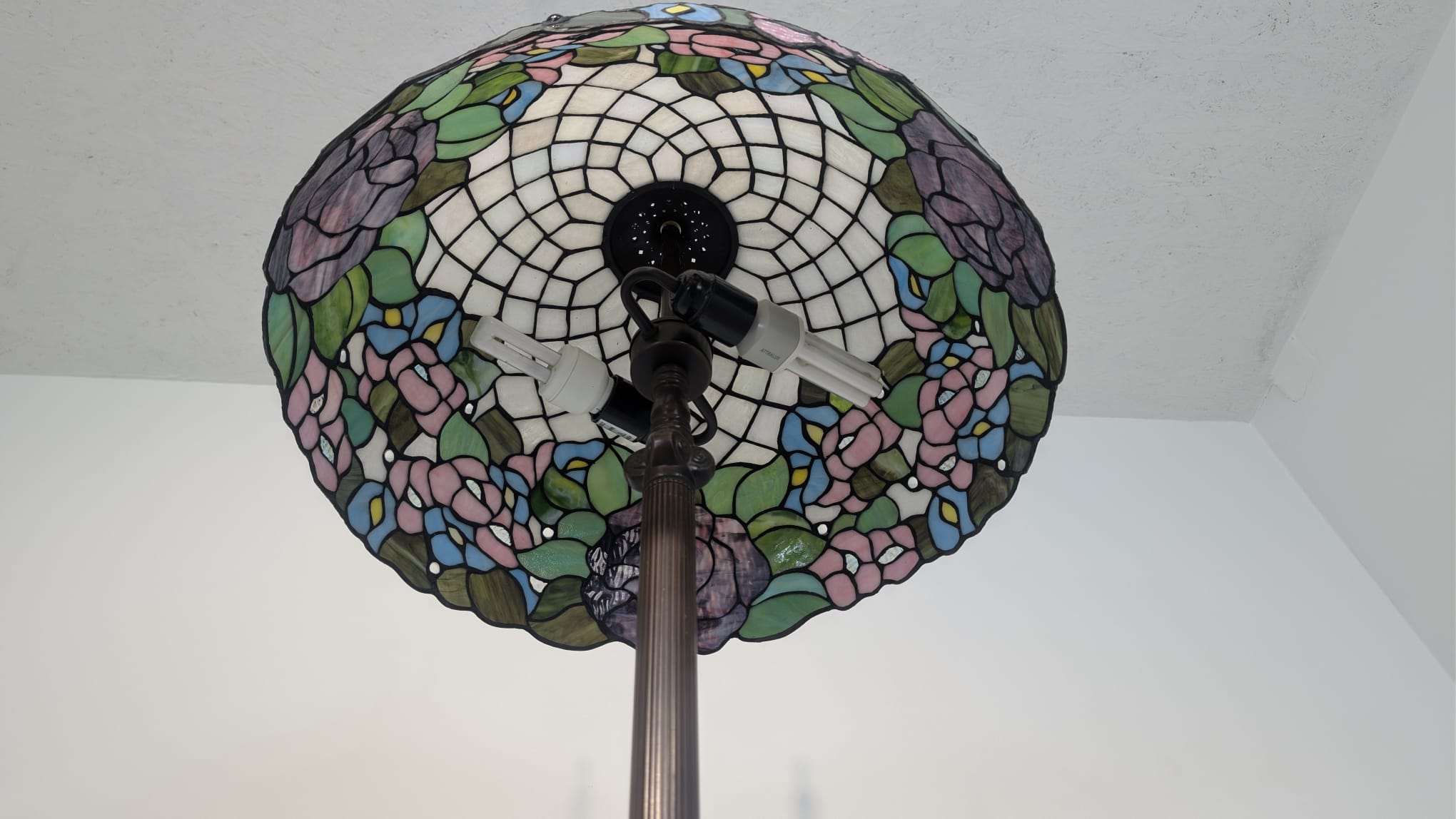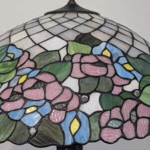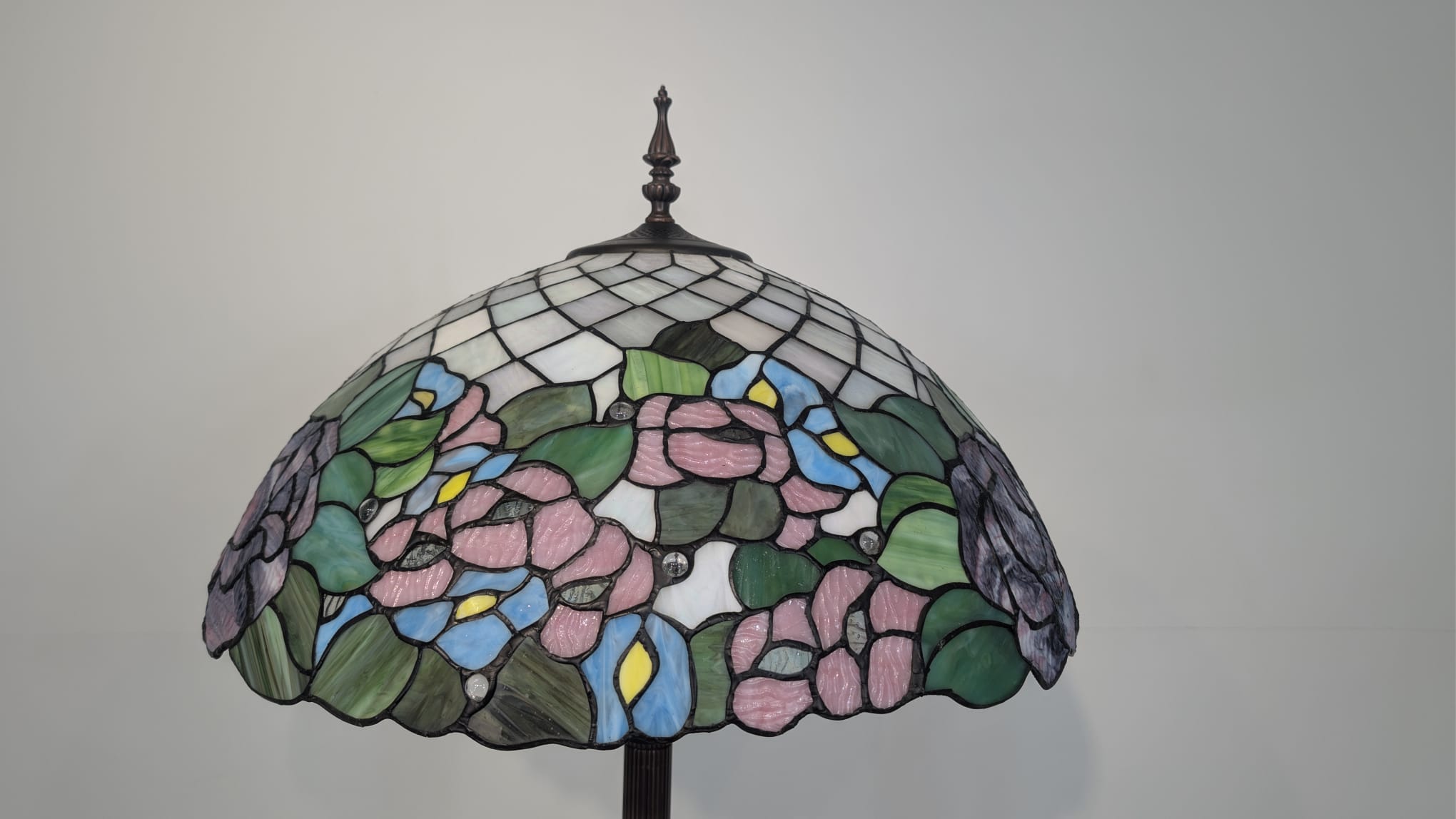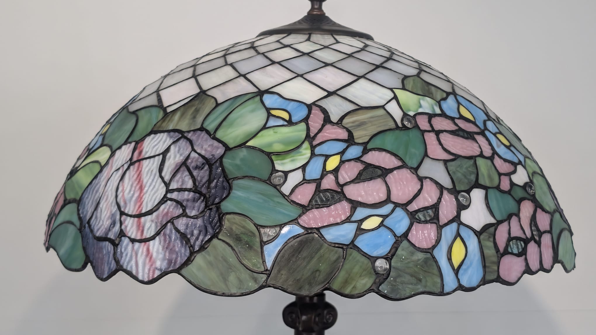 Piękna, stylowa lampa podłogowa w stylu Tiffany’ego. Klosz wykonany z kolorowego, witrażowego szkła tworzy niepowtarzalny, ciepły nastrój. Podstawa lampy w ciemnym kolorze doskonale komponuje się z całością. Produkt używany, ale w dobrym stanie. Świetna dekoracja do każdego wnętrza.