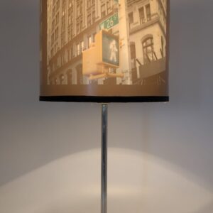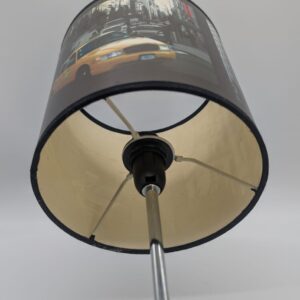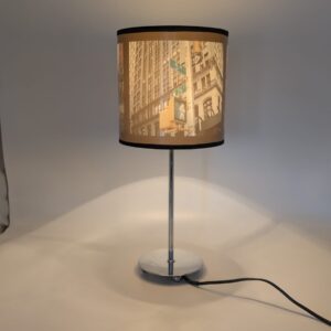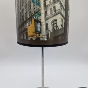 Lampka nocna z motywem Nowego Jorku. Podstawa w kolorze srebrnym, abażur ozdobiony grafiką przedstawiającą charakterystyczne budynki i ulice Nowego Jorku. Idealna do oświetlenia stolika nocnego lub innego mebla w sypialni lub salonie.