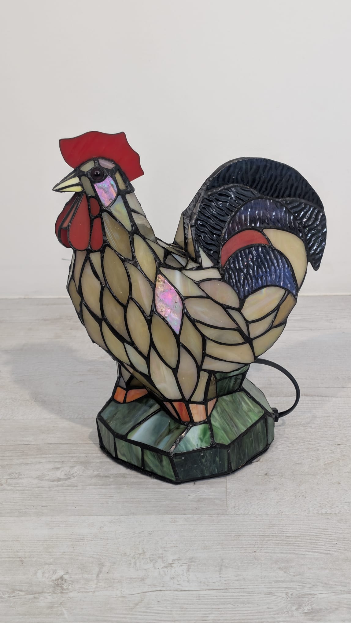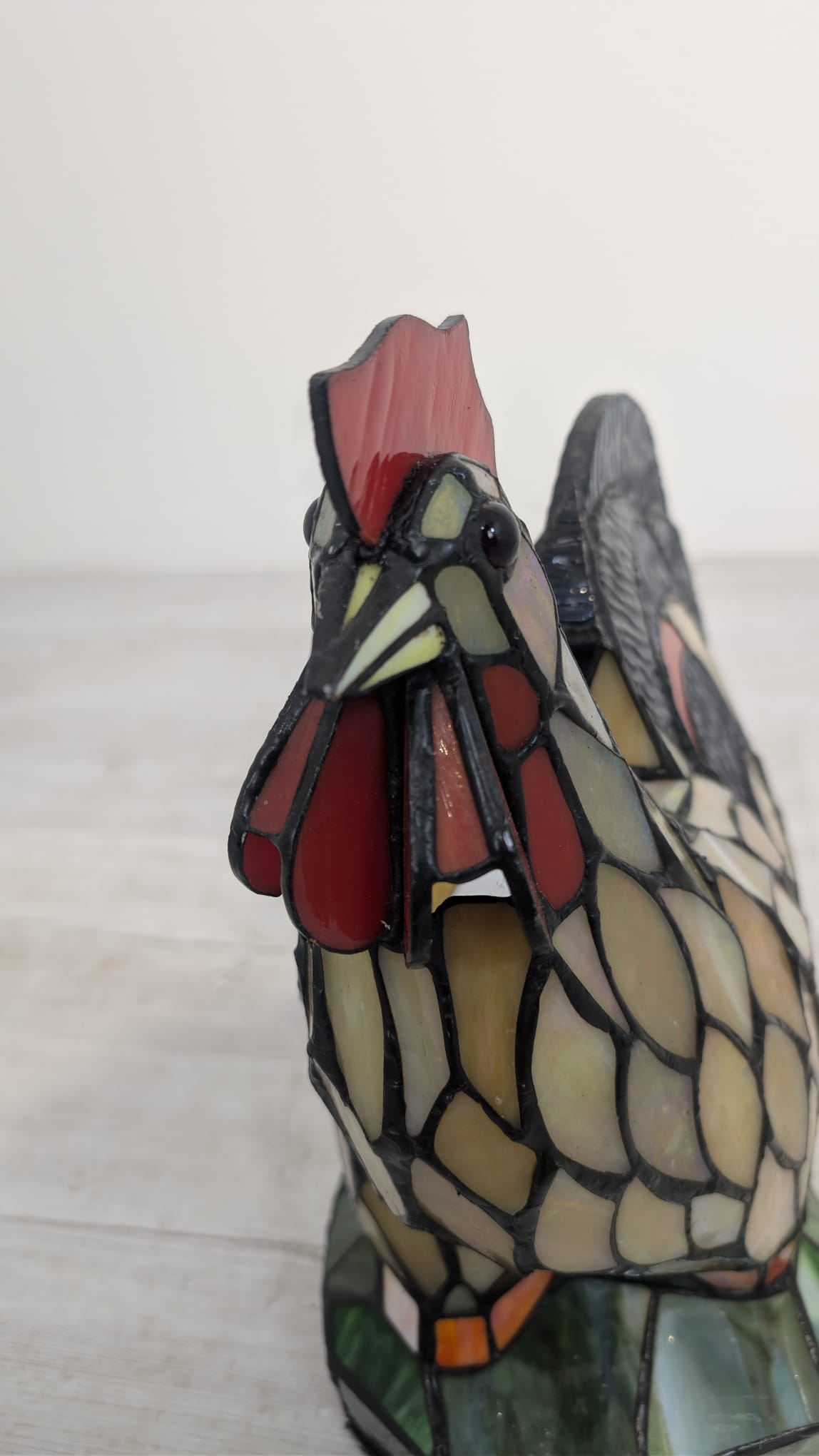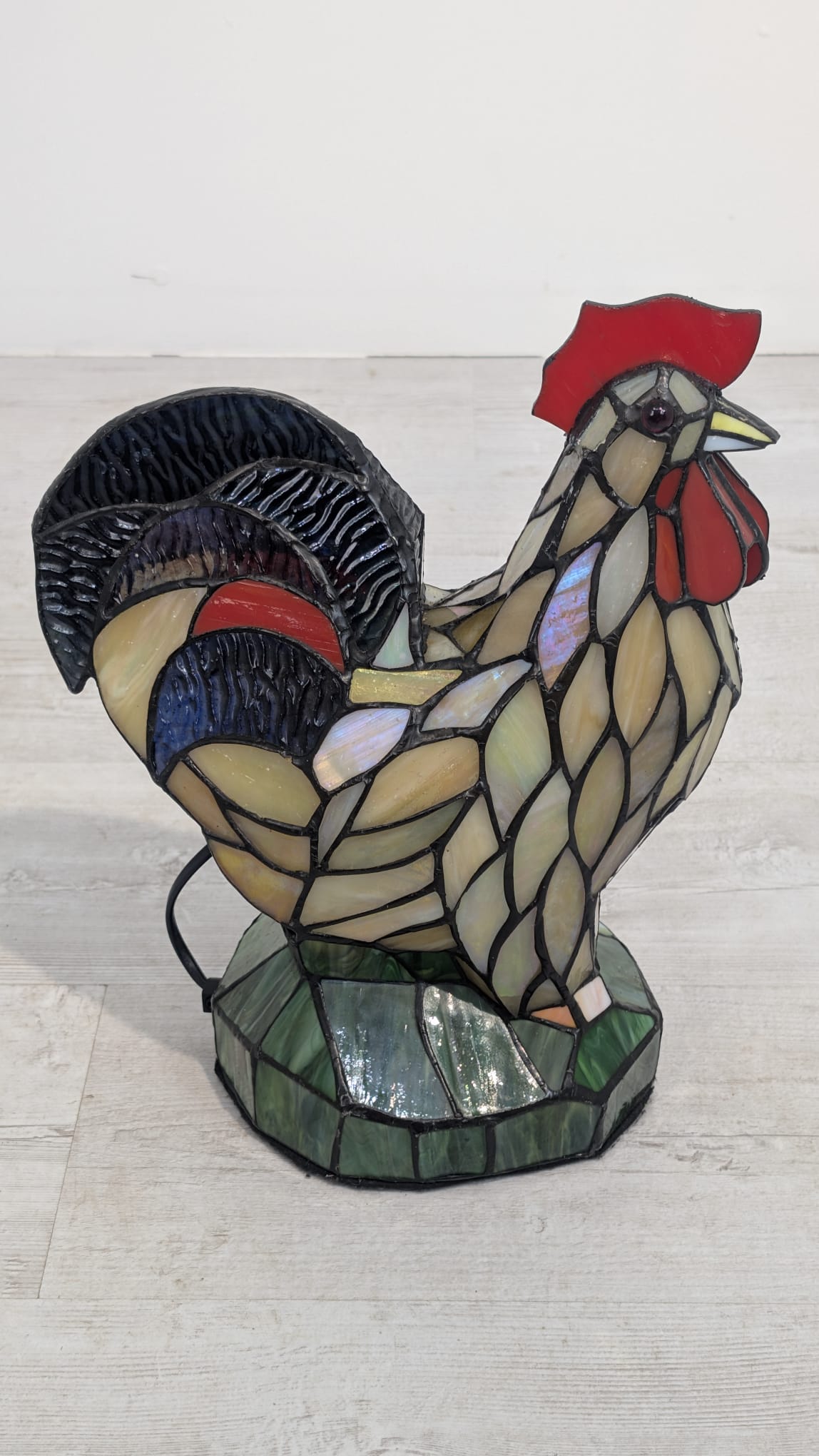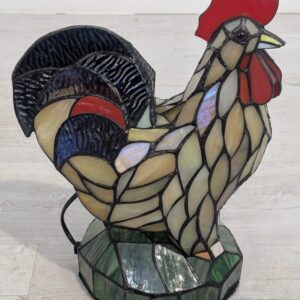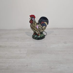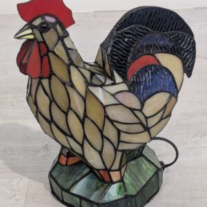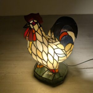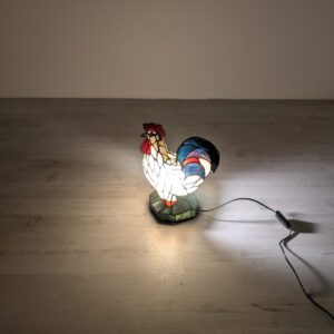 Oryginalna, ręcznie wykonana lampa stołowa w kształcie kolorowego koguta. Wykonana z barwionego szkła w stylu Tiffany’ego, nadaje niepowtarzalny klimat każdemu wnętrzu. Produkt używany, ale w dobrym stanie. Doskonała dekoracja do domu lub biura.