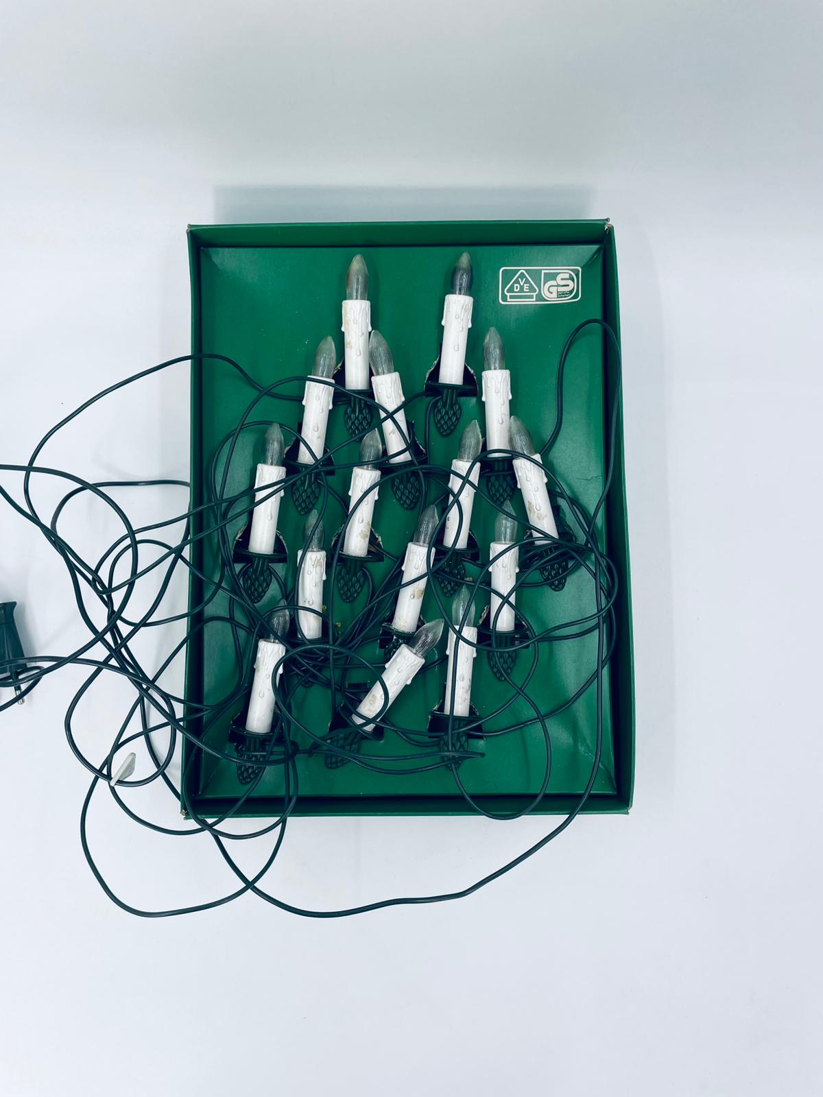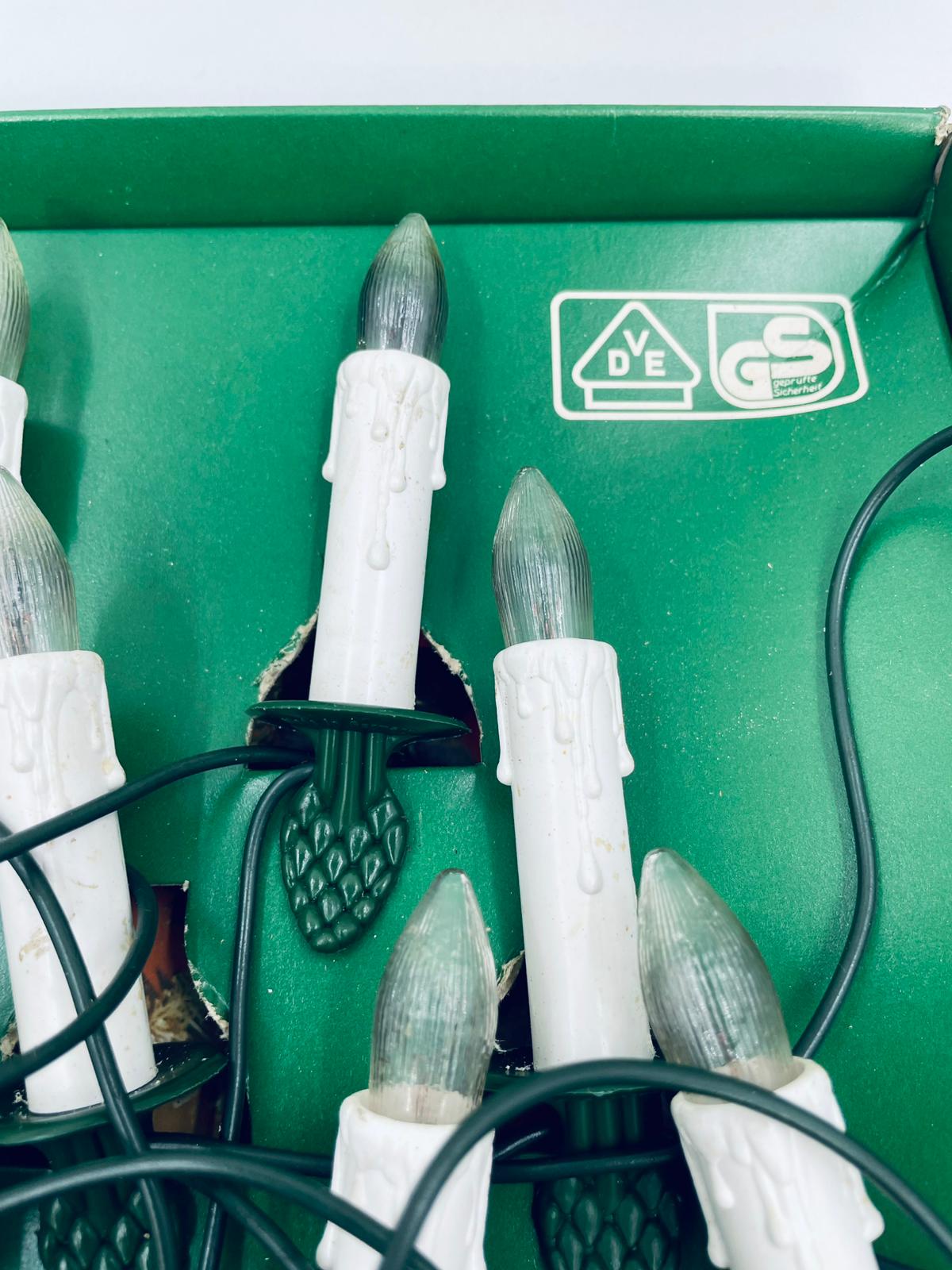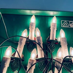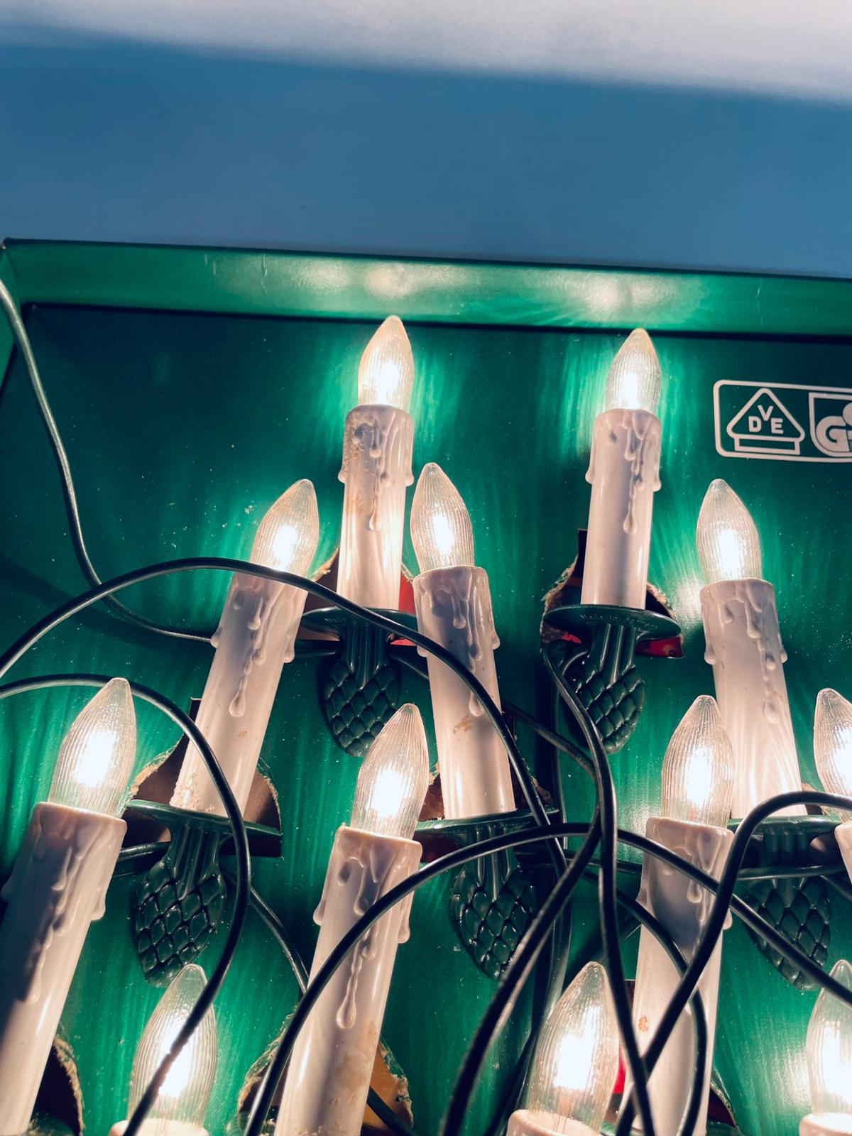 Zestaw zabytkowych lampek na choinkę z czasów PRL-u. Lampeczki w kształcie świec, żarówkowe, które dają tradycyjne, ciepłe światło. Lampki zapinane na żabke.