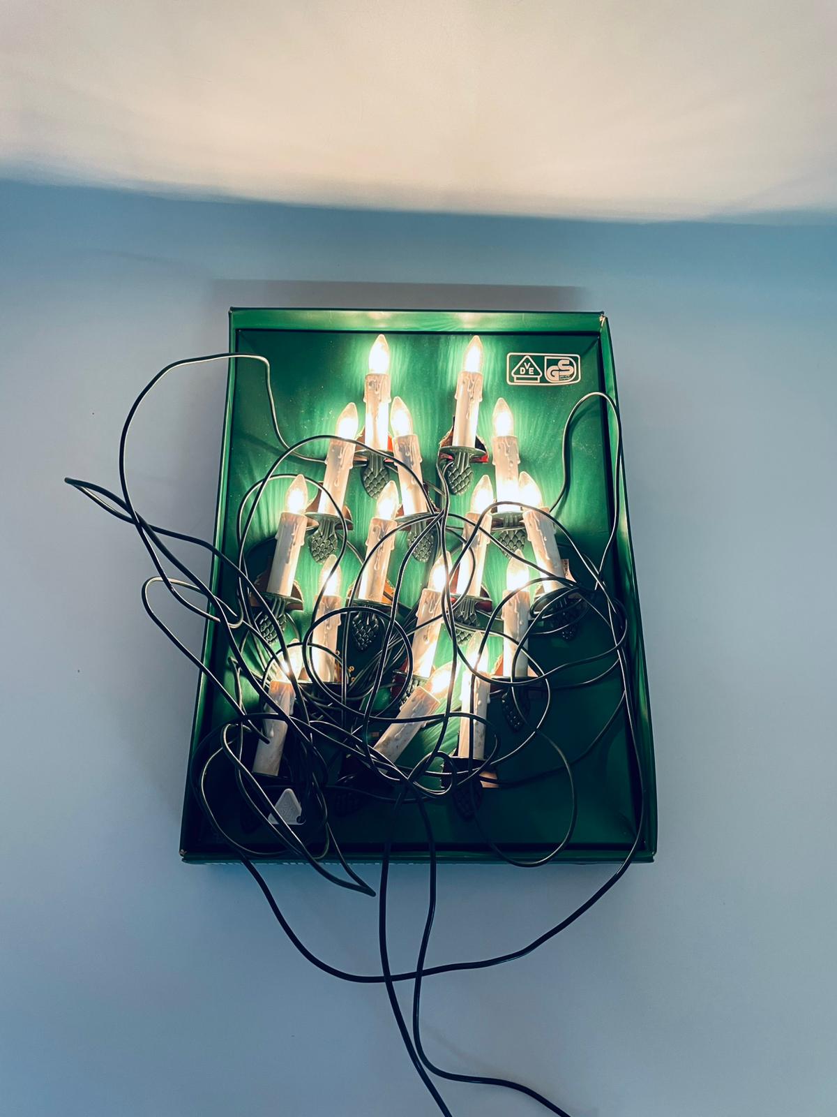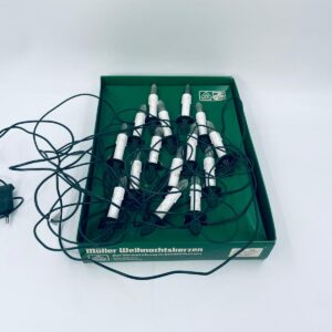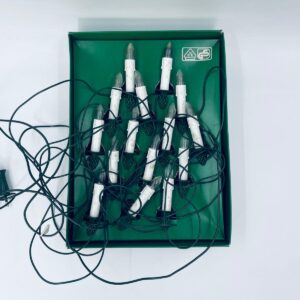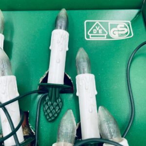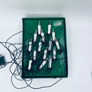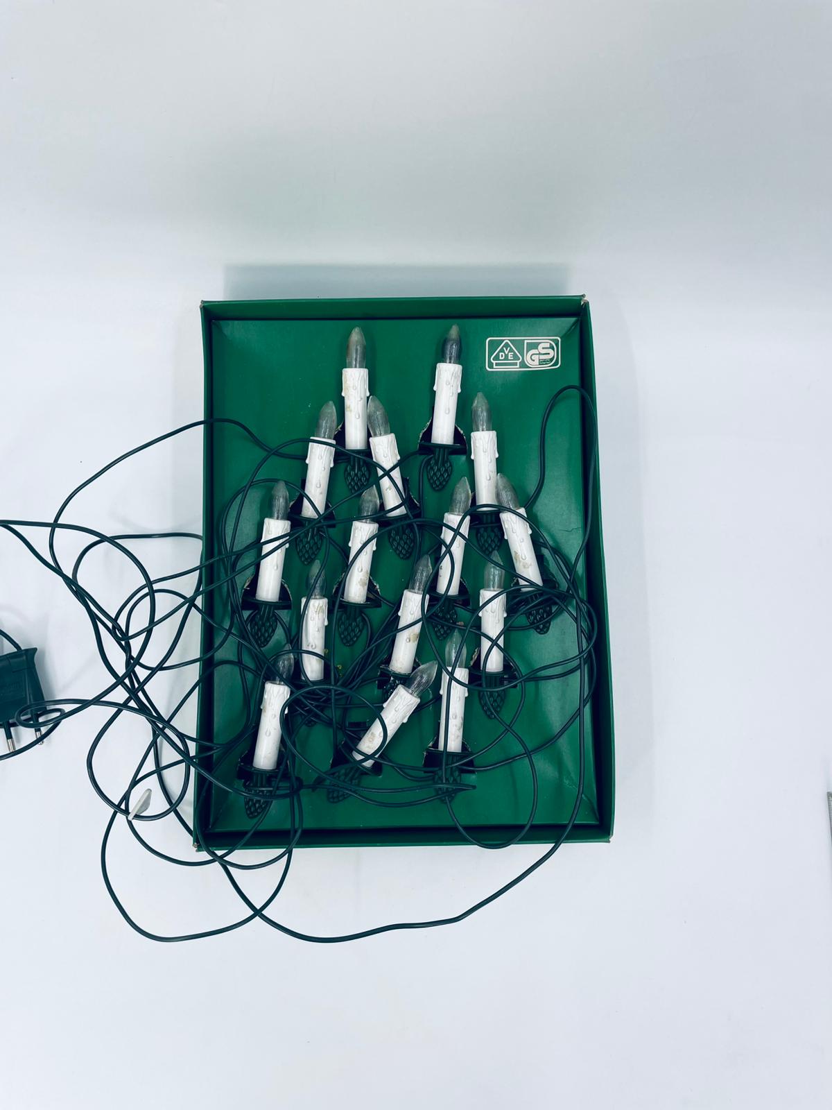 Zestaw zabytkowych lampek na choinkę z czasów PRL-u. Lampeczki w kształcie świec, żarówkowe, które dają tradycyjne, ciepłe światło. Lampki zapinane na żabke.