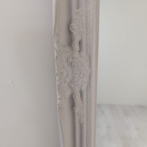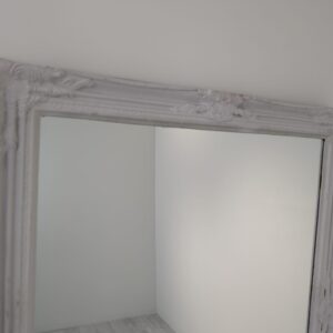 Stylowe, drewniane lustro w stylu barokowym. Posiada pięknie rzeźbioną, szarą ramę, która nadaje mu elegancki i klasyczny wygląd. Lustro może być świetnym dodatkiem do salonu lub sypialni, dopełniając wystrój w stylu vintage. Produkt używany, ale w dobrym stanie.