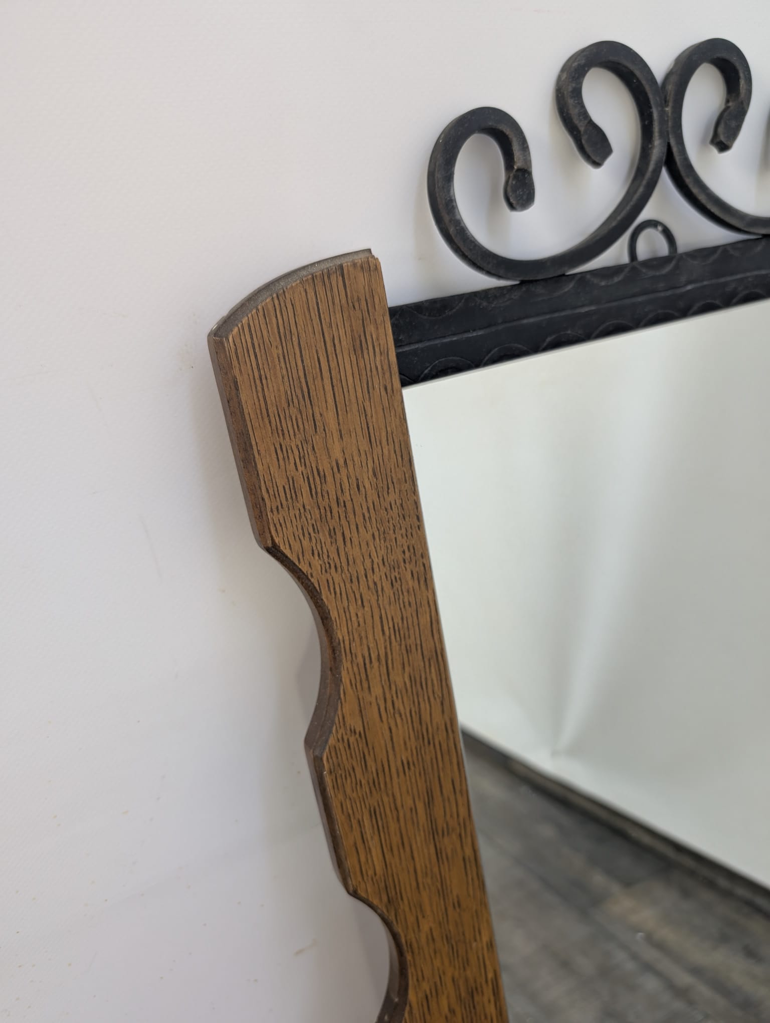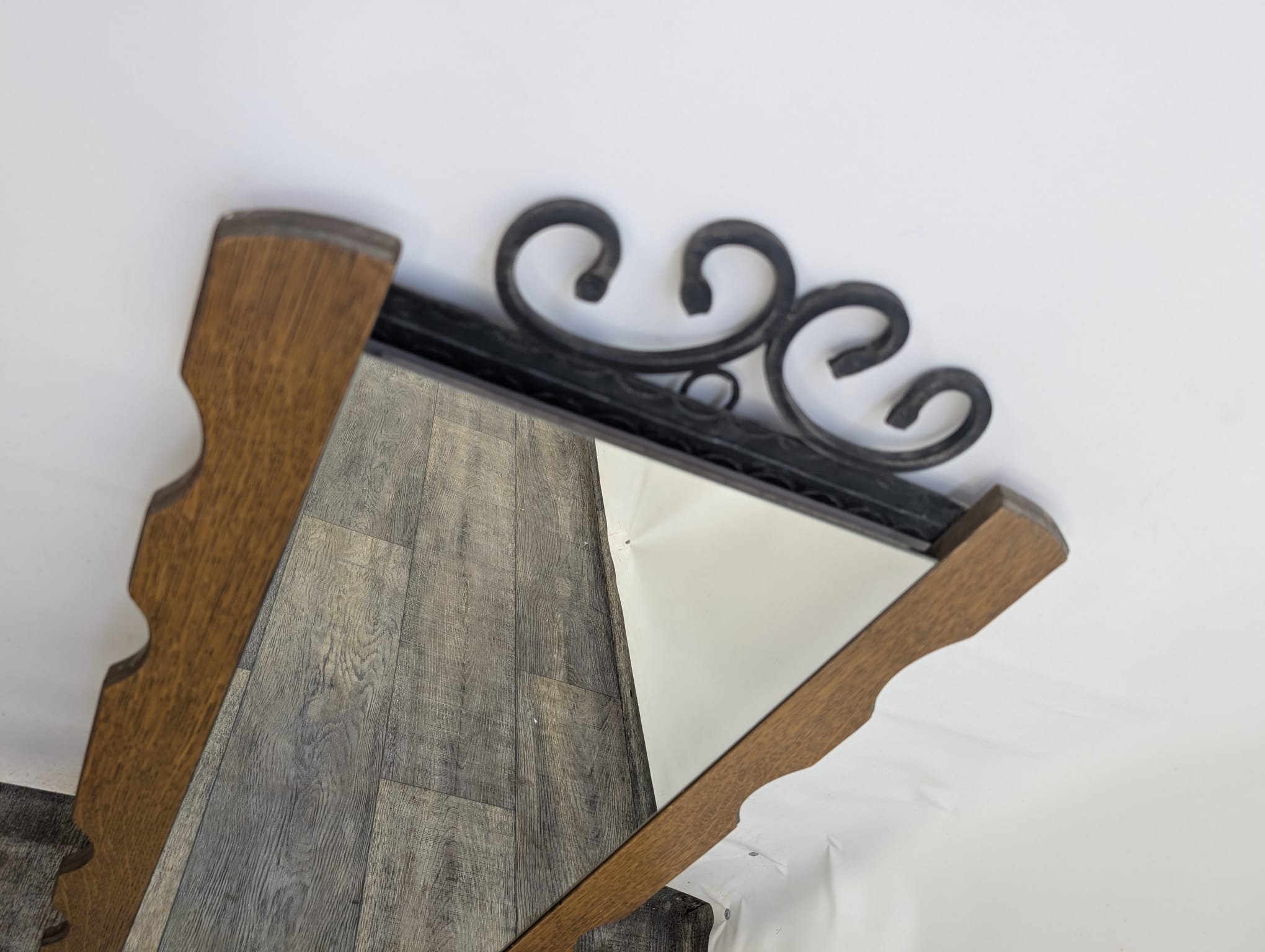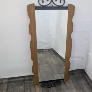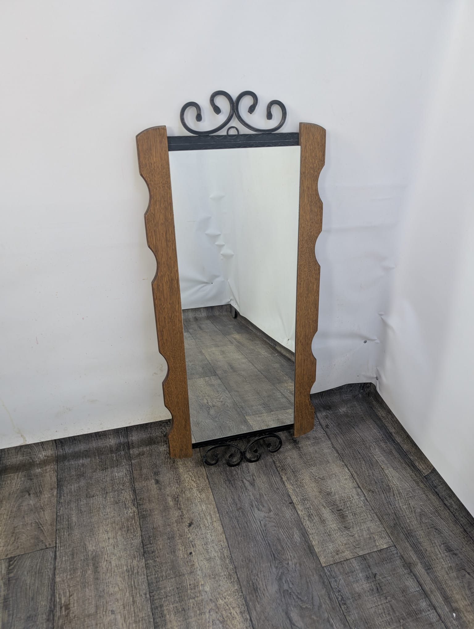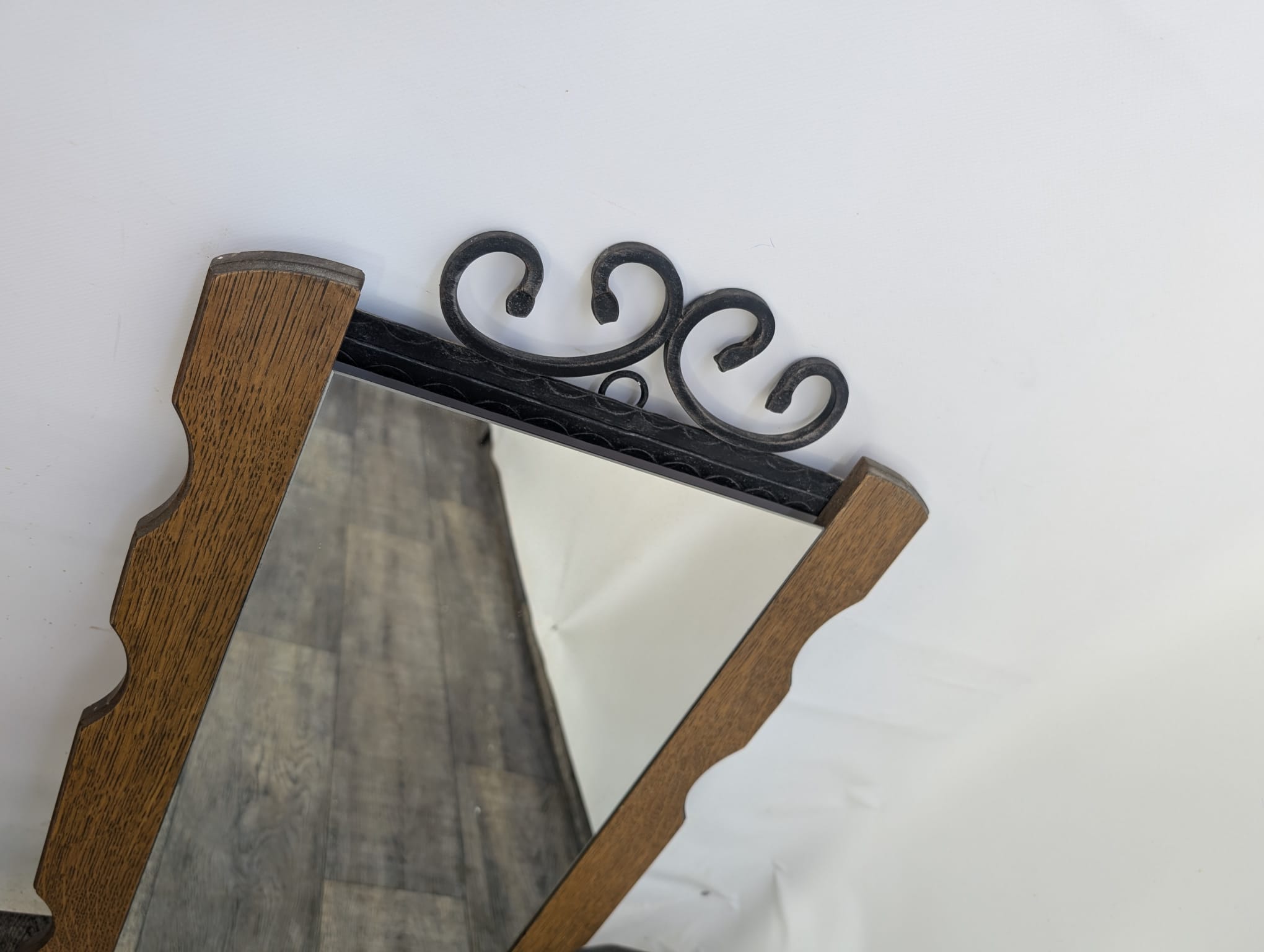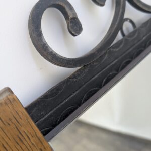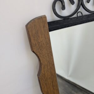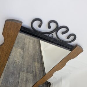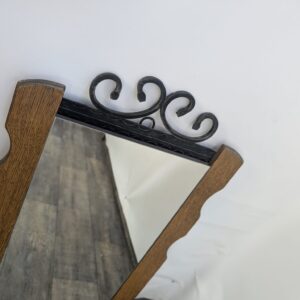 Lustro z drewna dębowego wykończony dekoracyjnym kutym żelazem, nadający elegancji w latach 60-tych.