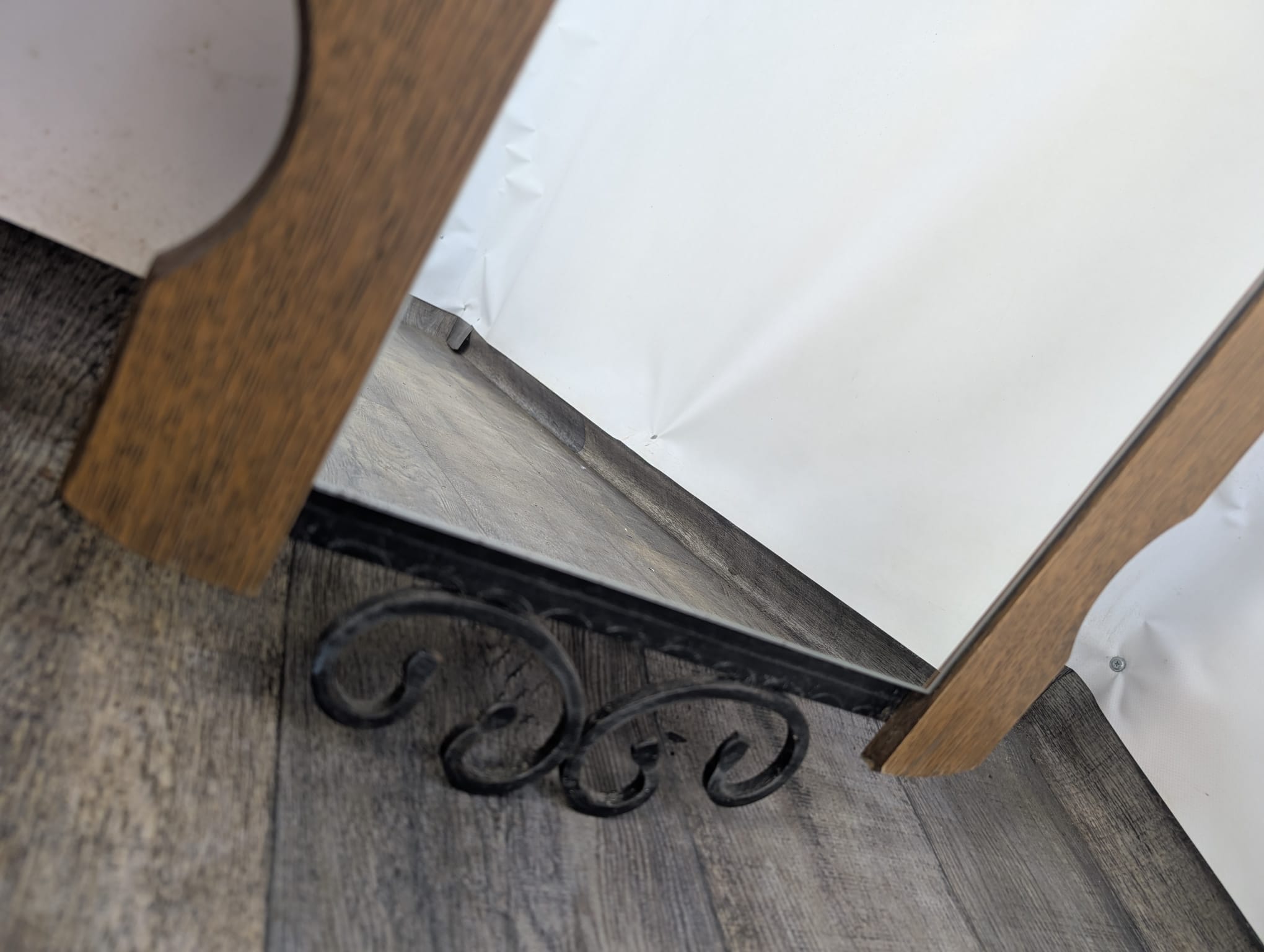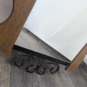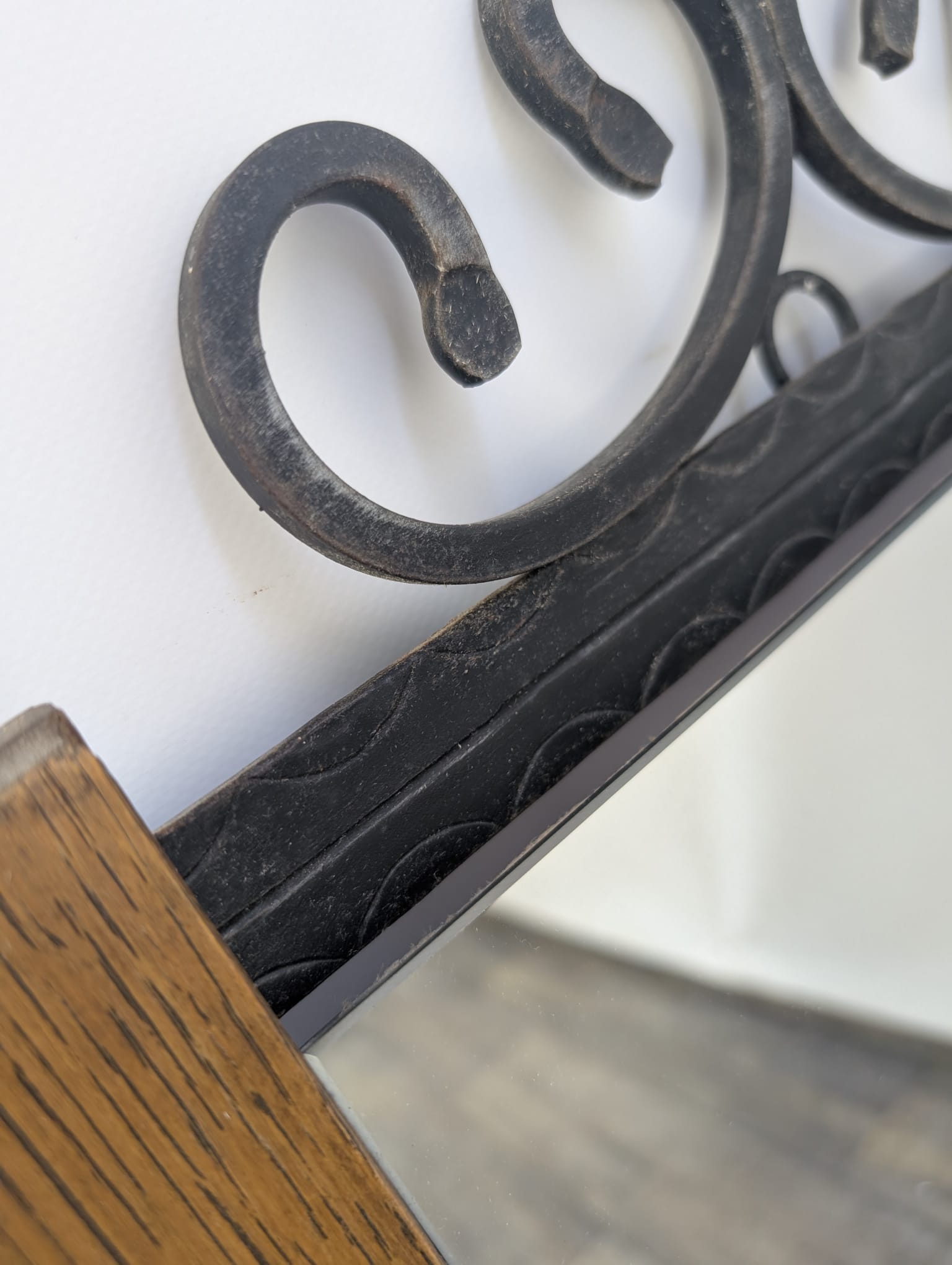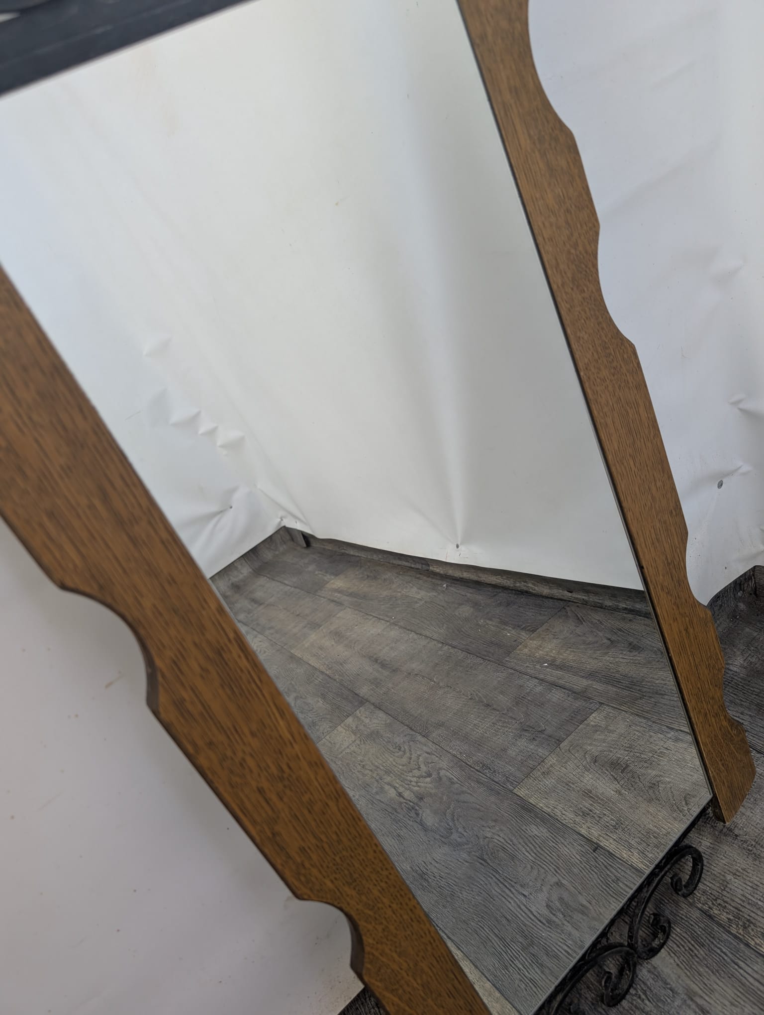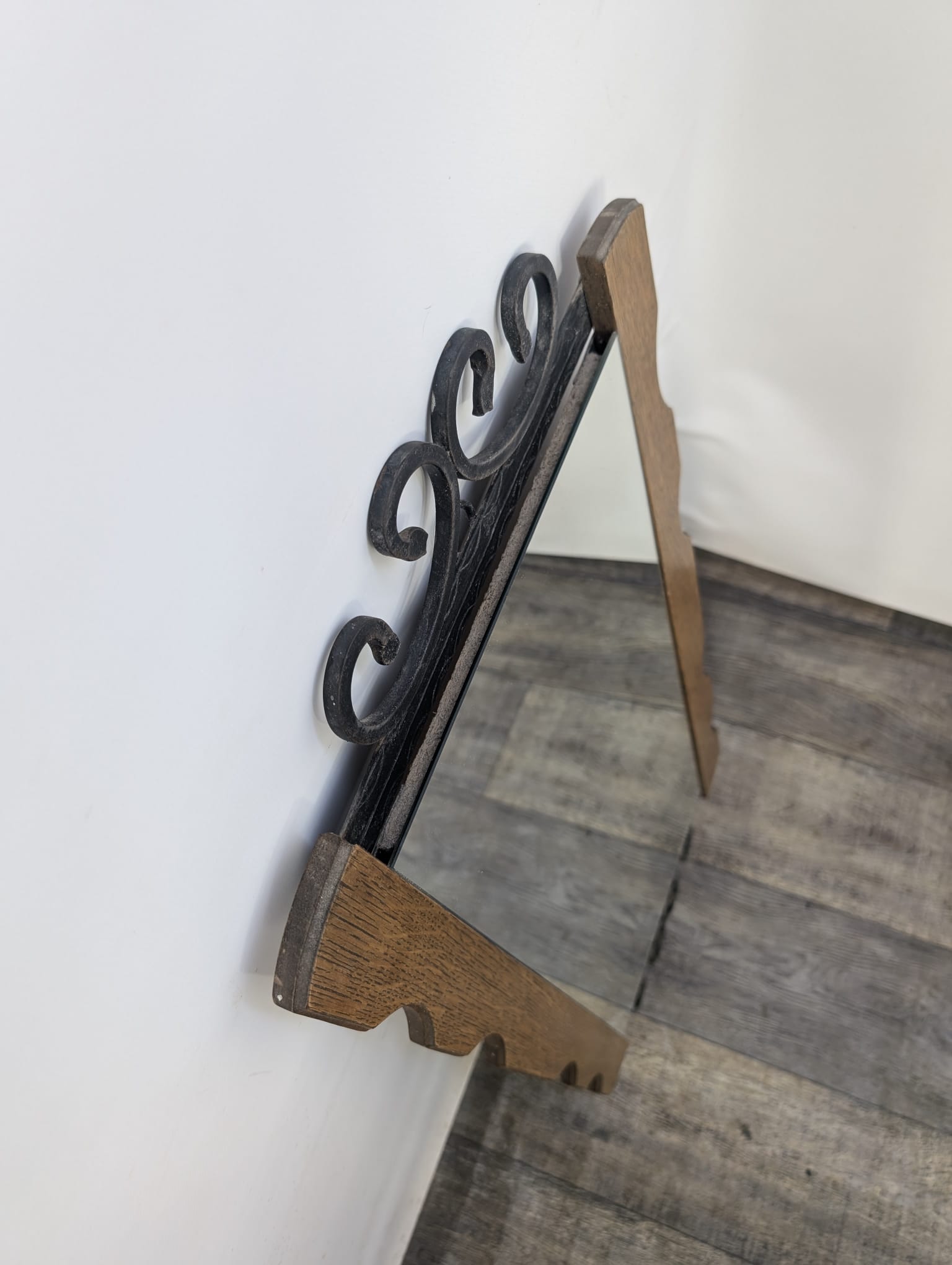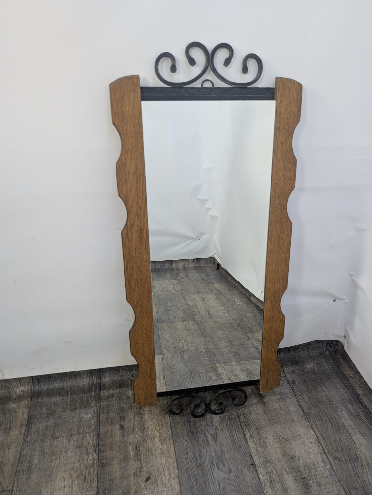 Lustro z drewna dębowego wykończony dekoracyjnym kutym żelazem, nadający elegancji w latach 60-tych.