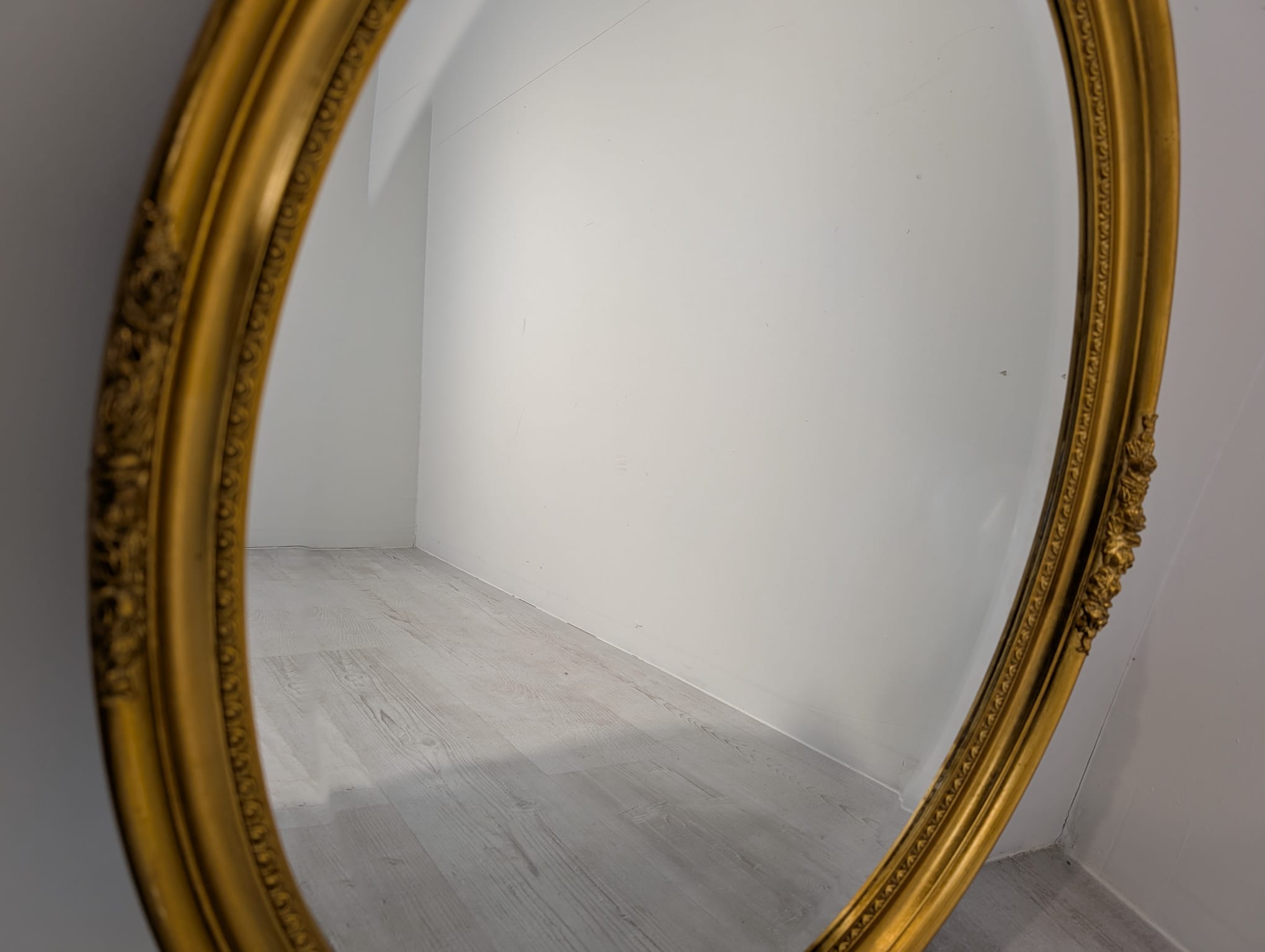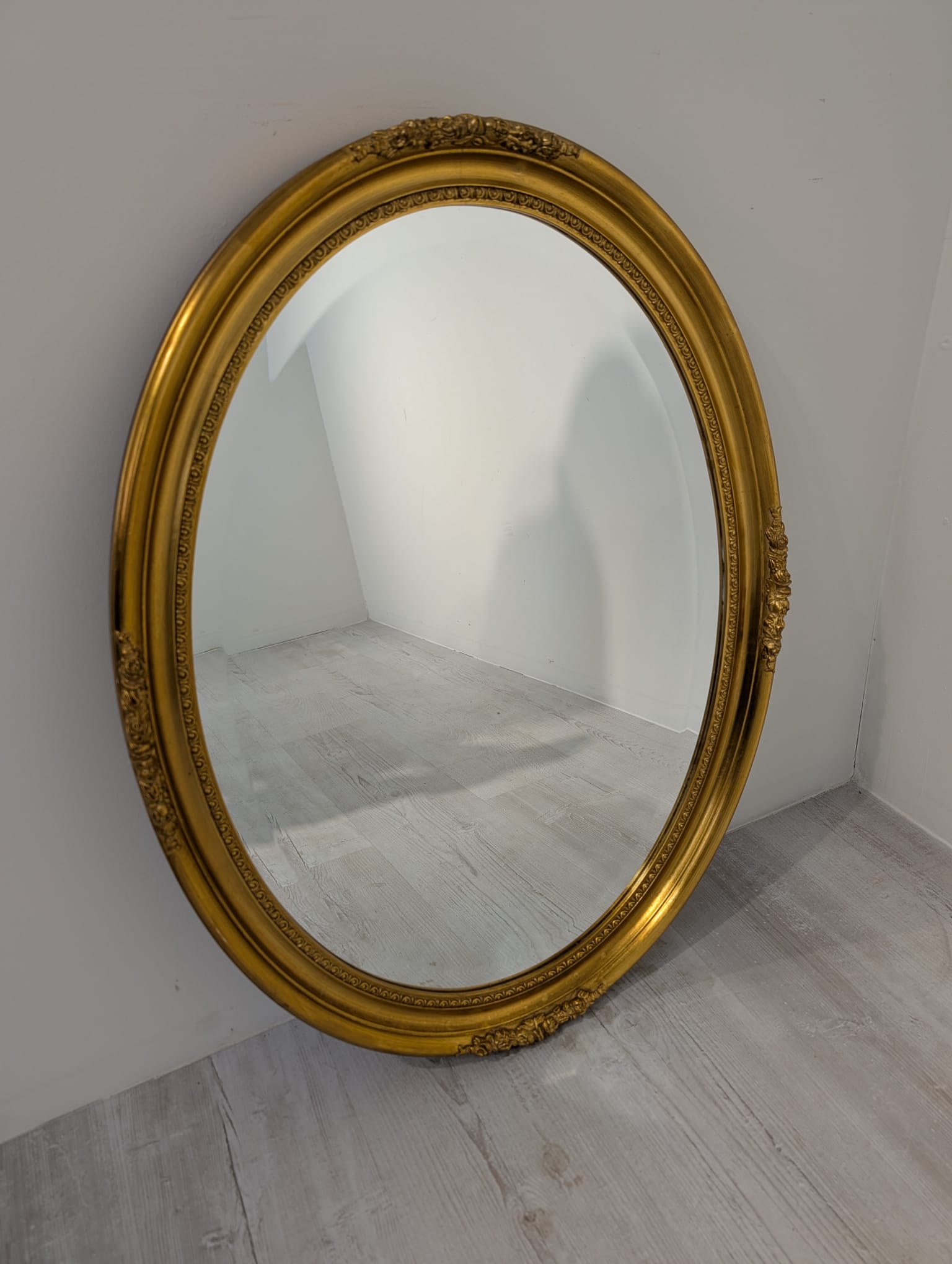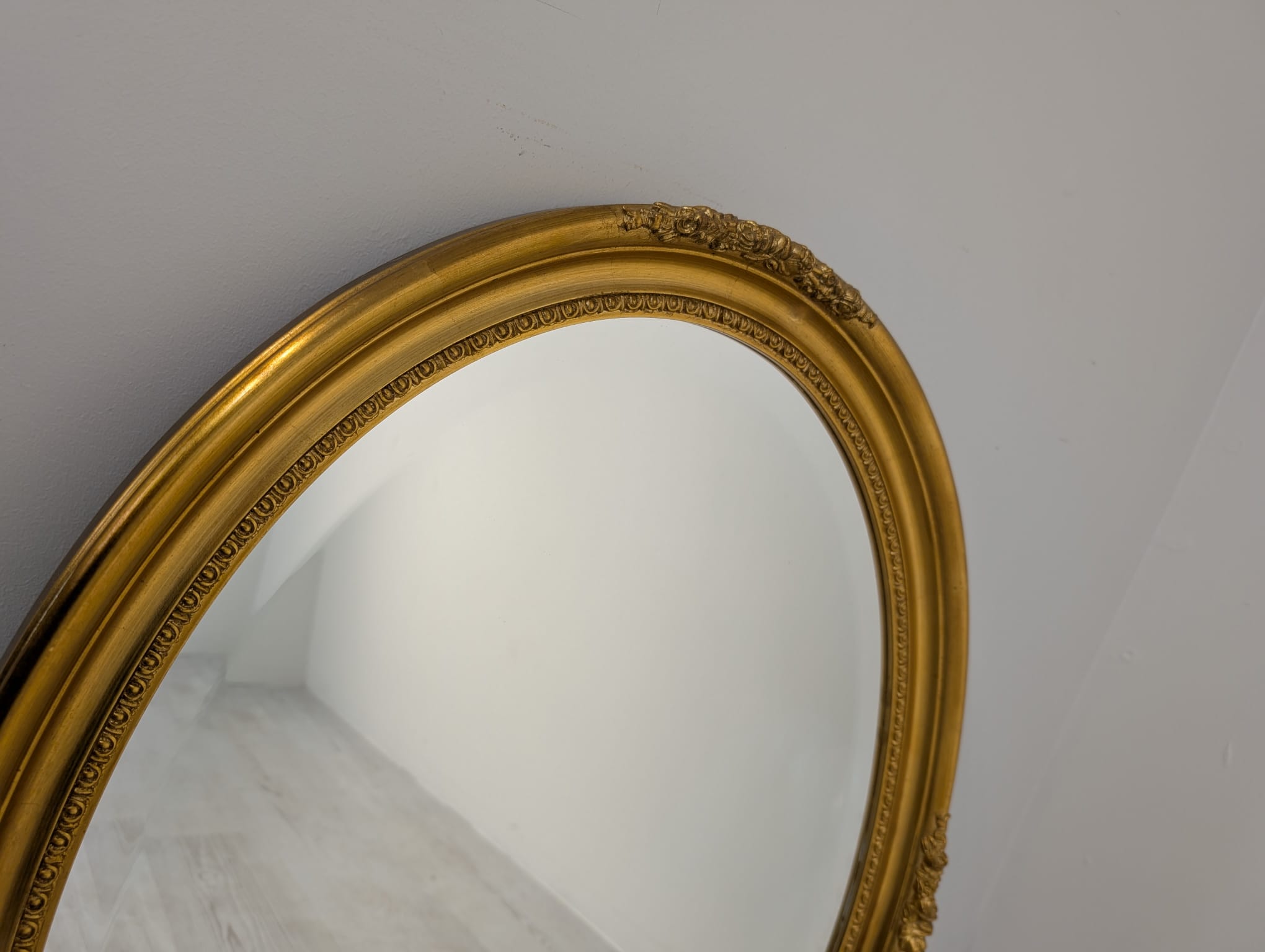 Lustro owalne w drewnianej złotej ramie fazowane