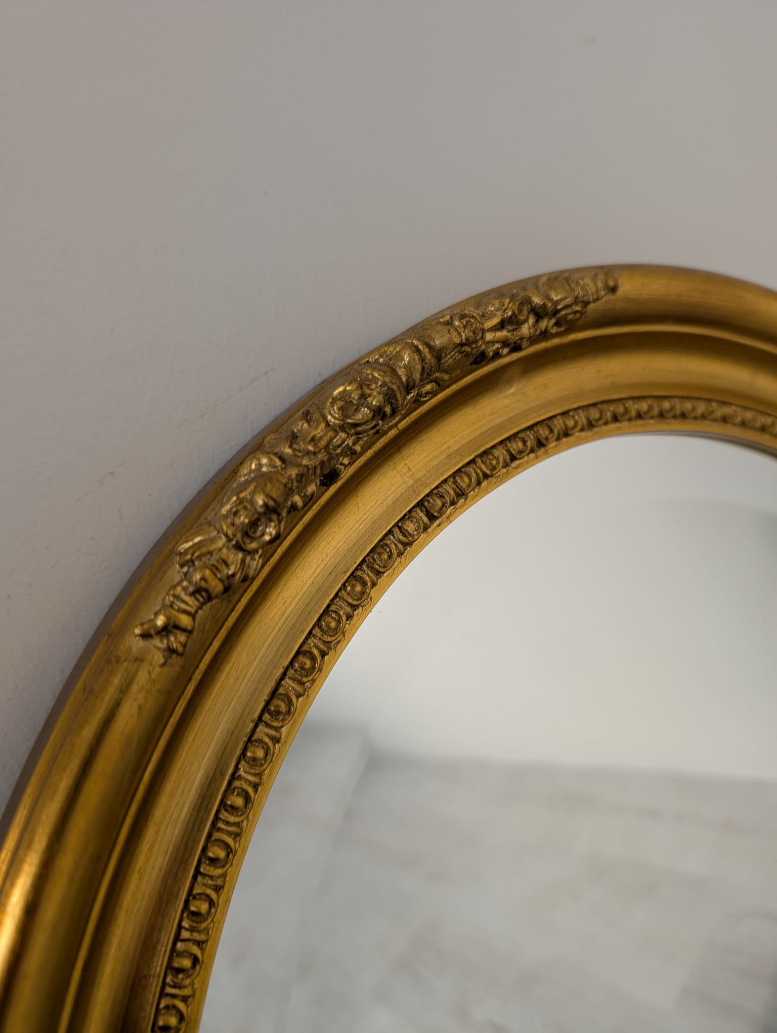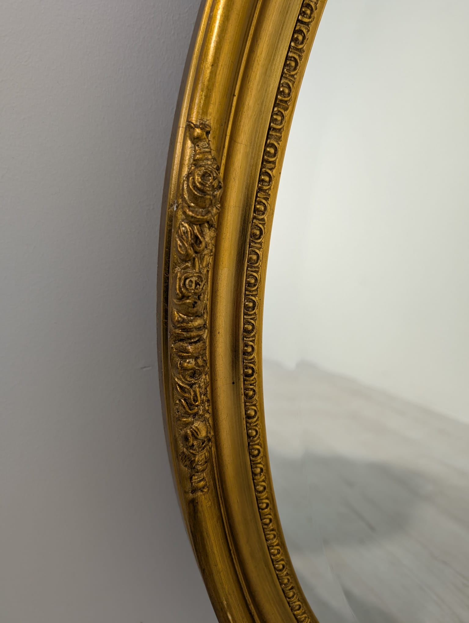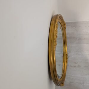 Eleganckie, złote owalne lustro w drewnianej, zdobionej ramie. Doskonale uzupełni każde wnętrze, nadając mu klasycznego i stylowego charakteru.