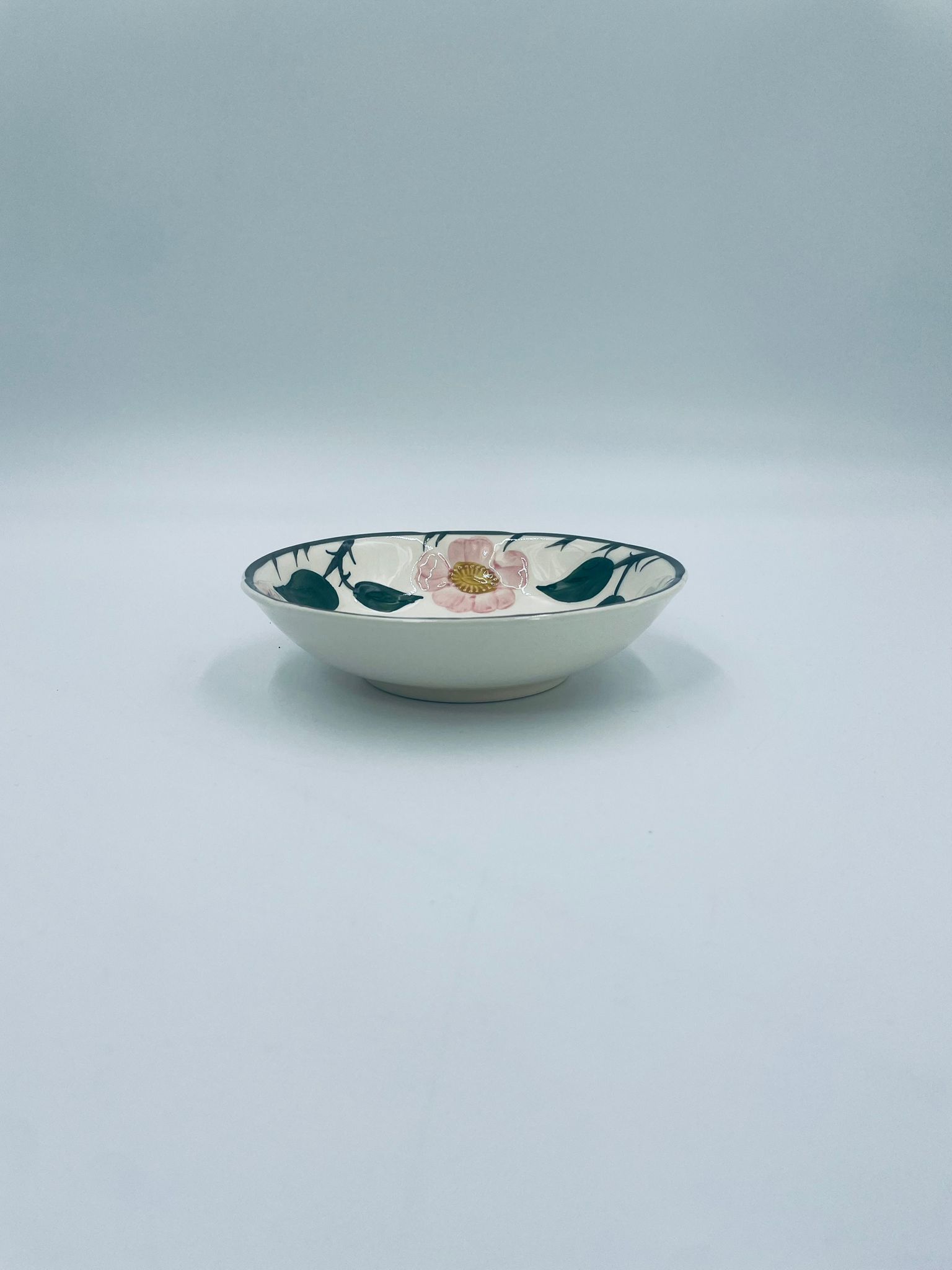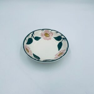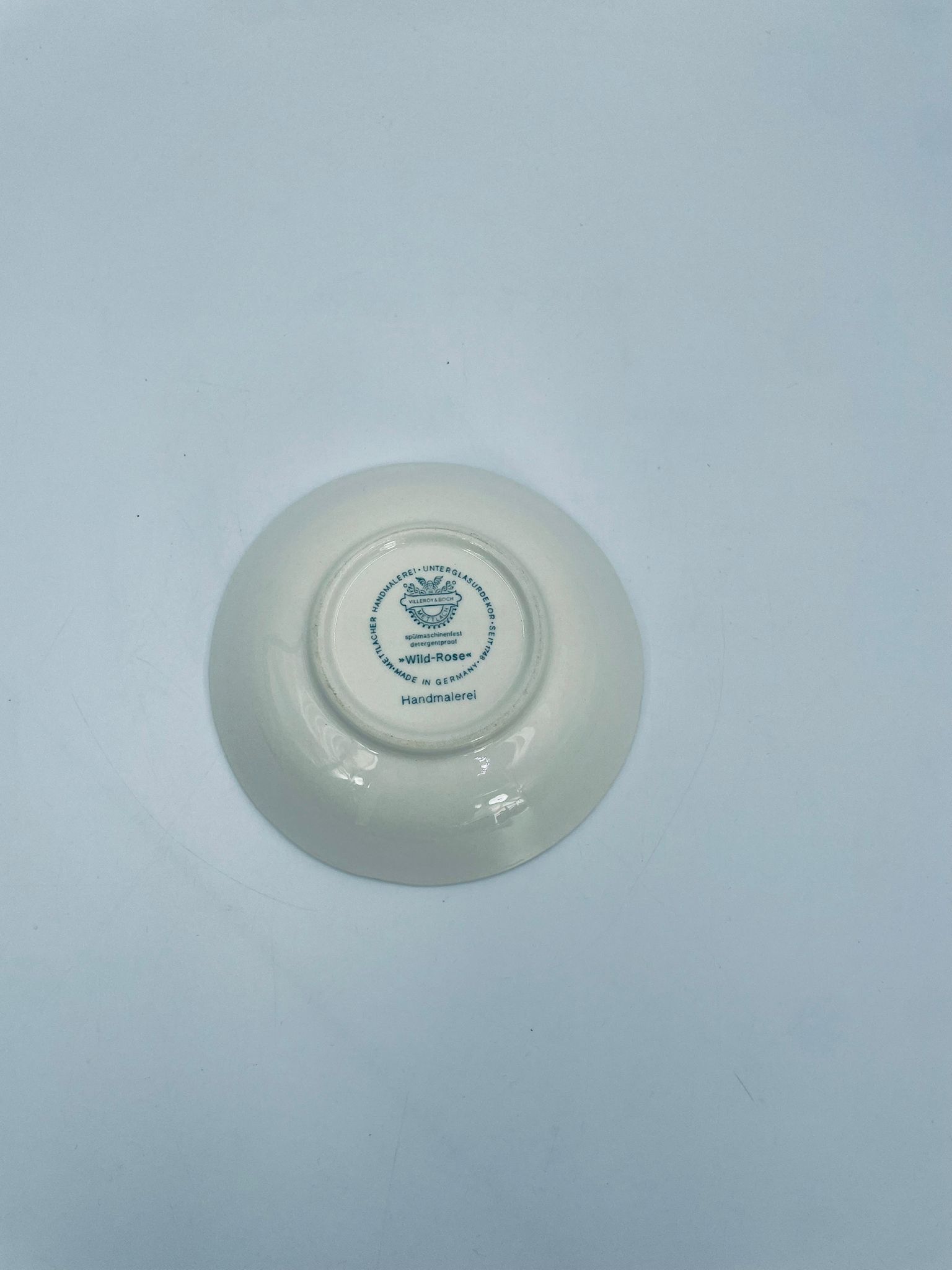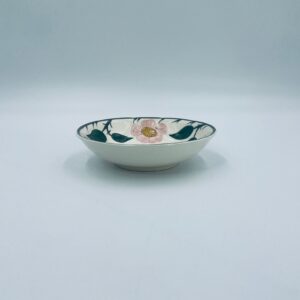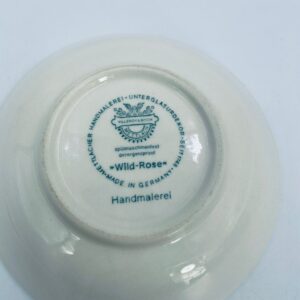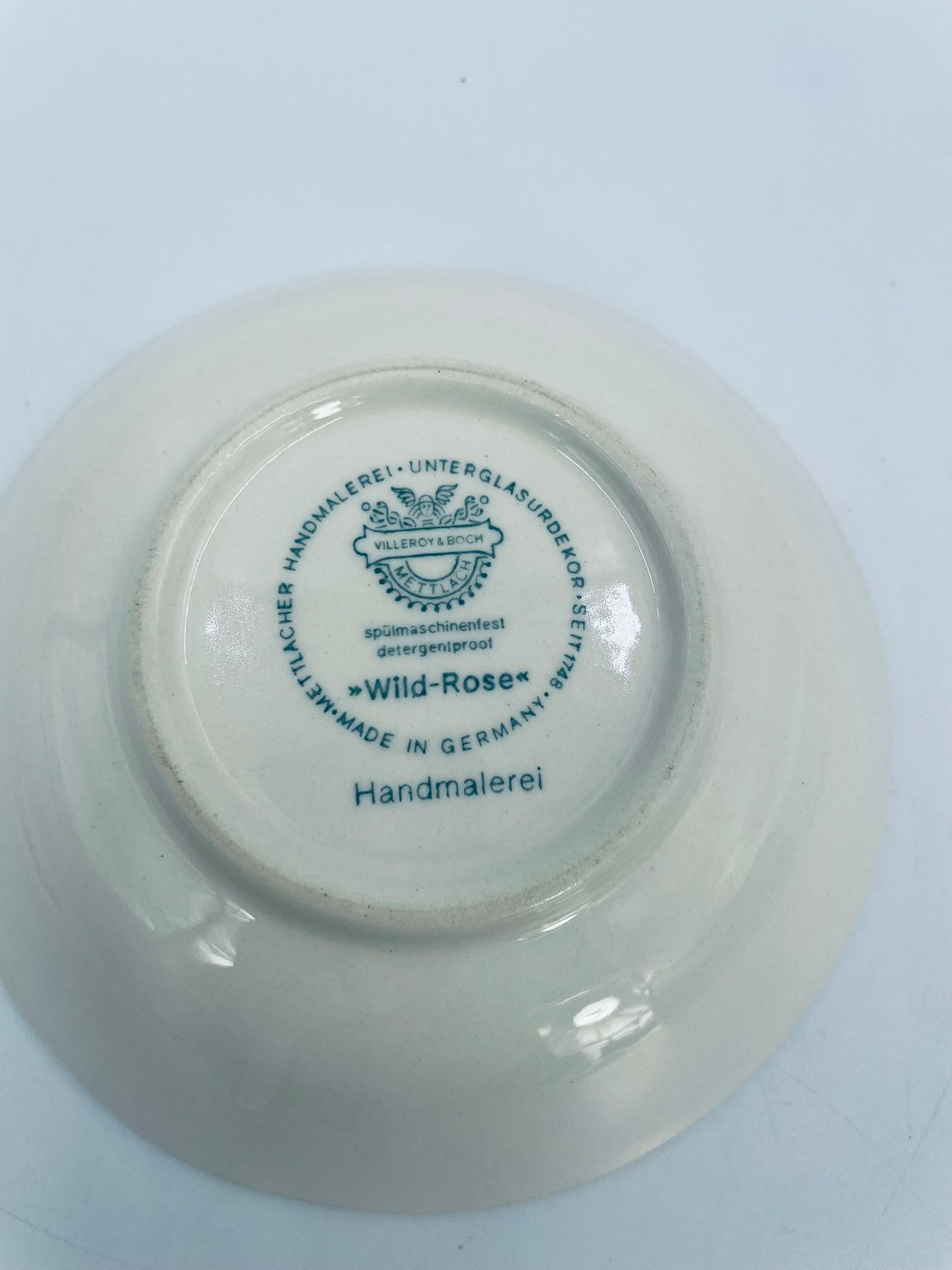 Mała miseczka renomowanej wytwórni Villeroy & Boch z kolekcji Wildrose, zaprojektowanej w 1969r, wykonana z wysokiej jakości porcelany w kolorze ecru. Miseczka charakteryzuje się ręcznie wykonanymi, wypukłymi reliefami przedstawiającymi ręcznie malowane kwiaty dzikiej róży, wykończona zieloną obwódką na lekko falistym rancie.
