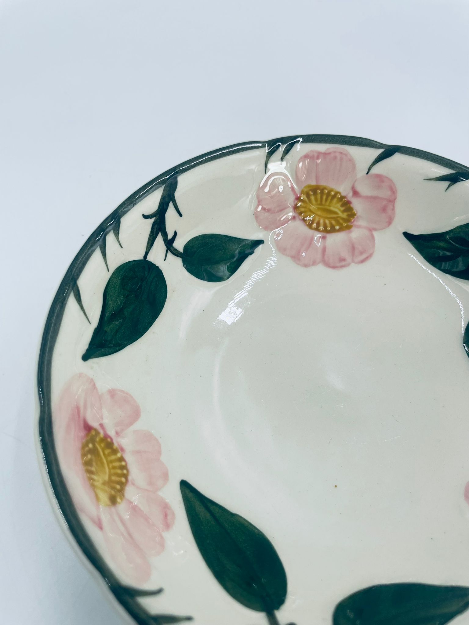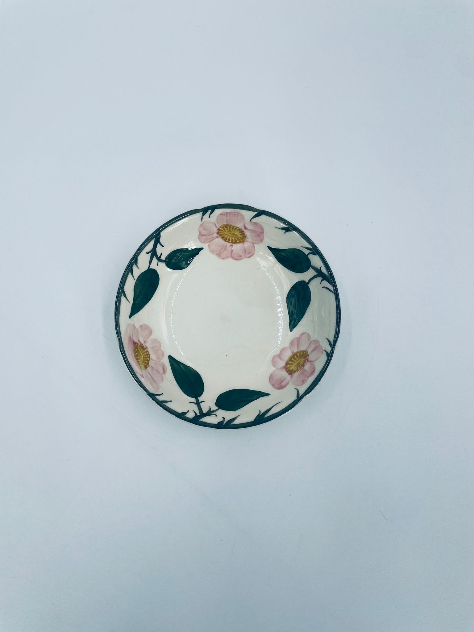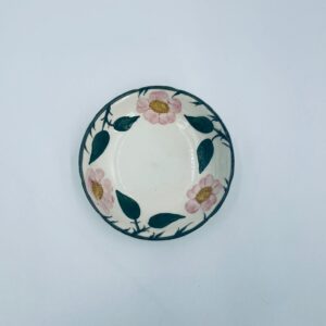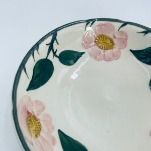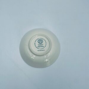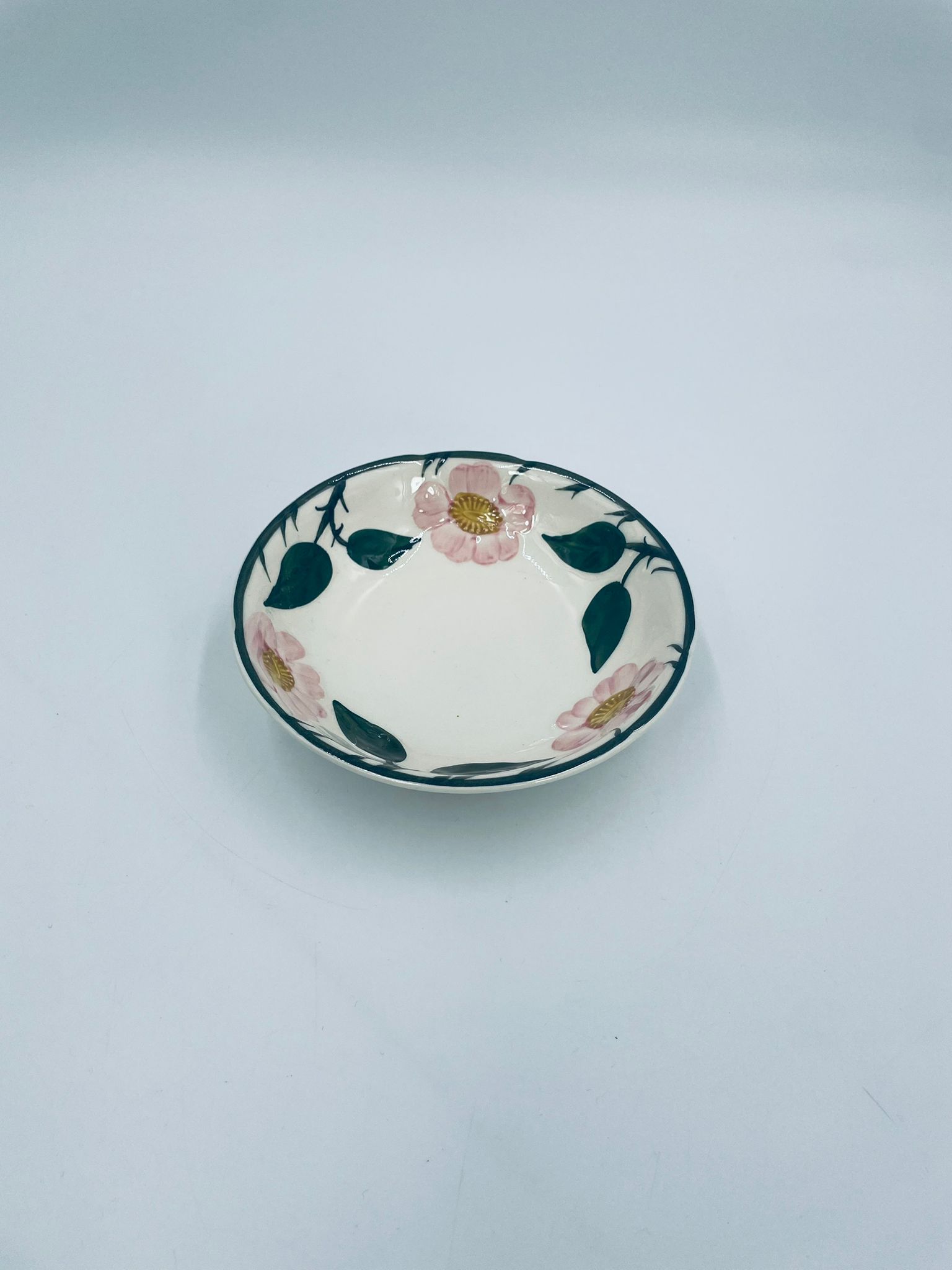 Mała miseczka renomowanej wytwórni Villeroy & Boch z kolekcji Wildrose, zaprojektowanej w 1969r, wykonana z wysokiej jakości porcelany w kolorze ecru. Miseczka charakteryzuje się ręcznie wykonanymi, wypukłymi reliefami przedstawiającymi ręcznie malowane kwiaty dzikiej róży, wykończona zieloną obwódką na lekko falistym rancie.