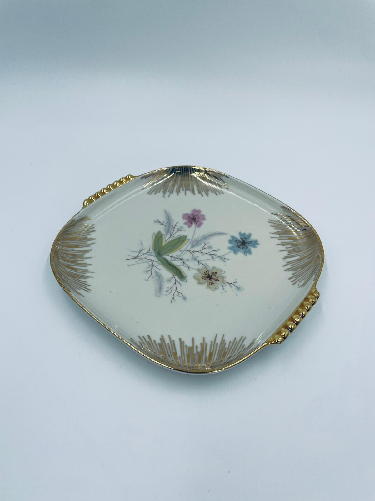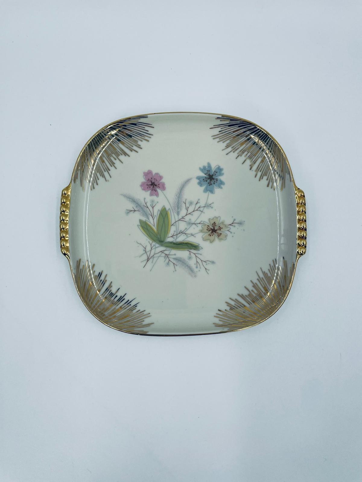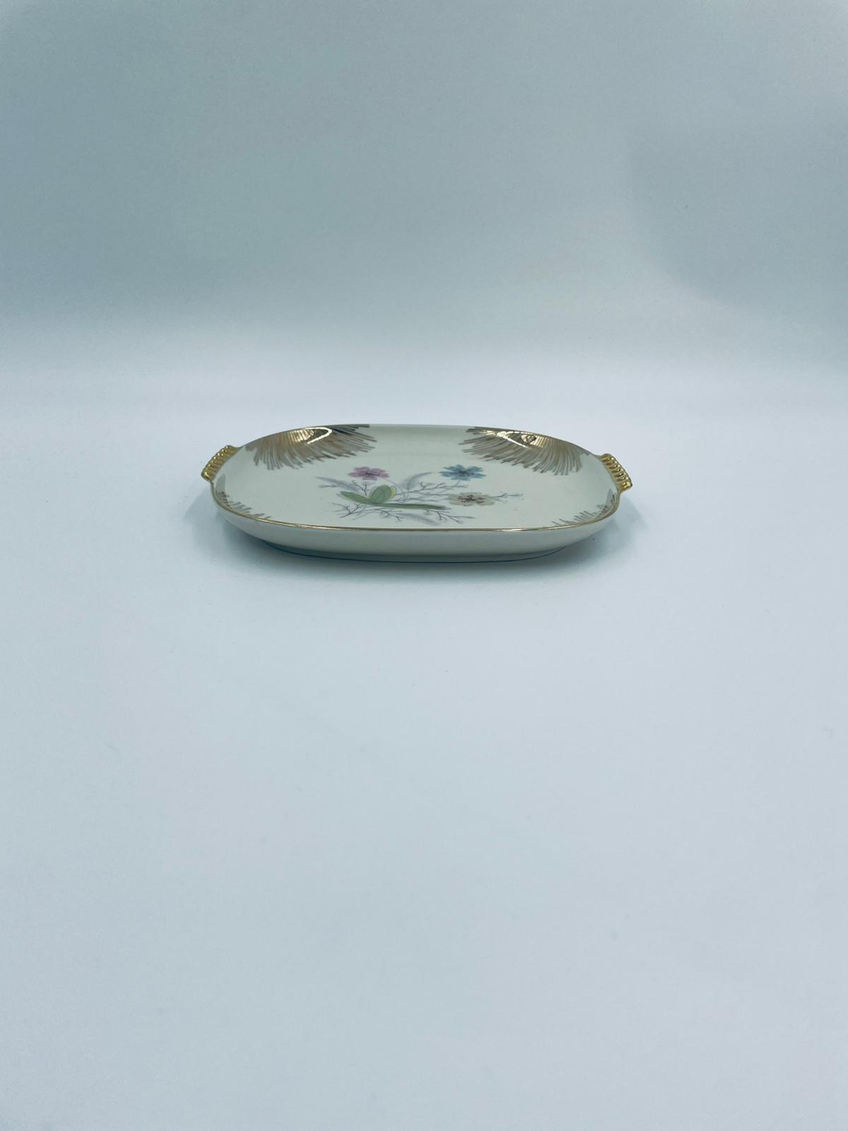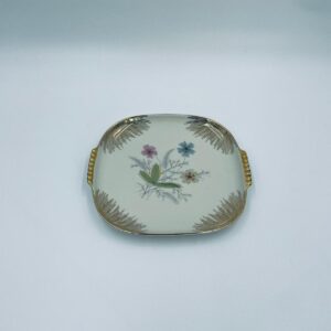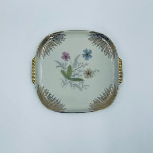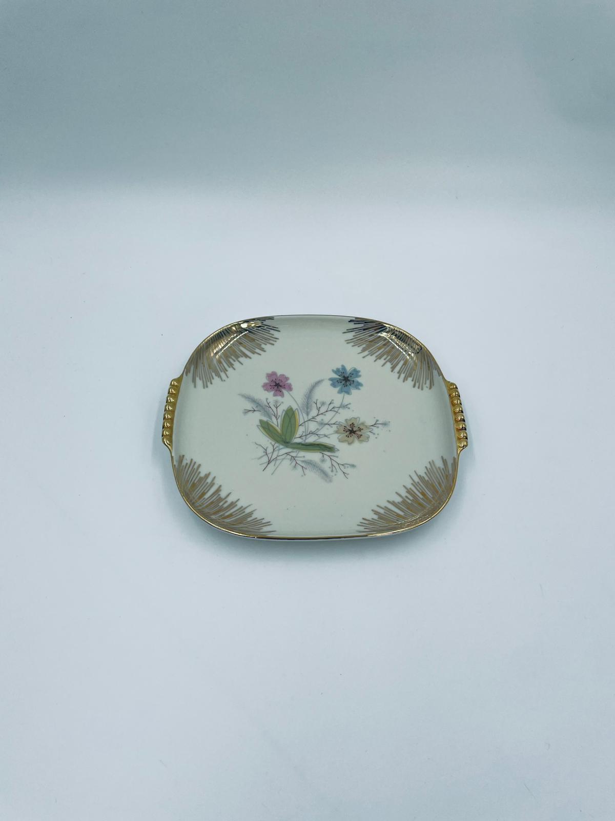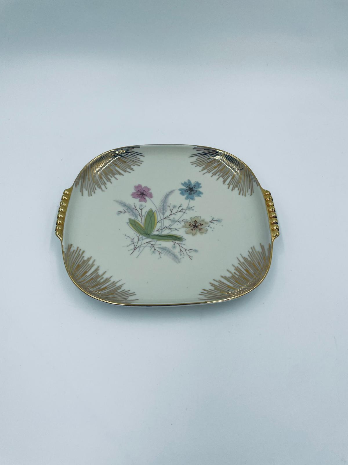 Mała patera, talerzyk wytwórni Wunsiedel Bavaria, model Claudia, wykonana z wysokiej jakości porcelany w kolorze ecru. Panterka kwadratowa z zaokrąglonymi rogami, charakteryzuje się dwoma ozdobnymi, złotymi uchwytami, ręcznie malowana dekoracją kwiatową, złotymi akcentami oraz złoceniem na krawędzi.