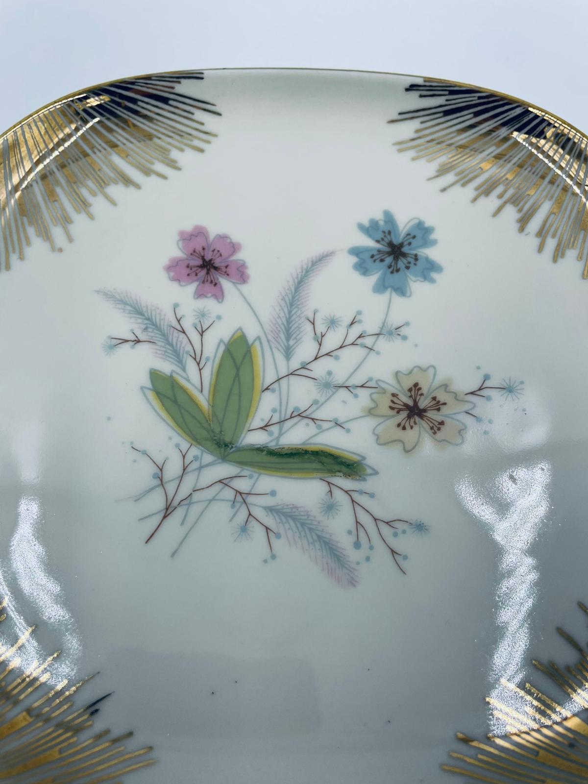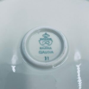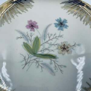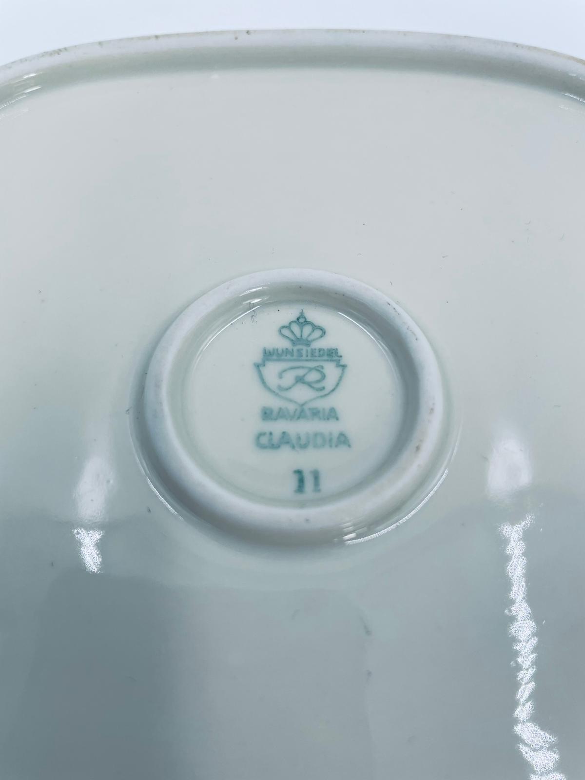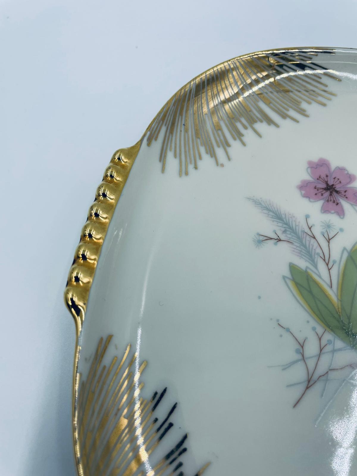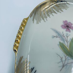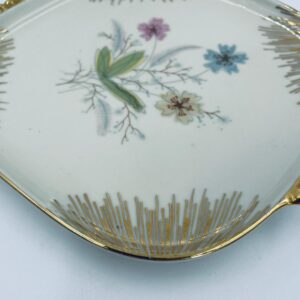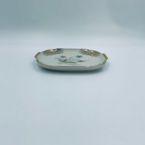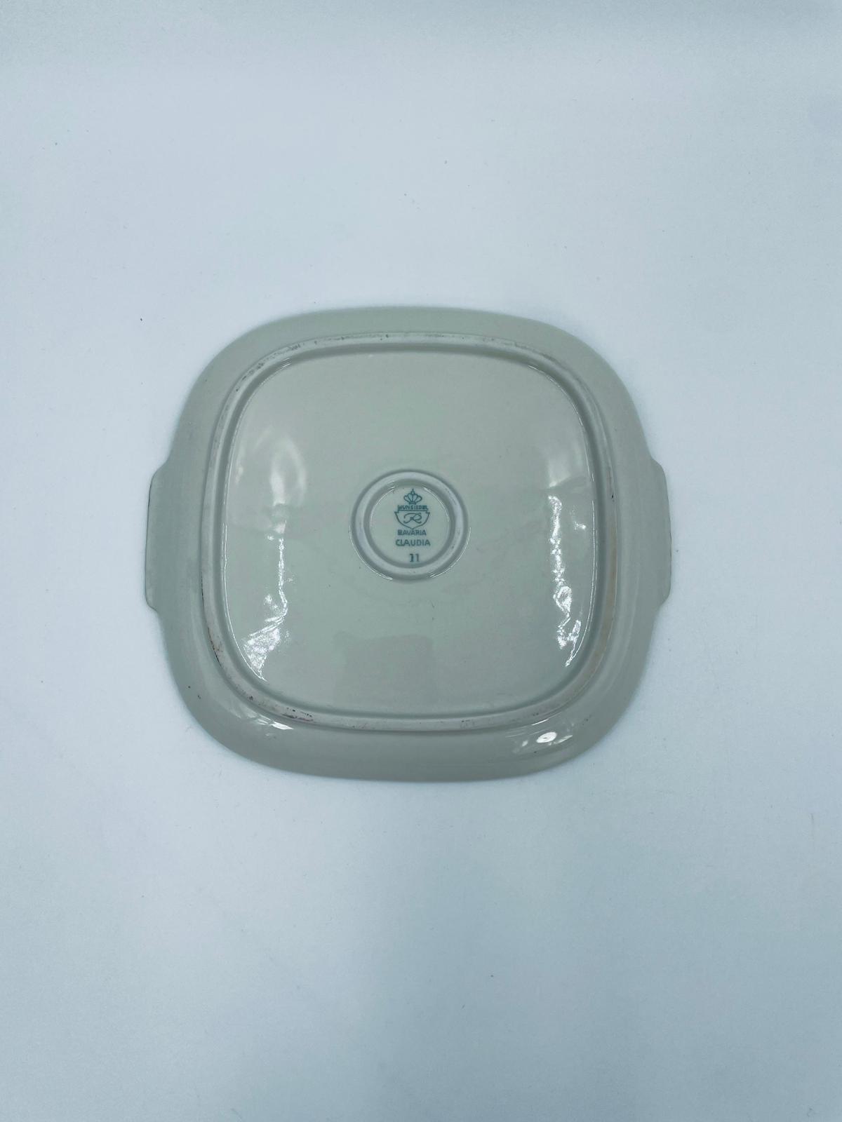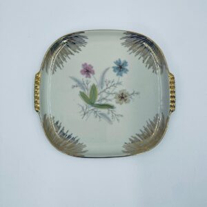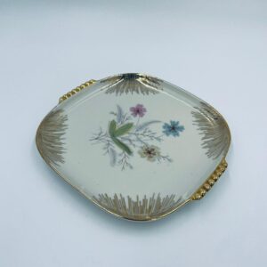 Mała patera, talerzyk wytwórni Wunsiedel Bavaria, model Claudia, wykonana z wysokiej jakości porcelany w kolorze ecru. Panterka kwadratowa z zaokrąglonymi rogami, charakteryzuje się dwoma ozdobnymi, złotymi uchwytami, ręcznie malowana dekoracją kwiatową, złotymi akcentami oraz złoceniem na krawędzi.