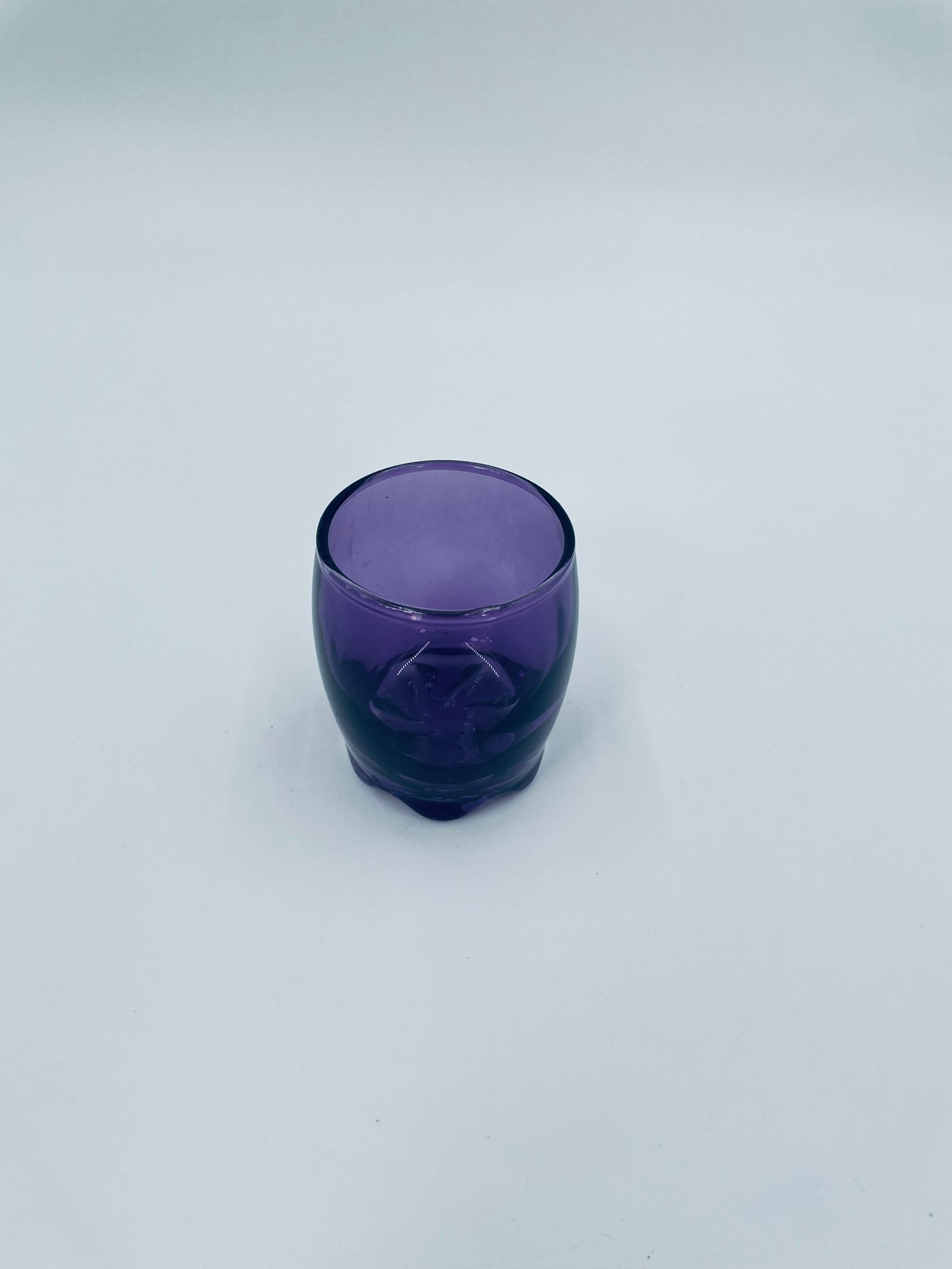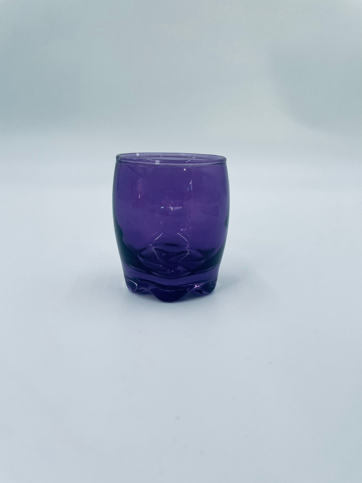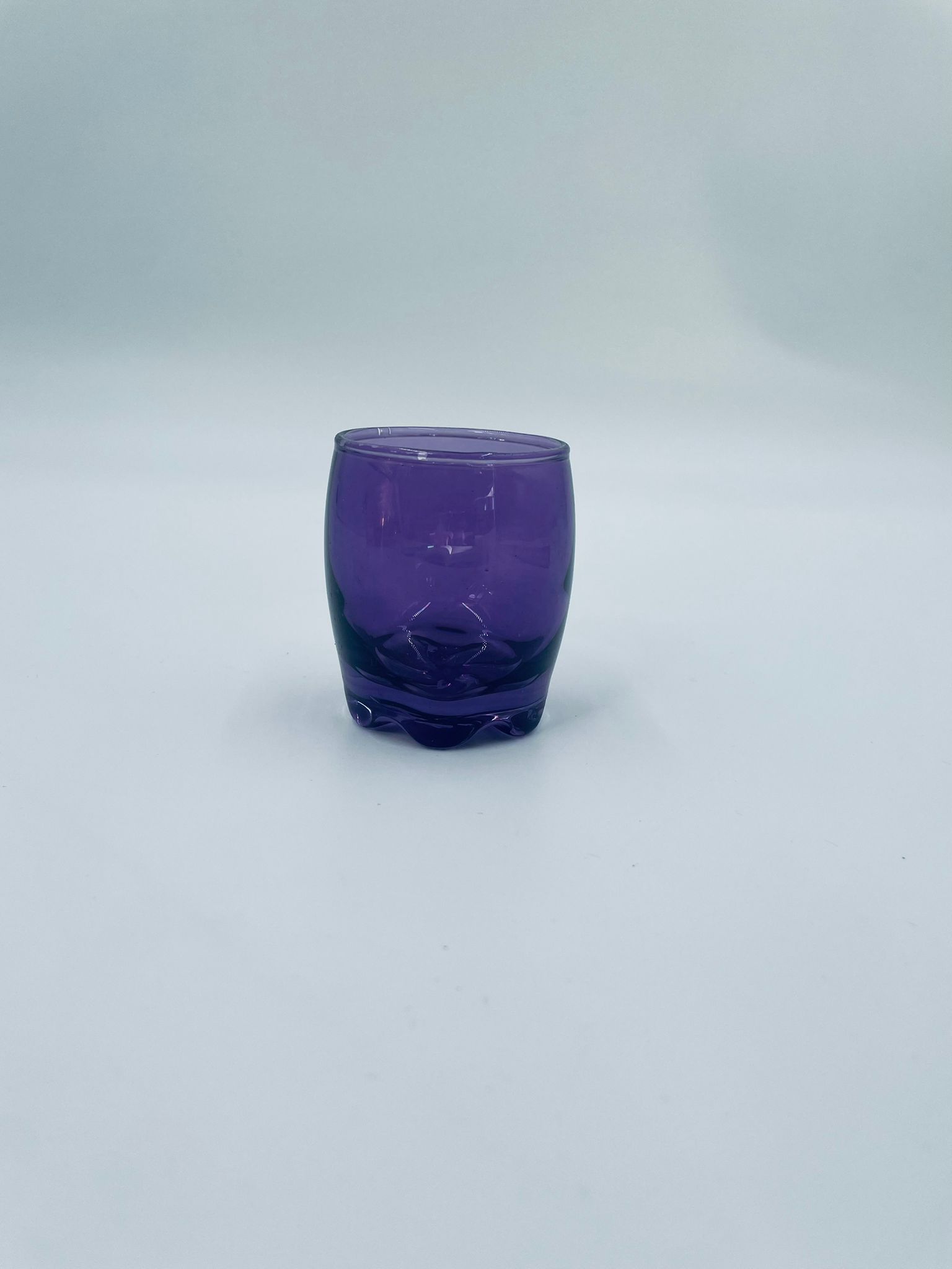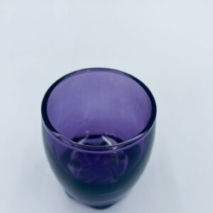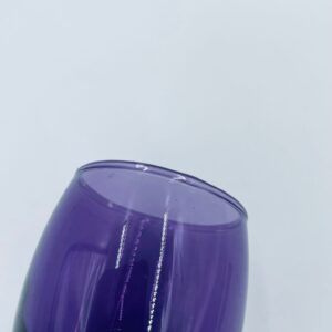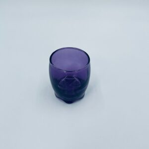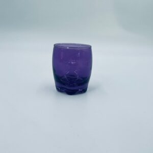 Mała szklaneczka, kieliszek w stylu Vintage, wykonana z wysokiej jakości hartowanego. Szklaneczka z falistą ozdobną podstawa, barwiona na fioletowy kolor. Posiada przetarcie na kolorze.