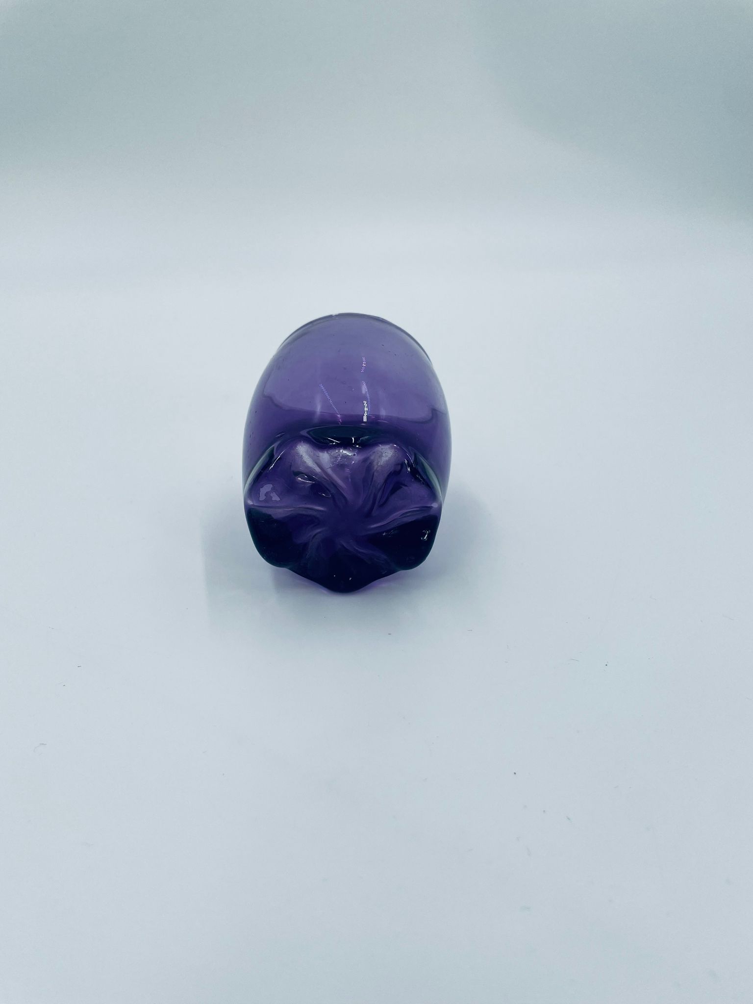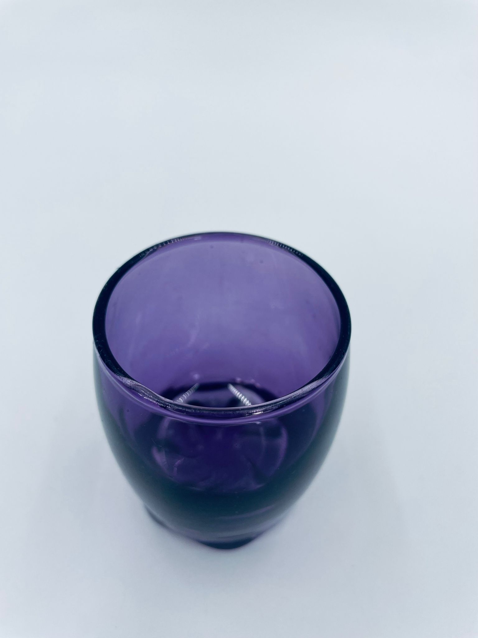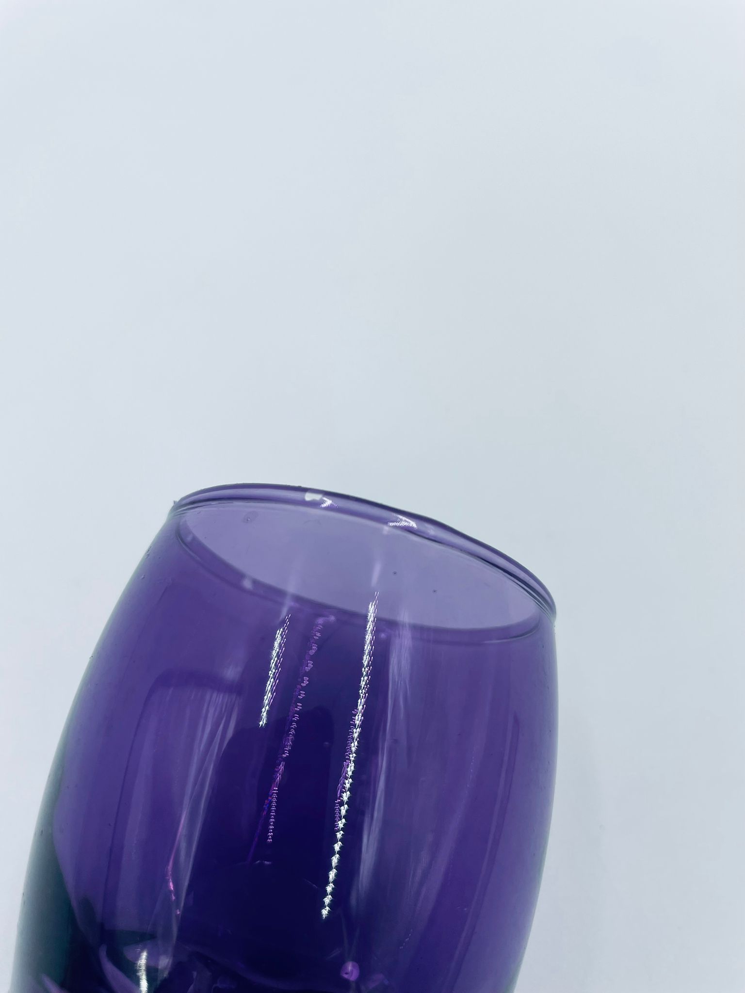 Mała szklaneczka, kieliszek w stylu Vintage, wykonana z wysokiej jakości hartowanego. Szklaneczka z falistą ozdobną podstawa, barwiona na fioletowy kolor. Posiada przetarcie na kolorze.