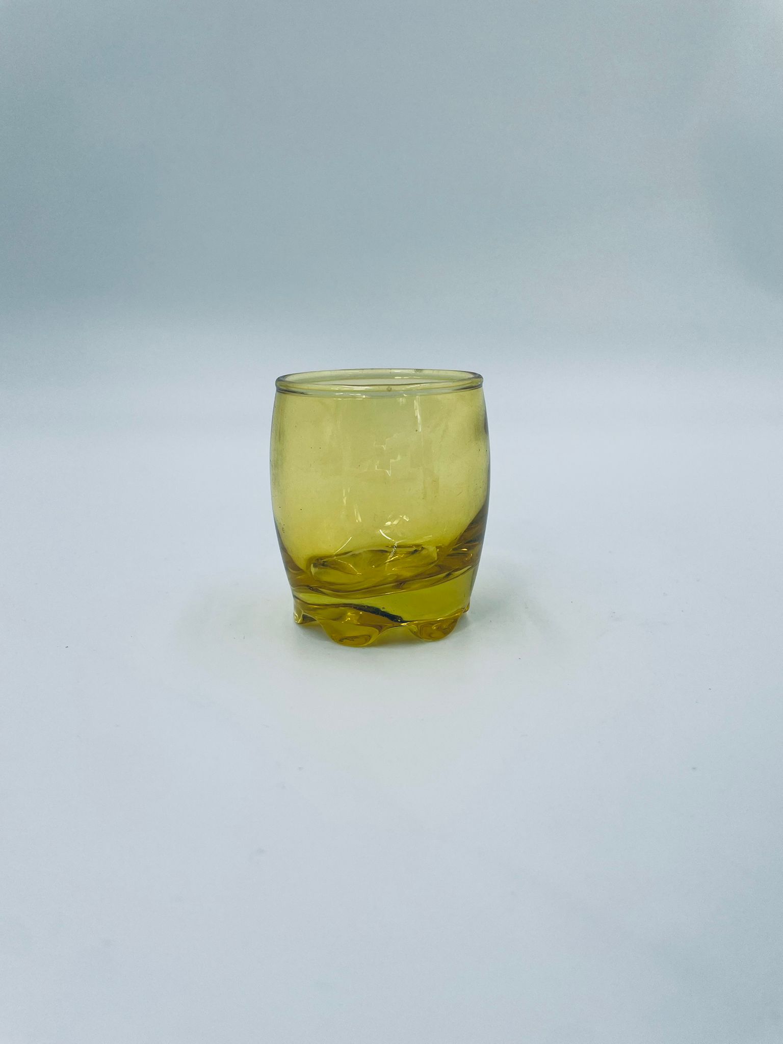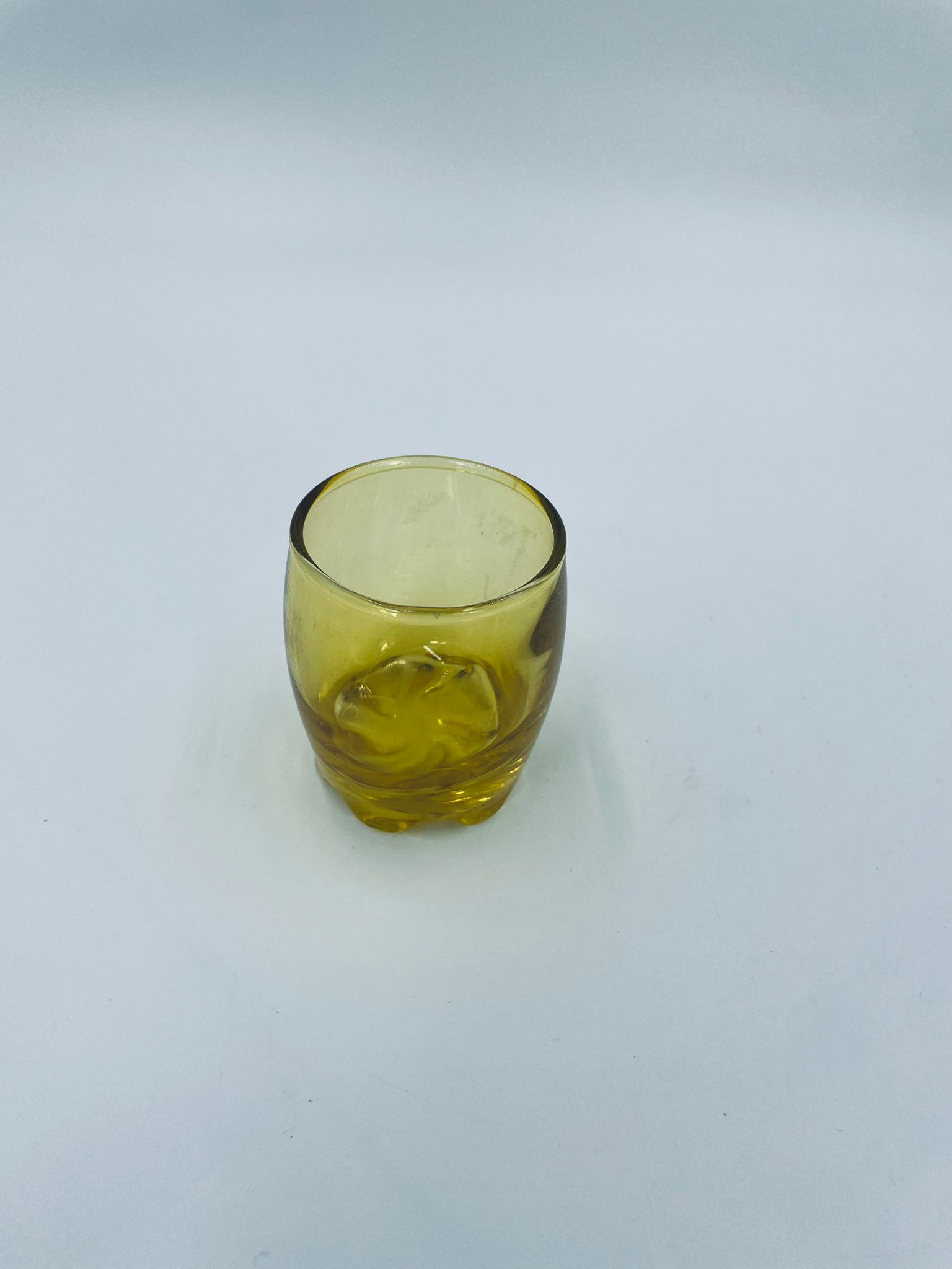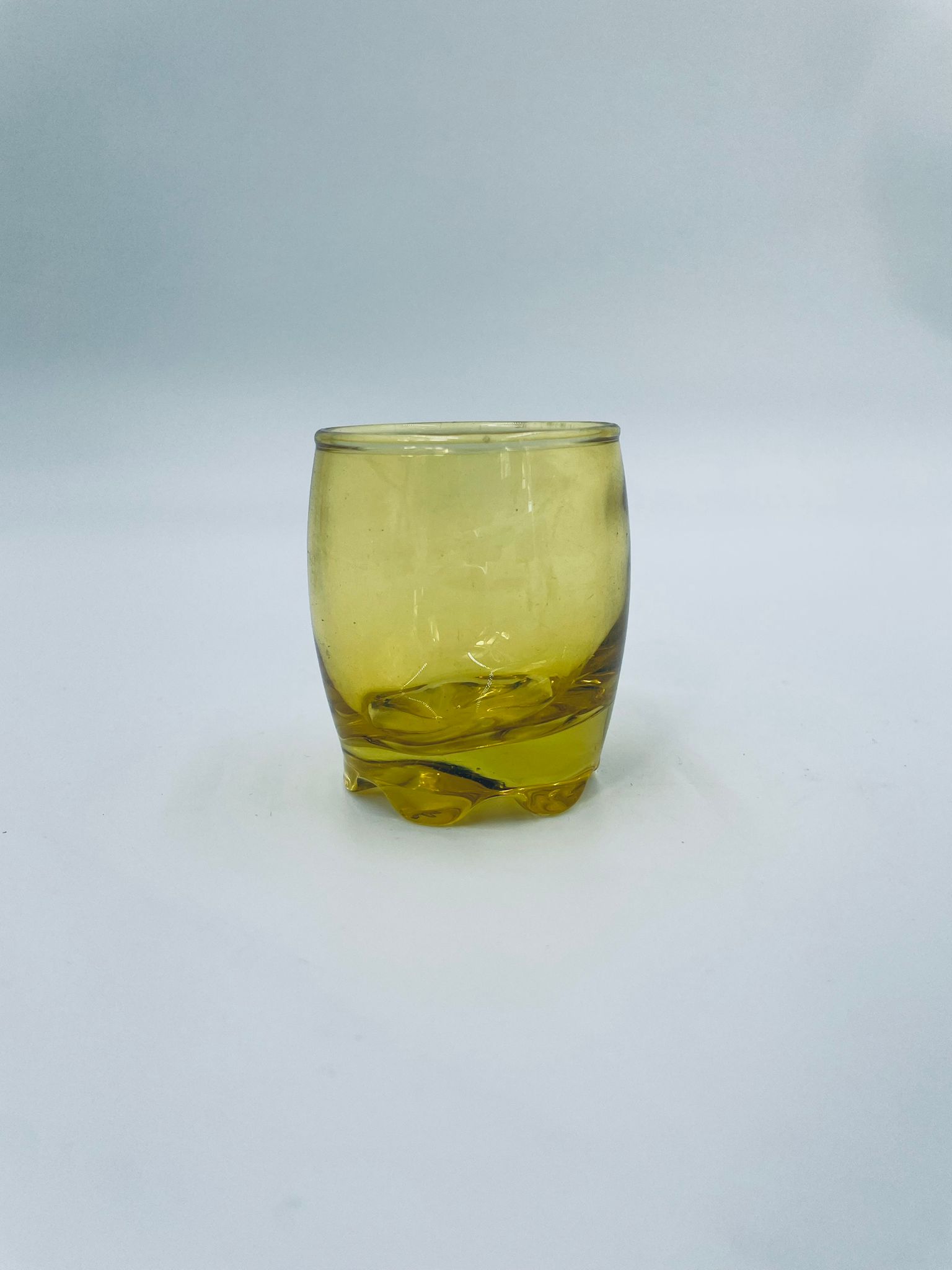Mała szklaneczka, kieliszek w stylu Vintage, wykonana z wysokiej jakości hartowanego. Szklaneczka z falistą ozdobną podstawa, barwiona na żółty kolor.