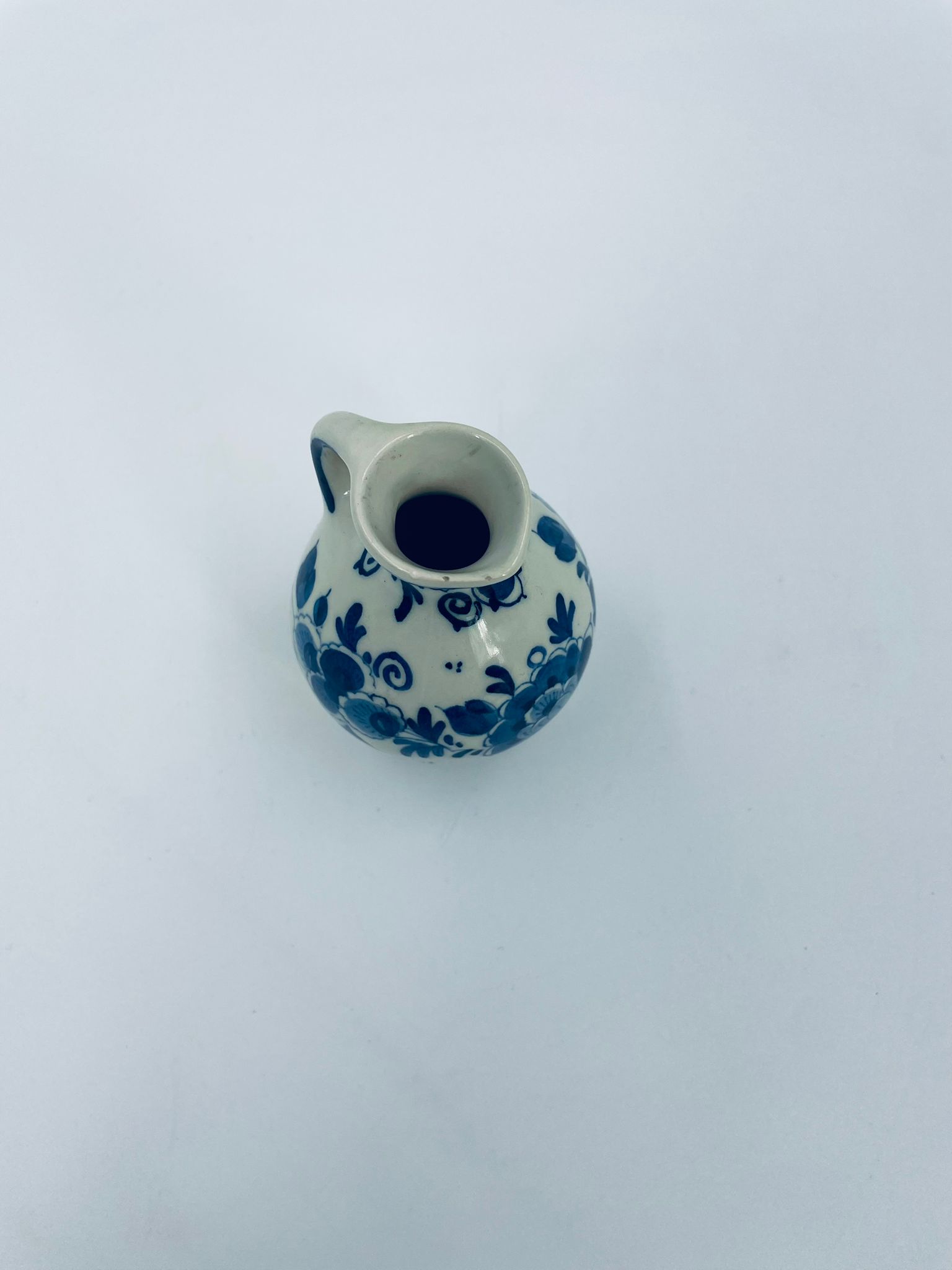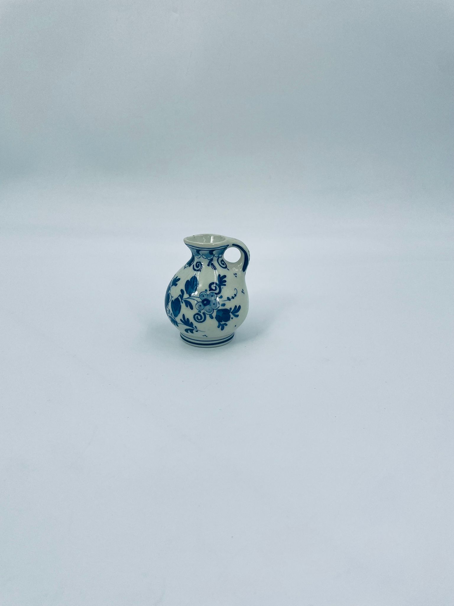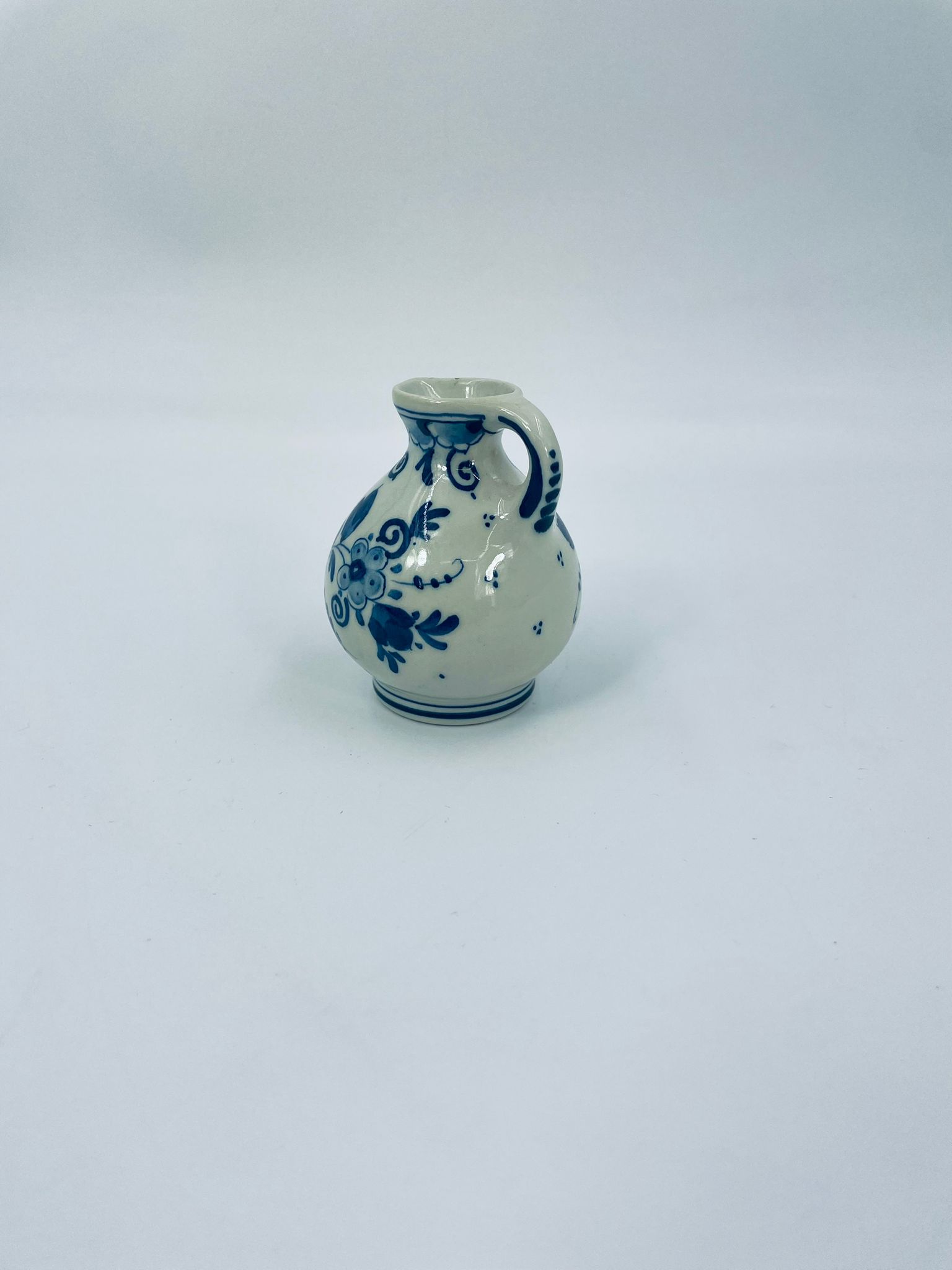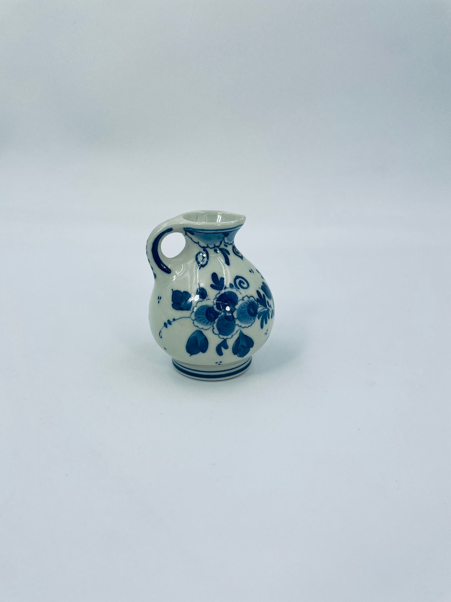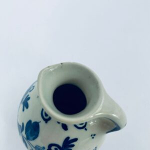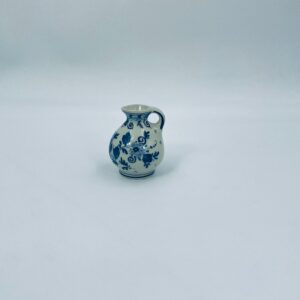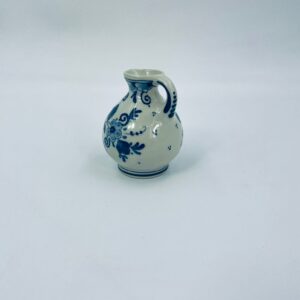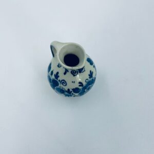 Mały dzbanuszek w stylu Delft, Made in Holland, wykonany z ceramiki w kolorze ecru. Charakteryzuje się niebieskim kwiatowym motywem. Może służyć jako dzbanuszek na mleko, śmietankę, mały wazonik na małego pojedynczego kwiatka lub jako element dekoracyjny. Posiada małe odpryski na górnym rancie.