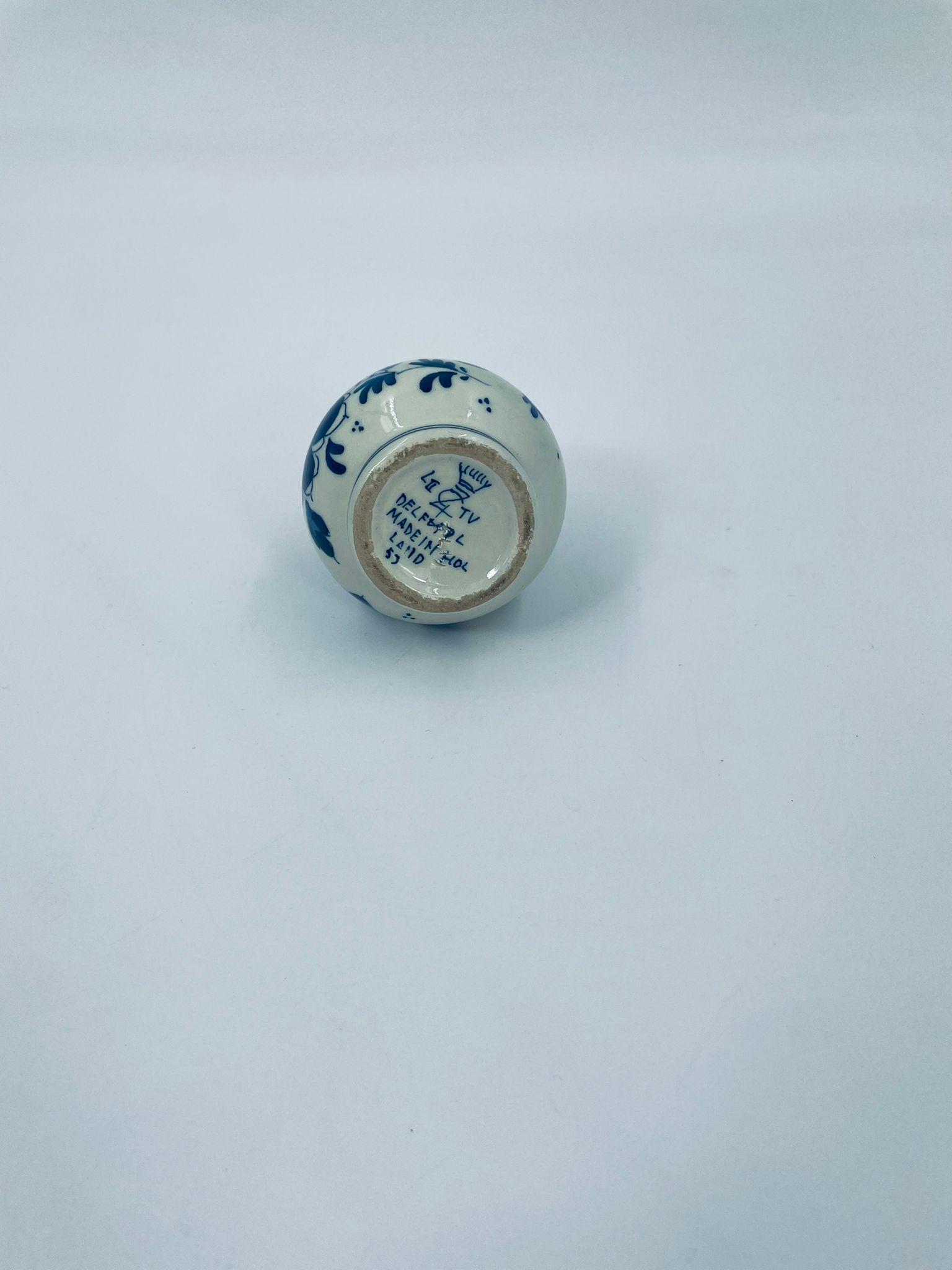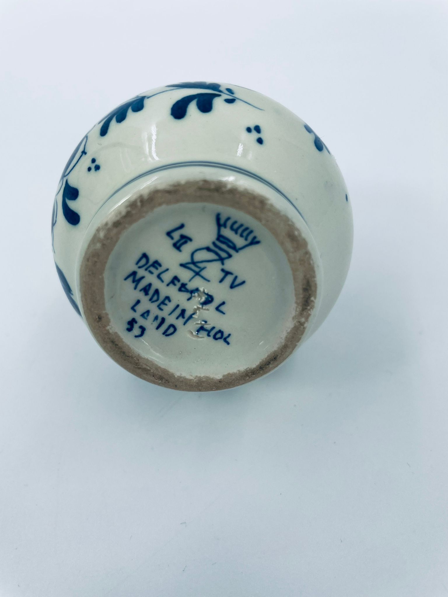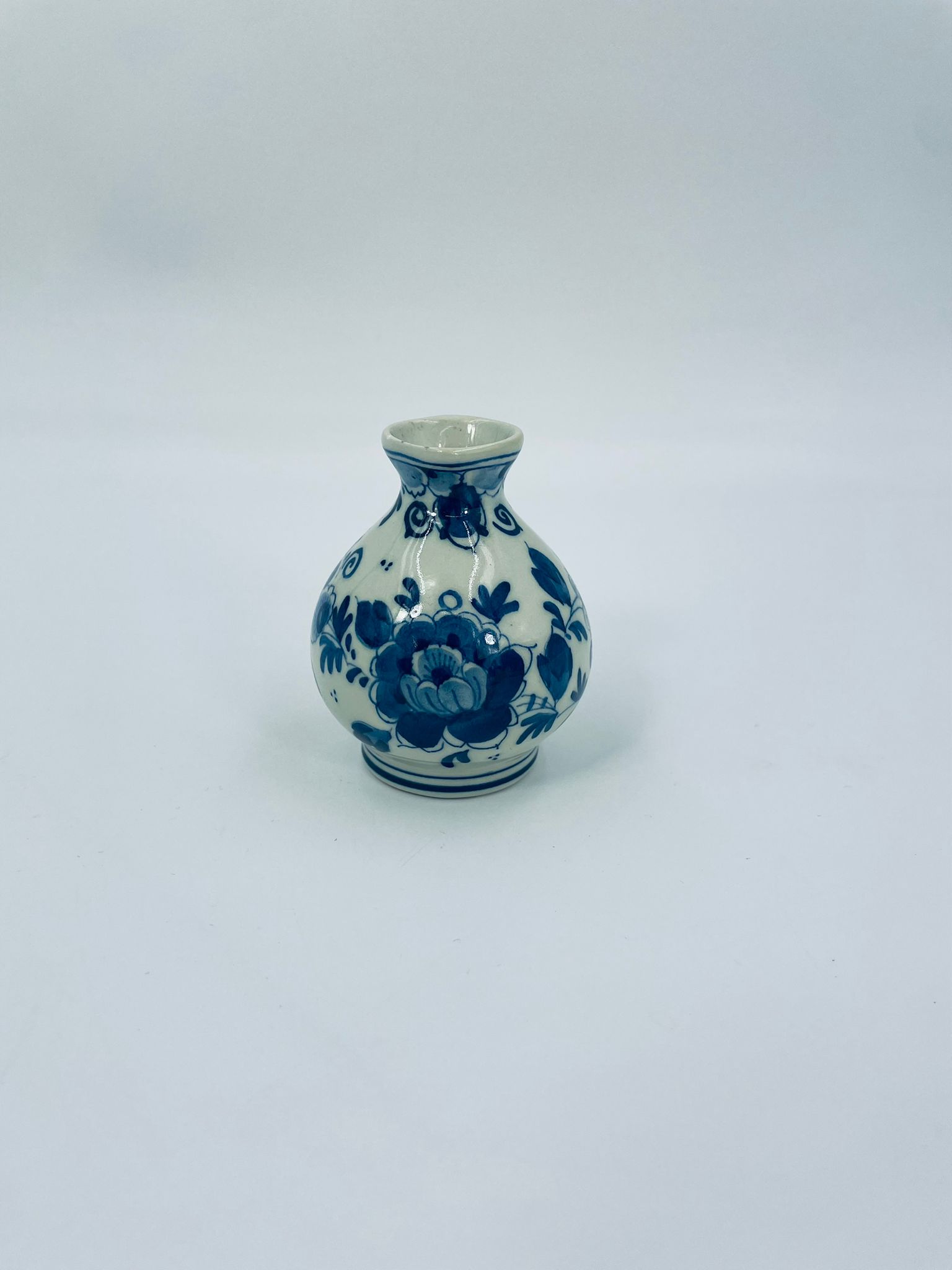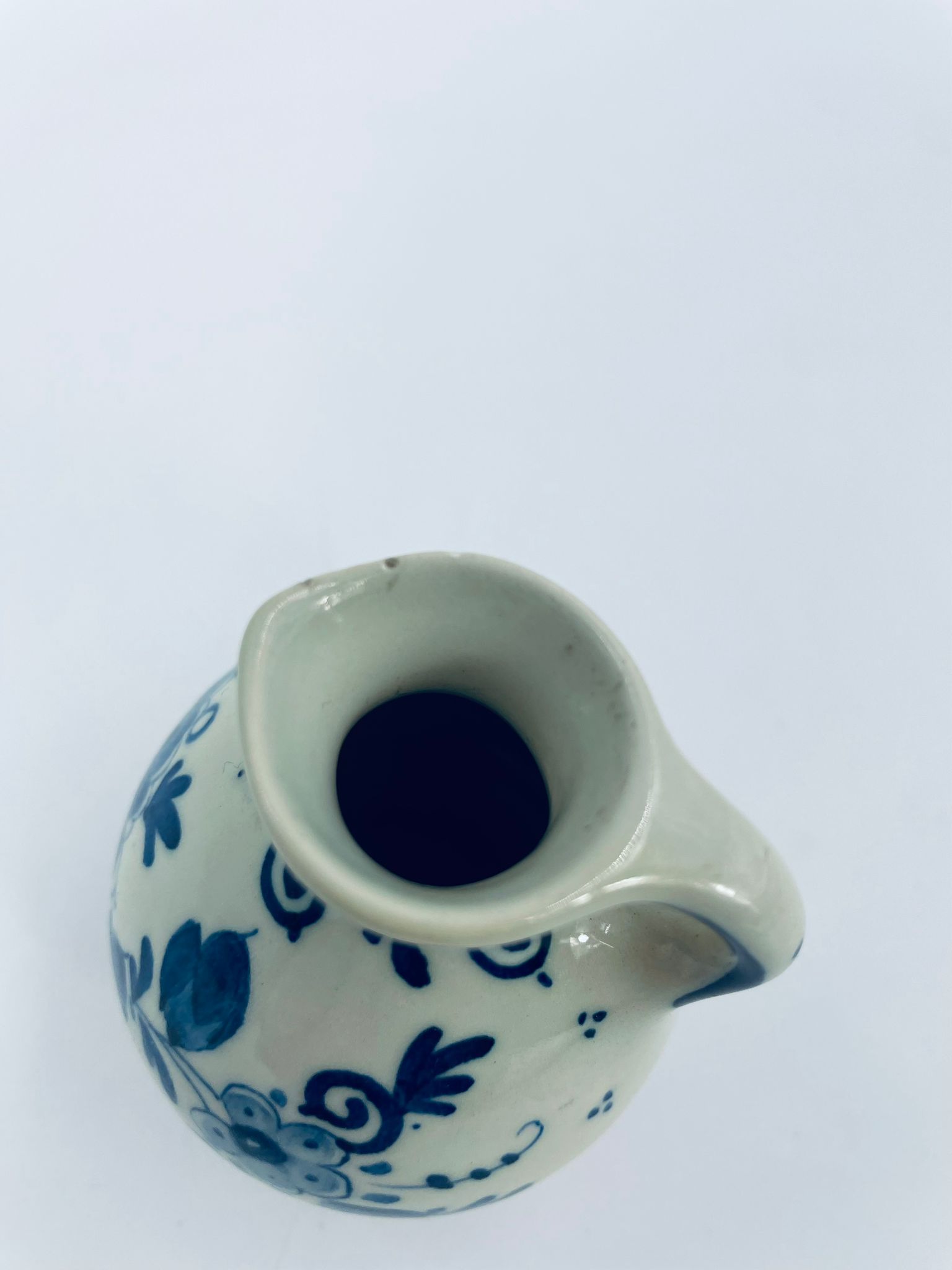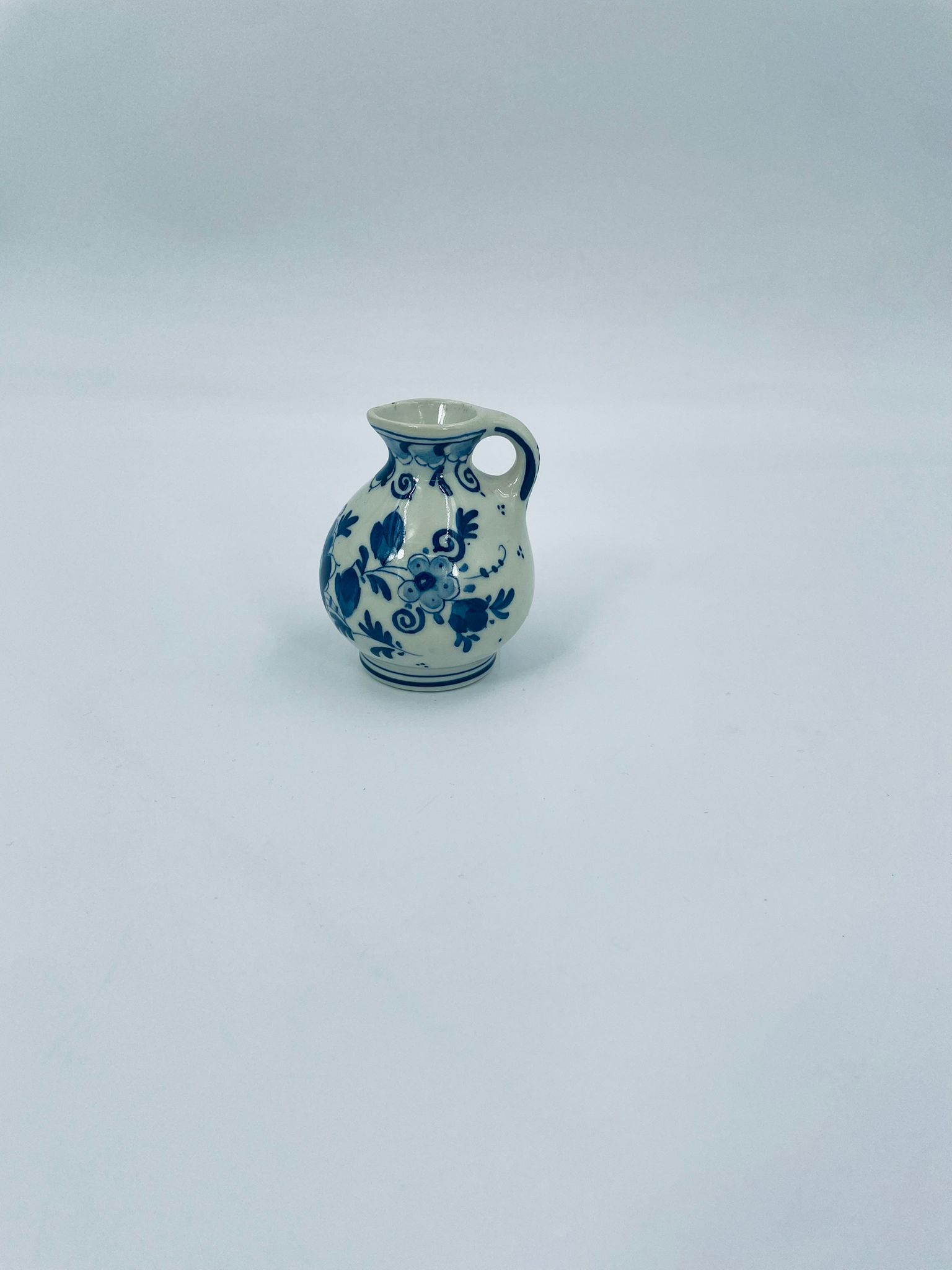 Mały dzbanuszek w stylu Delft, Made in Holland, wykonany z ceramiki w kolorze ecru. Charakteryzuje się niebieskim kwiatowym motywem. Może służyć jako dzbanuszek na mleko, śmietankę, mały wazonik na małego pojedynczego kwiatka lub jako element dekoracyjny. Posiada małe odpryski na górnym rancie.