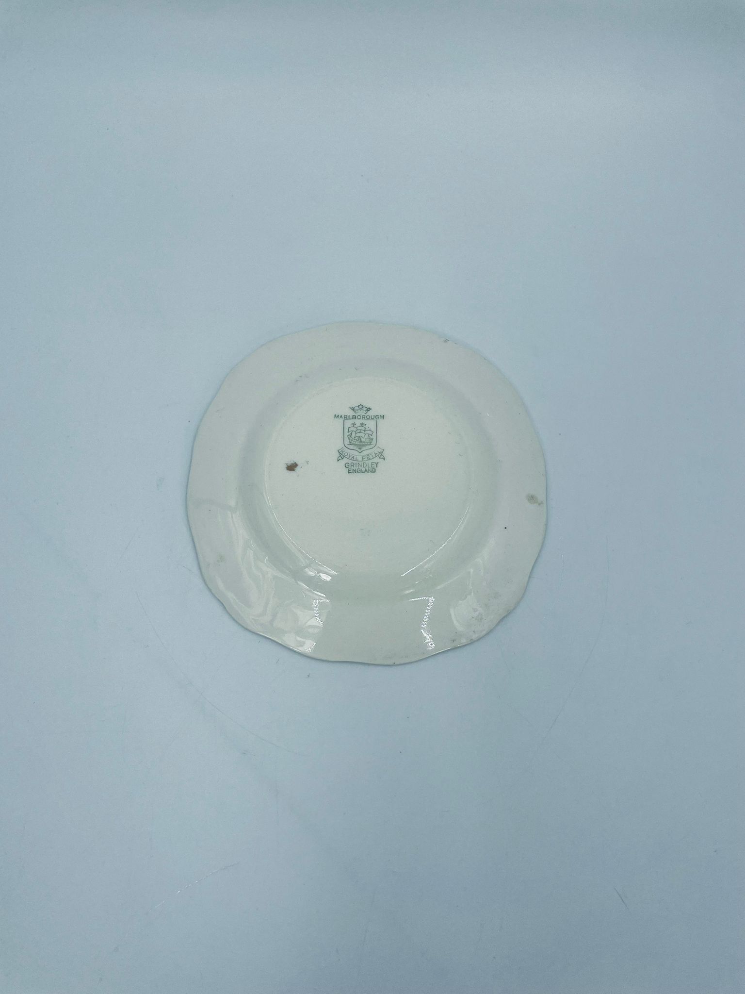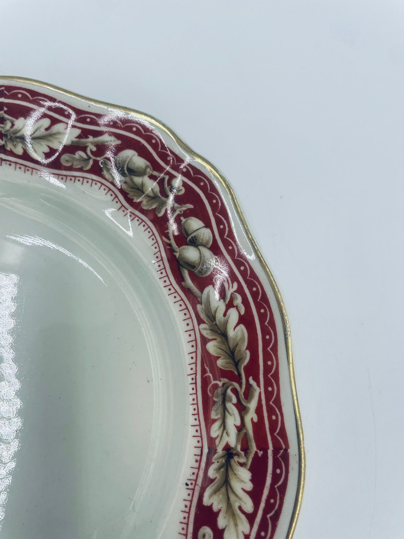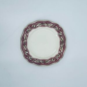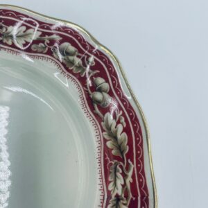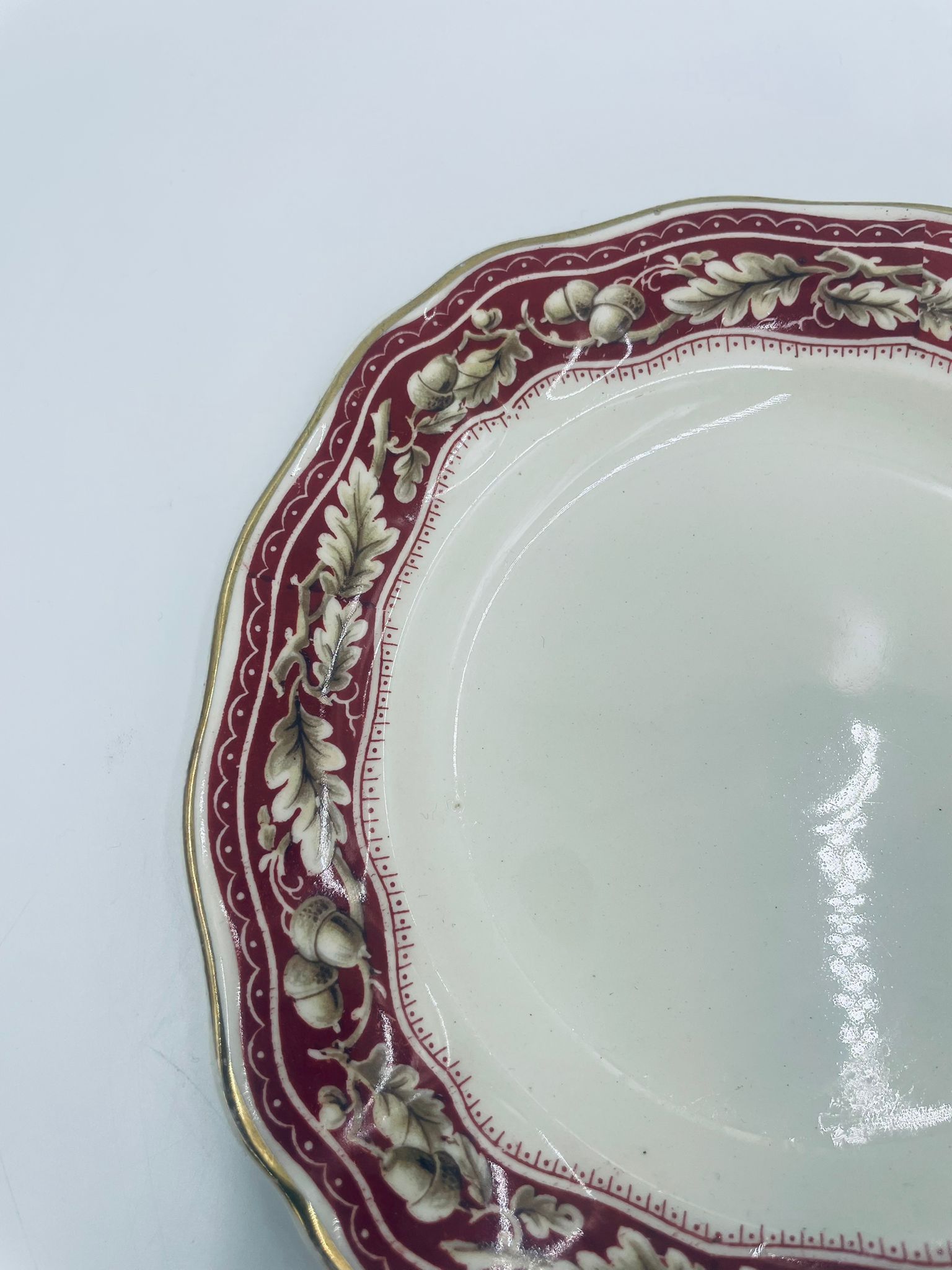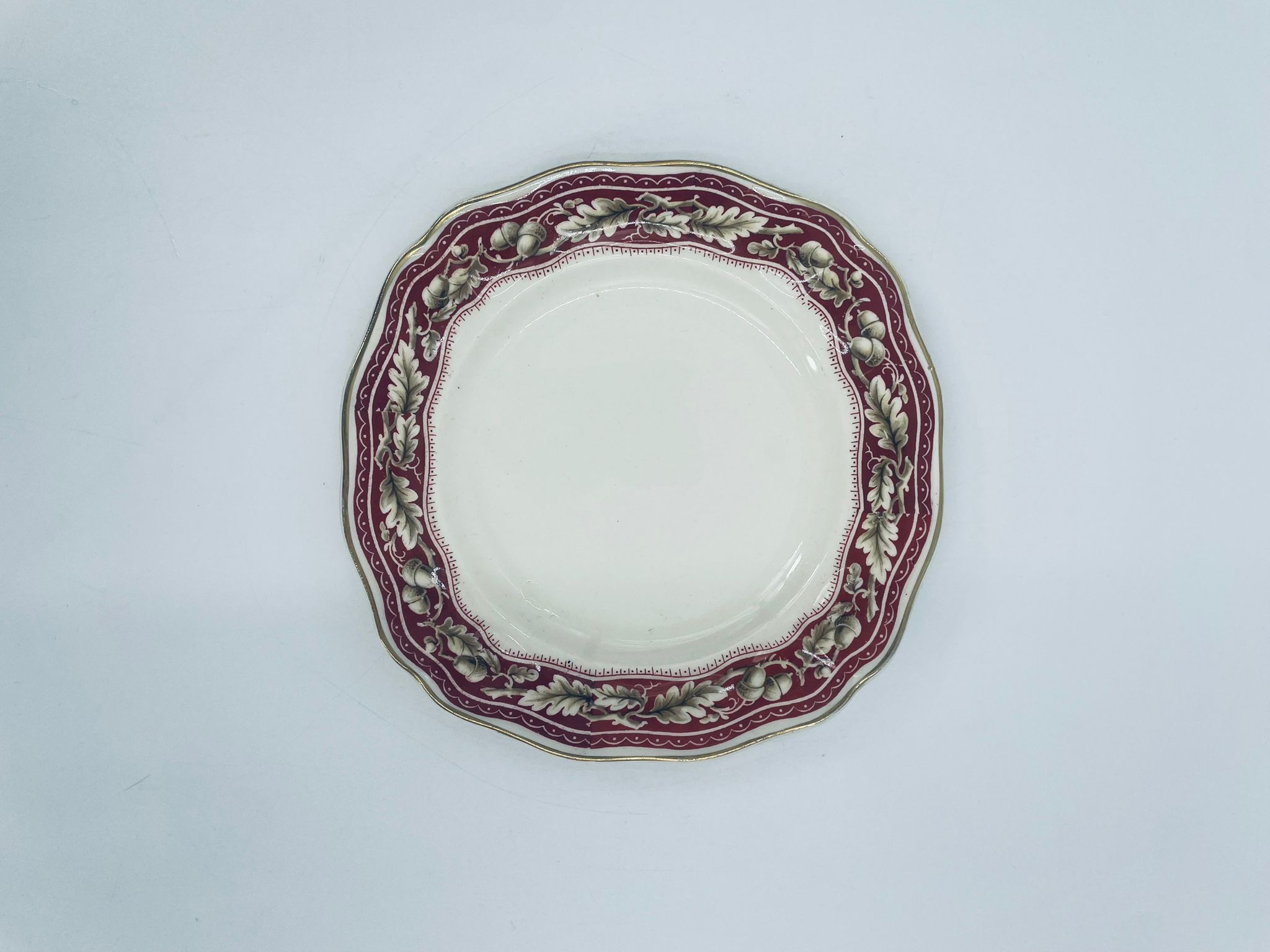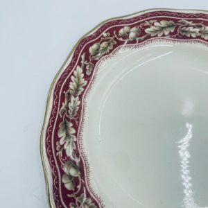 Mały talerzyk Angielskiej wytwórni Grindley z serii Marlborough Royal Petal, z sygnaturą używaną w latach 1936-1954, wykonany z wysokiej jakości porcelany. Talerzyk o falistym, złoconym rancie z bogatym bordowym tłem, z misternymi wzorami liści i żołędzi. Posiada przetarcie złocenia.