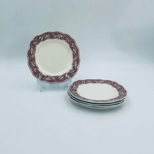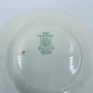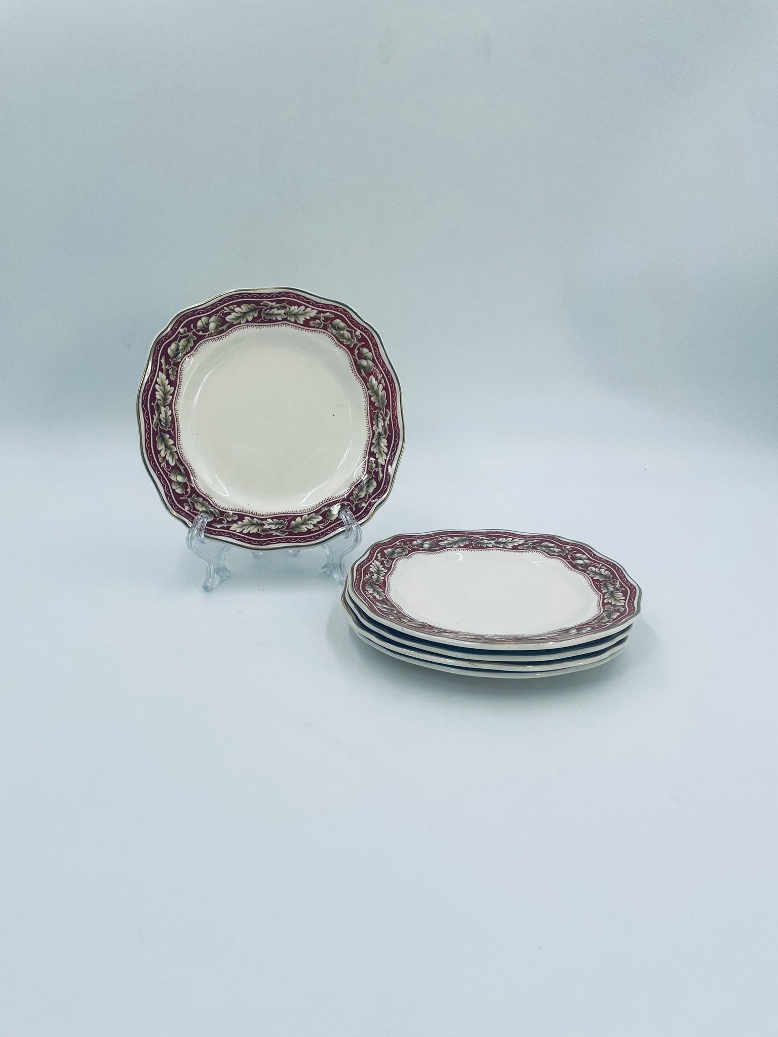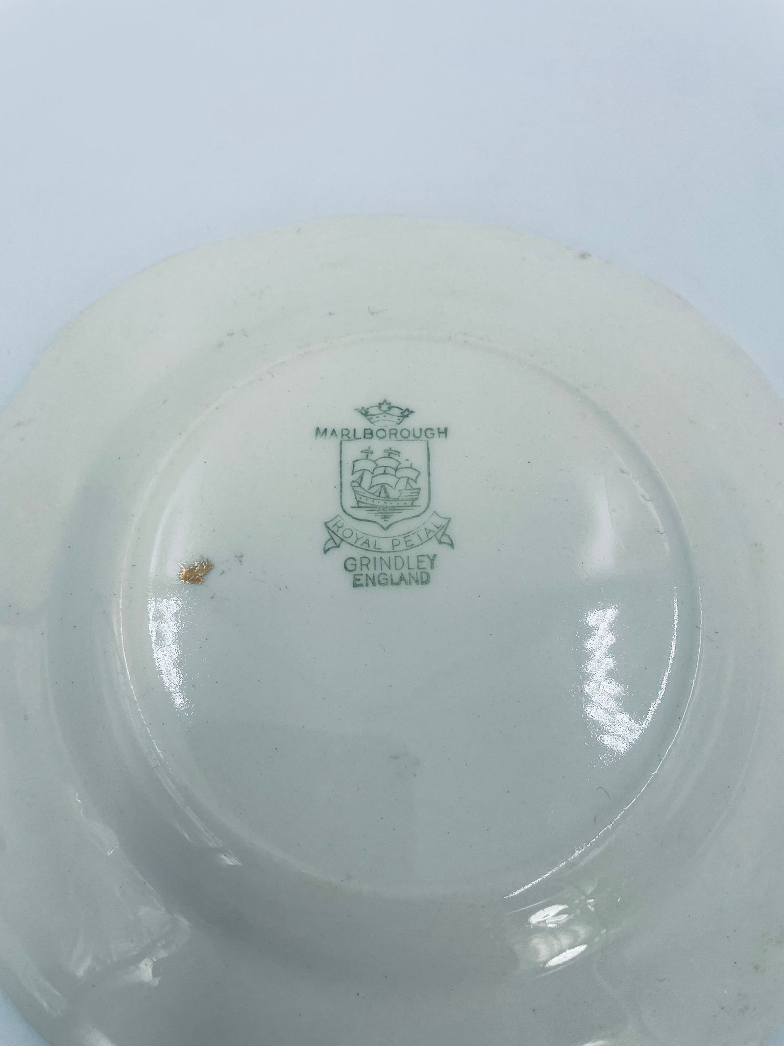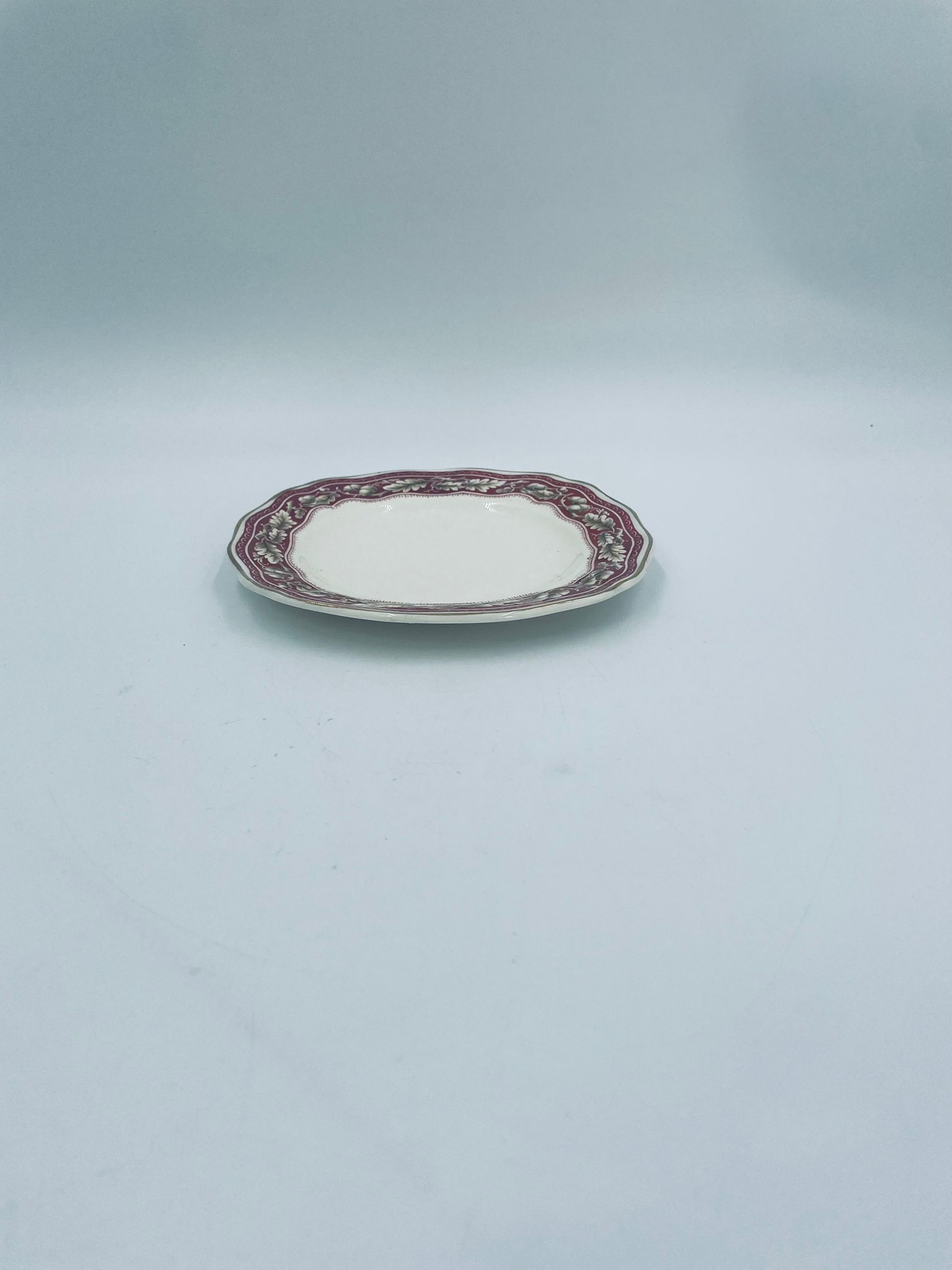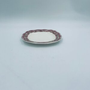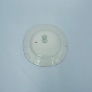 Mały talerzyk Angielskiej wytwórni Grindley z serii Marlborough Royal Petal, z sygnaturą używaną w latach 1936-1954, wykonany z wysokiej jakości porcelany. Talerzyk o falistym, złoconym rancie z bogatym bordowym tłem, z misternymi wzorami liści i żołędzi. Posiada przetarcie złocenia.