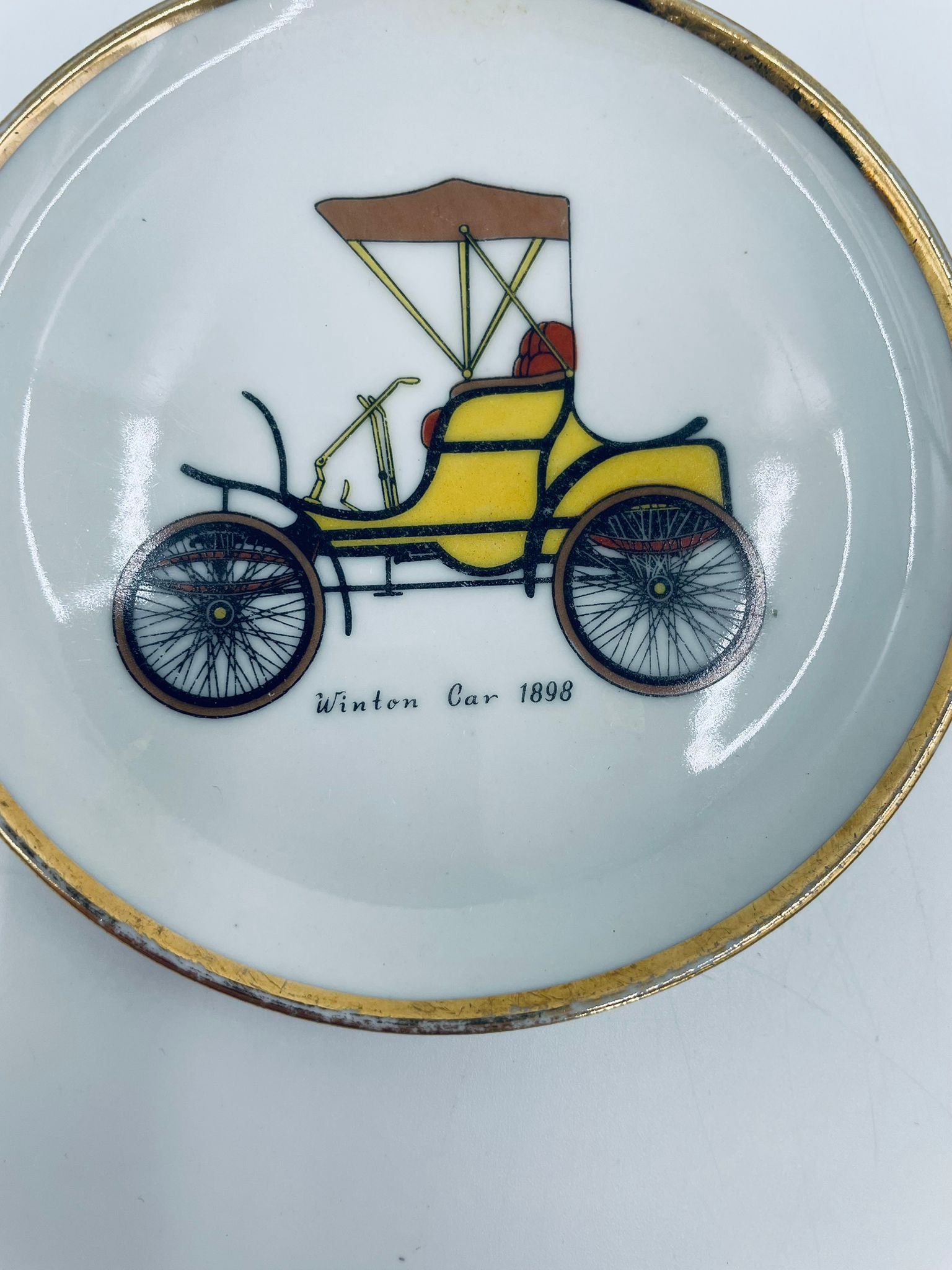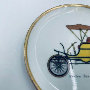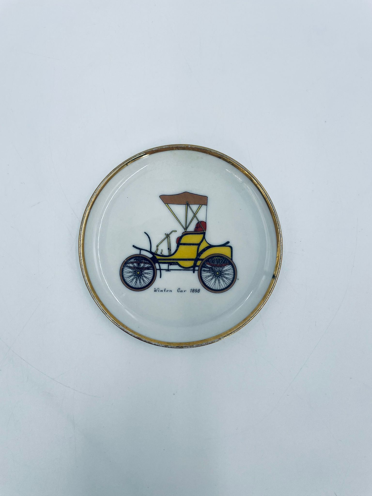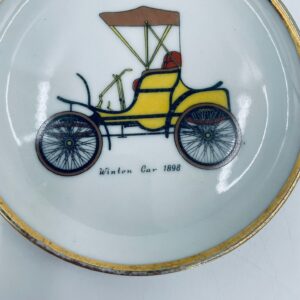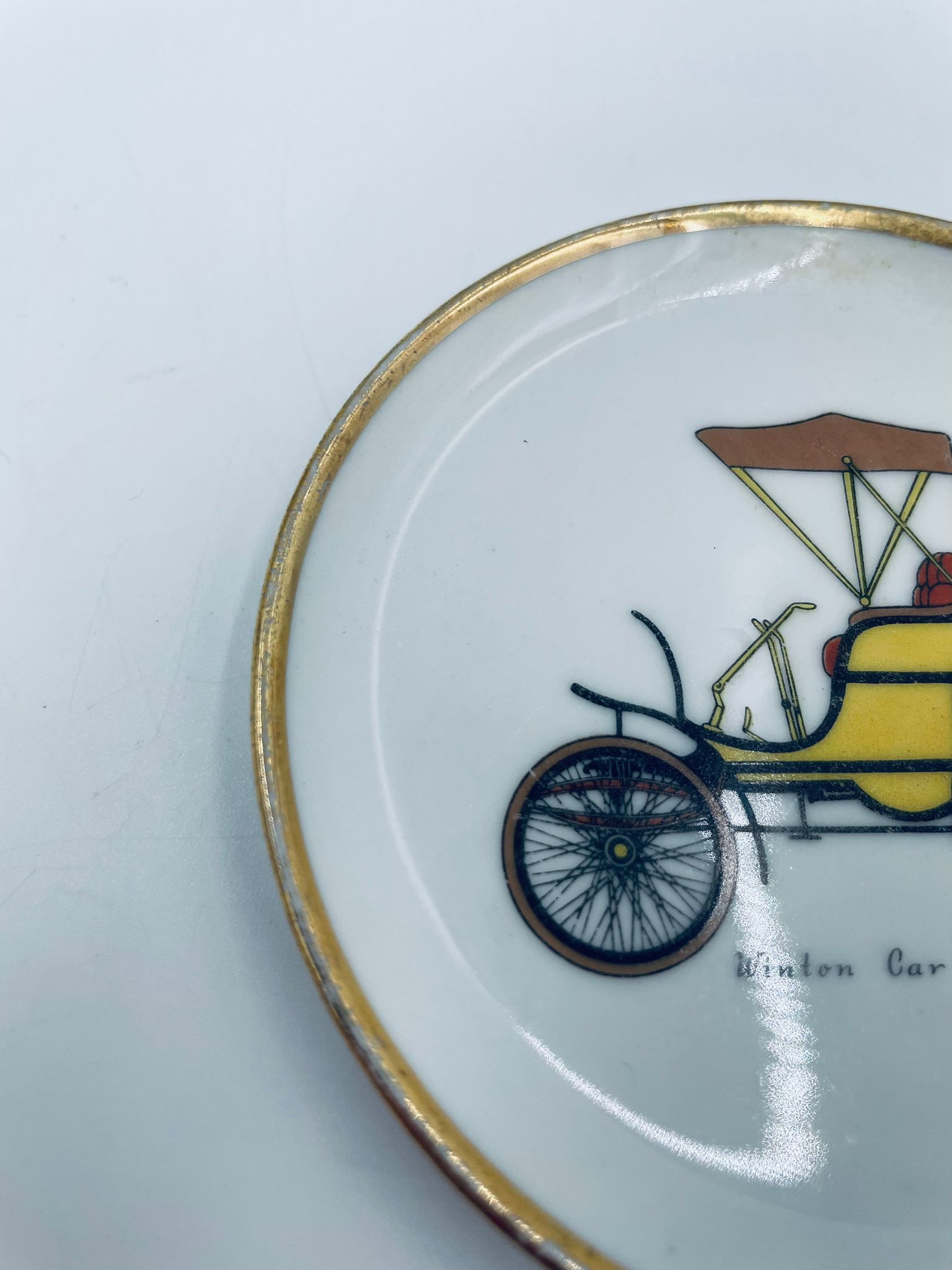 Mały talerzyk kolekcjonerski wytwórni Schumann Arzberg Bavaria, wykonany z wysokiej jakości białej porcelany. Talerzyk z motywem zabytkowego samochodu Winton Car z 1898r, ozdobiony złoceniem na rancie. Posiada przetarcie na złoceniu.
