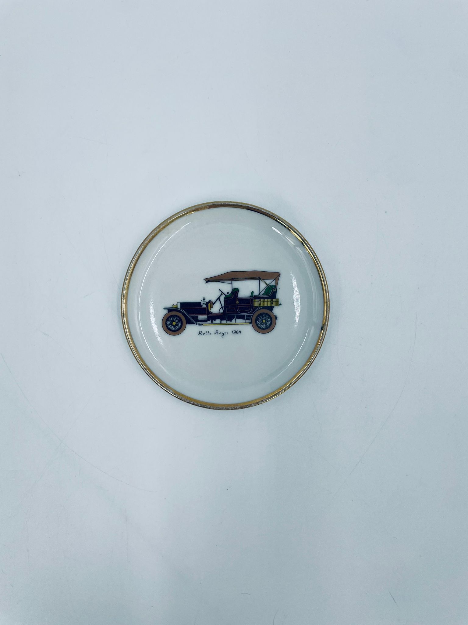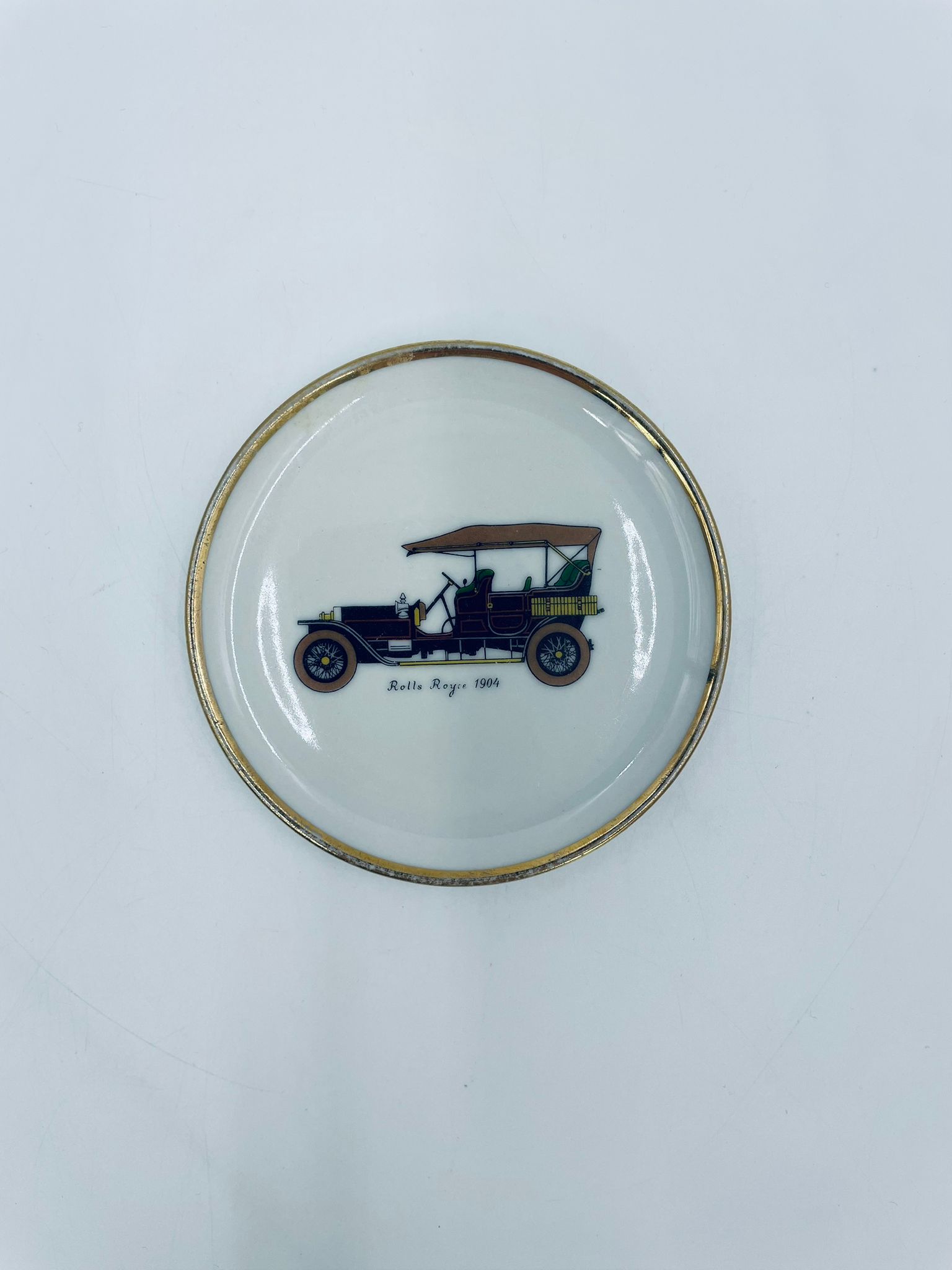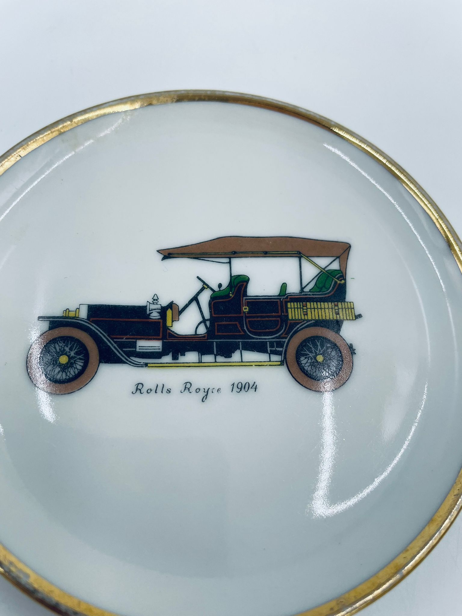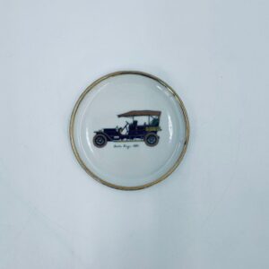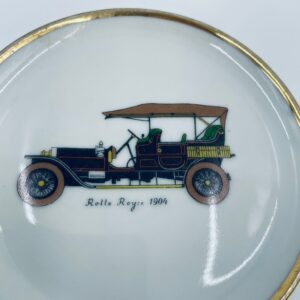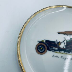 Mały talerzyk kolekcjonerski wytwórni Schumann Arzberg Bavaria, wykonany z wysokiej jakości białej porcelany. Talerzyk z motywem zabytkowego samochodu Rolls Royce z 1904r, ozdobiony złoceniem na rancie. Posiada przetarcie na złoceniu.