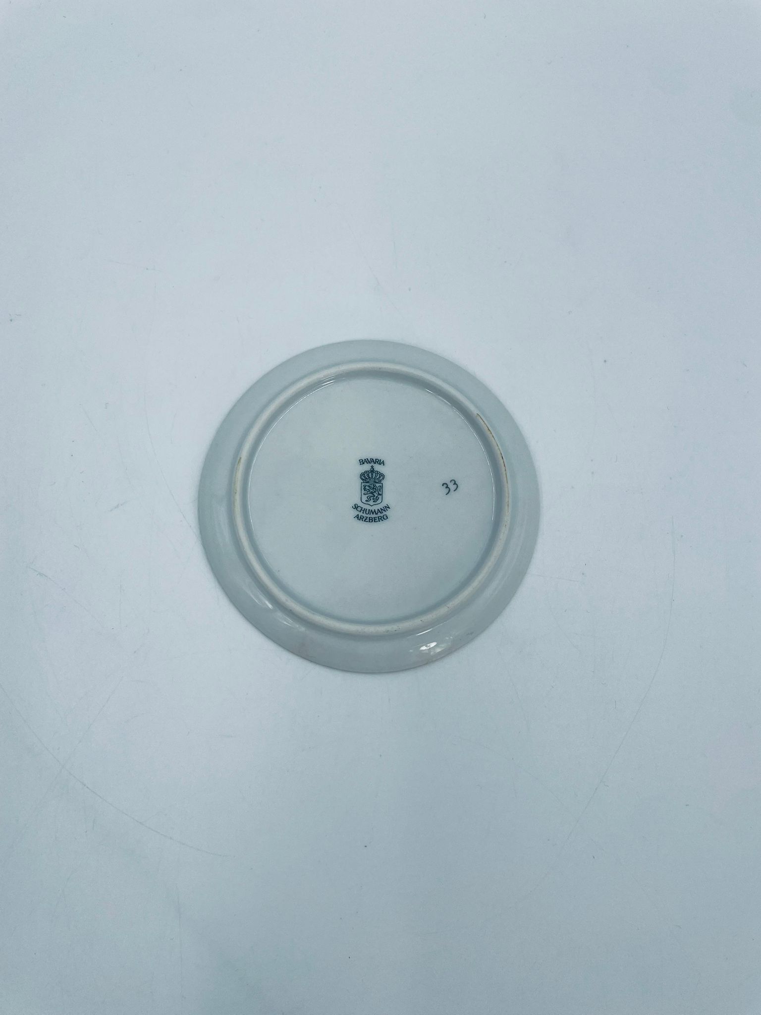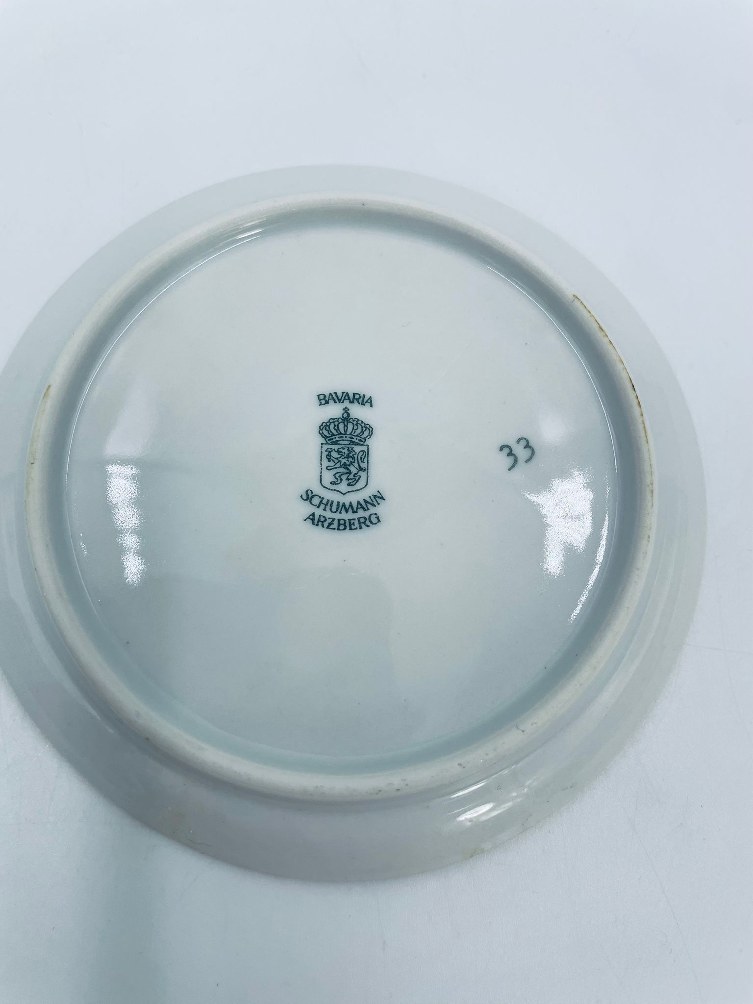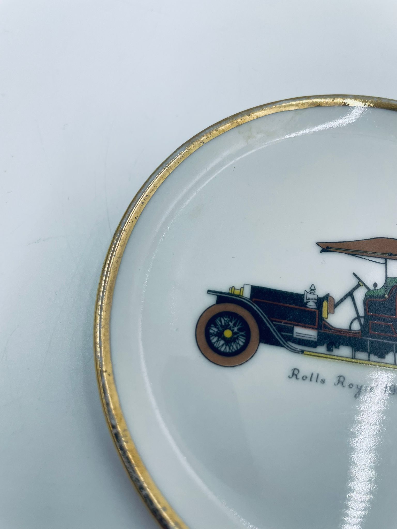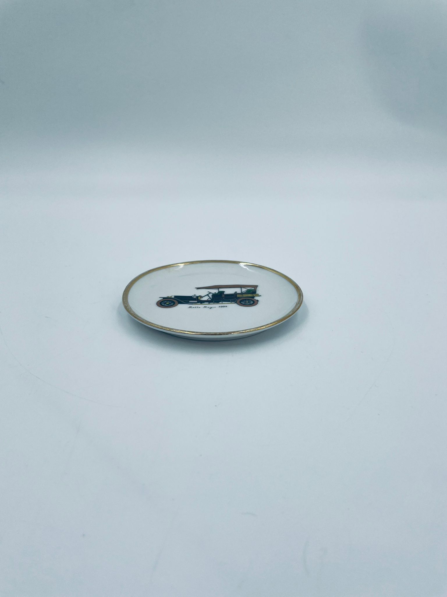 Mały talerzyk kolekcjonerski wytwórni Schumann Arzberg Bavaria, wykonany z wysokiej jakości białej porcelany. Talerzyk z motywem zabytkowego samochodu Rolls Royce z 1904r, ozdobiony złoceniem na rancie. Posiada przetarcie na złoceniu.
