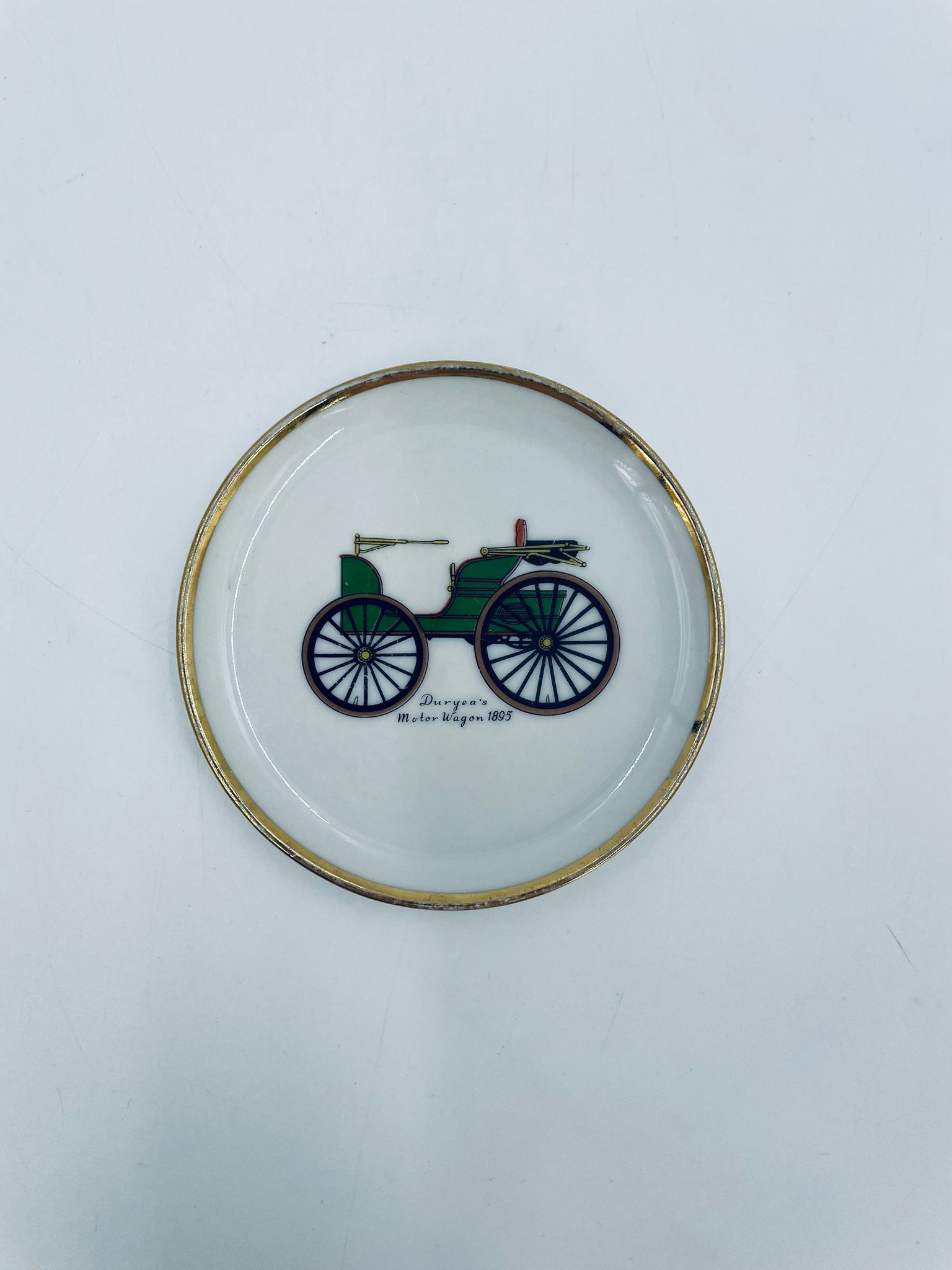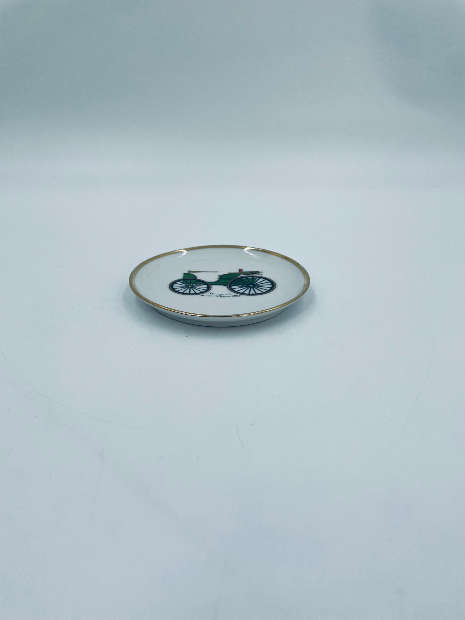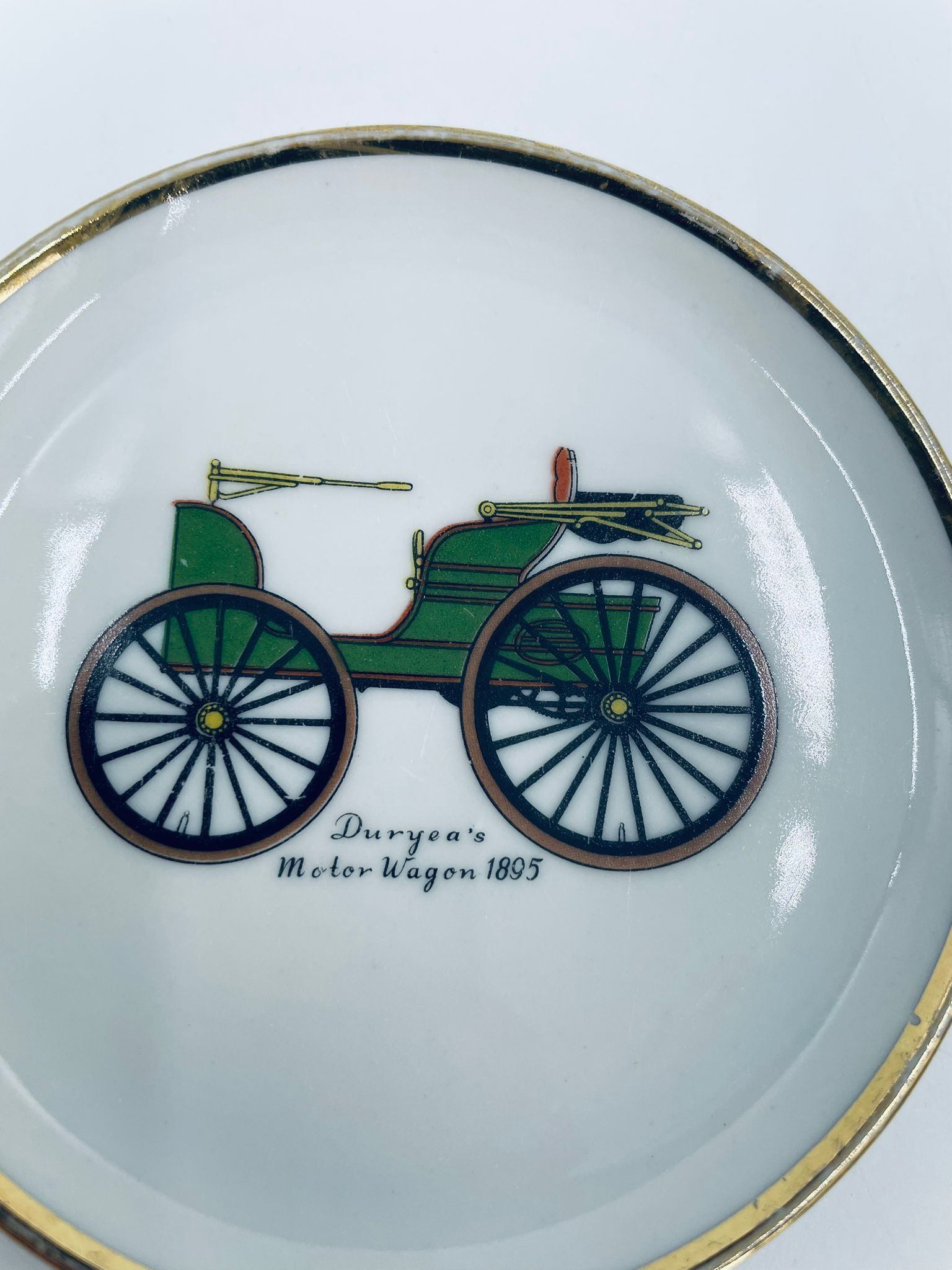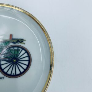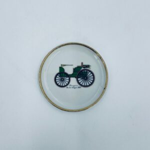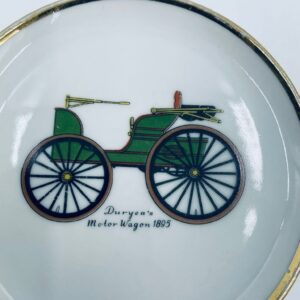 Mały talerzyk kolekcjonerski wytwórni Schumann Arzberg Bavaria, wykonany z wysokiej jakości białej porcelany. Talerzyk z motywem zabytkowego samochodu Duryea Motor Wagon z 1895r, ozdobiony złoceniem na rancie. Posiada przetarcie na złoceniu.