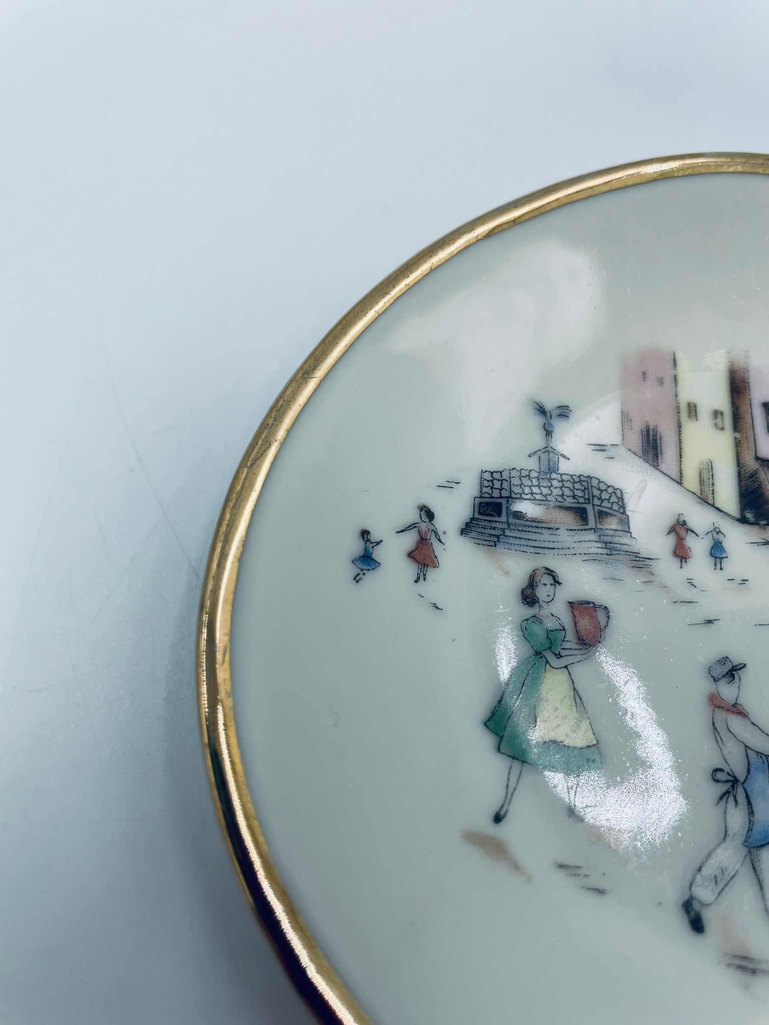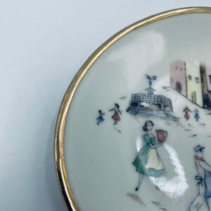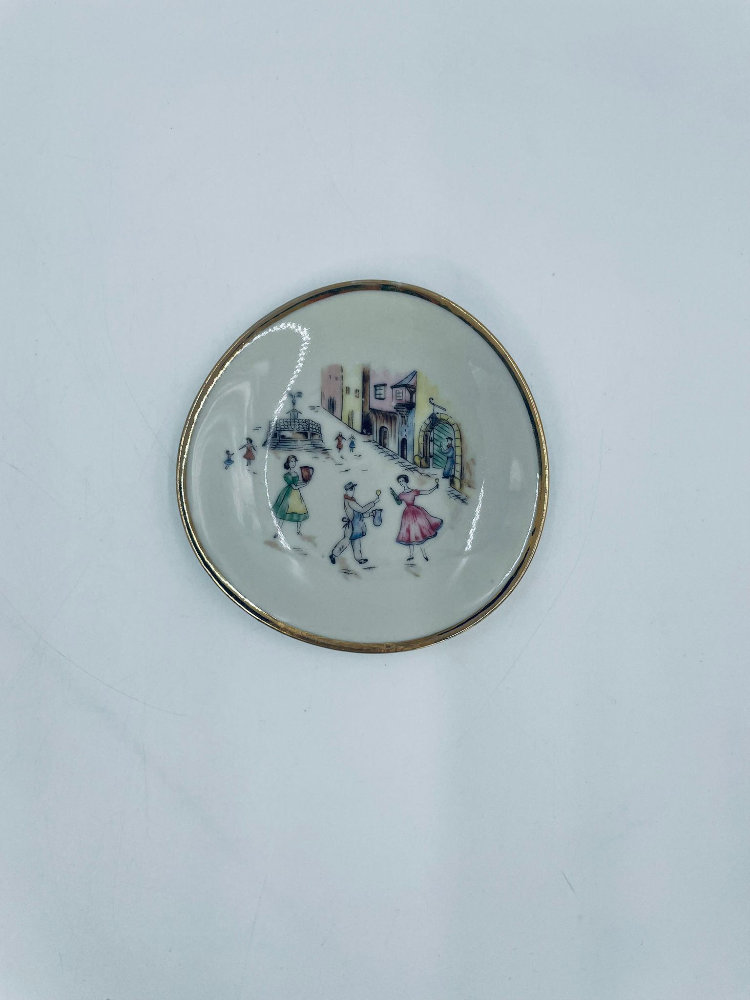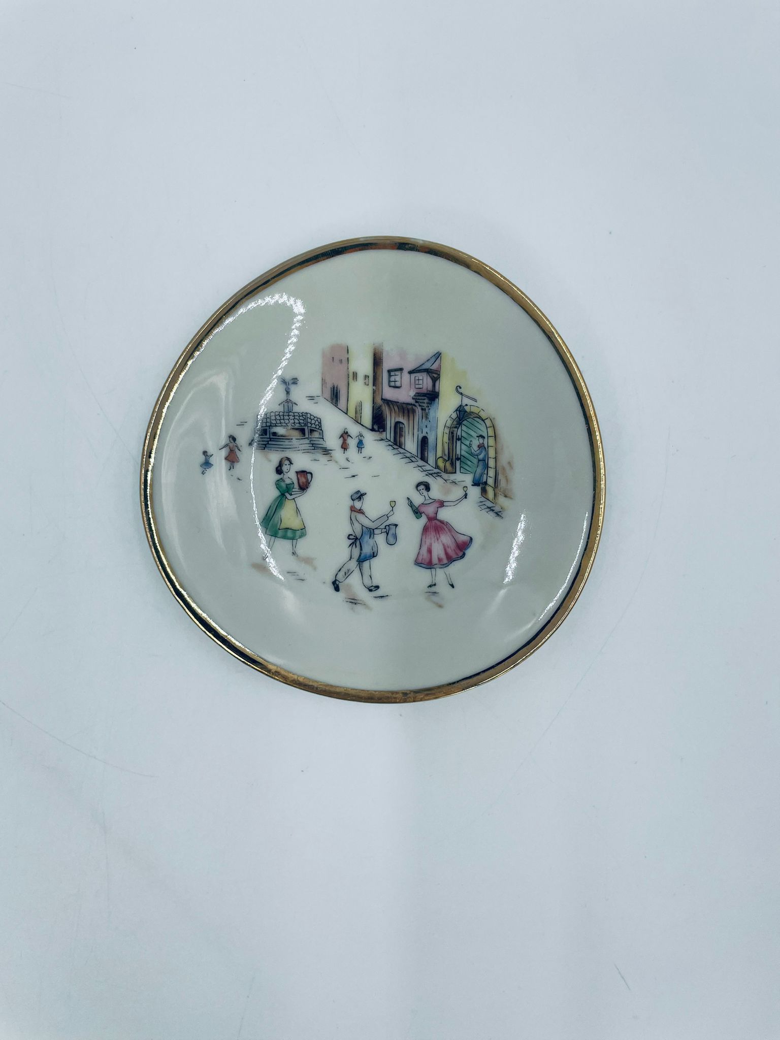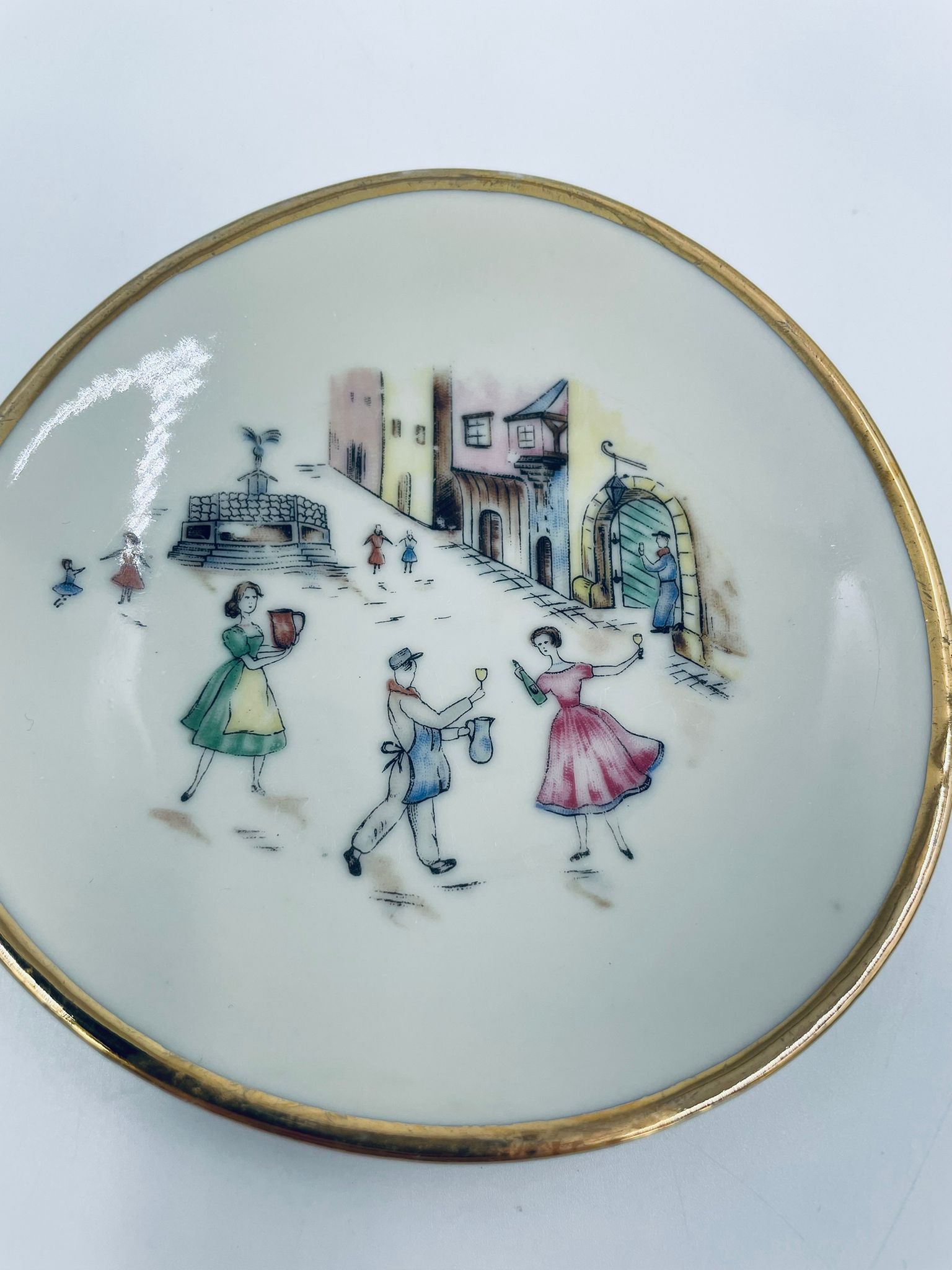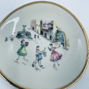 Mały talerzyk konfiturówka pochodzący z Bavarii, wykonany z wysokiej jakości porcelany w kolorze ecru. Talerzyk ręczne malowany, przedstawiający scenkę rodzajową z ludźmi tańczącymi i bawiącymi się na tle dawnego miasteczka, wykończony złoceniem na rancie. Posiada przetarcie na złoceniu.