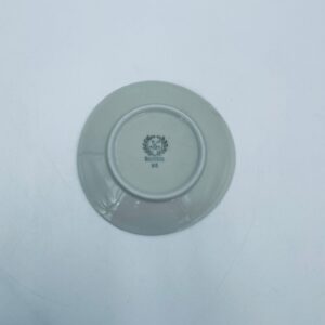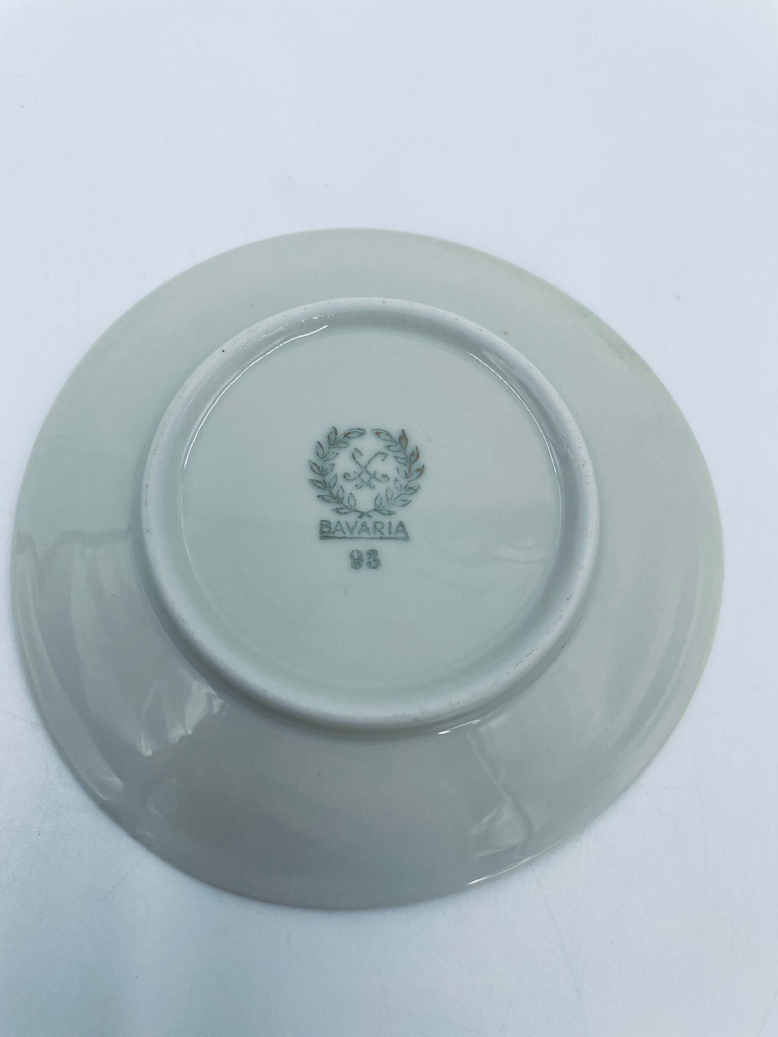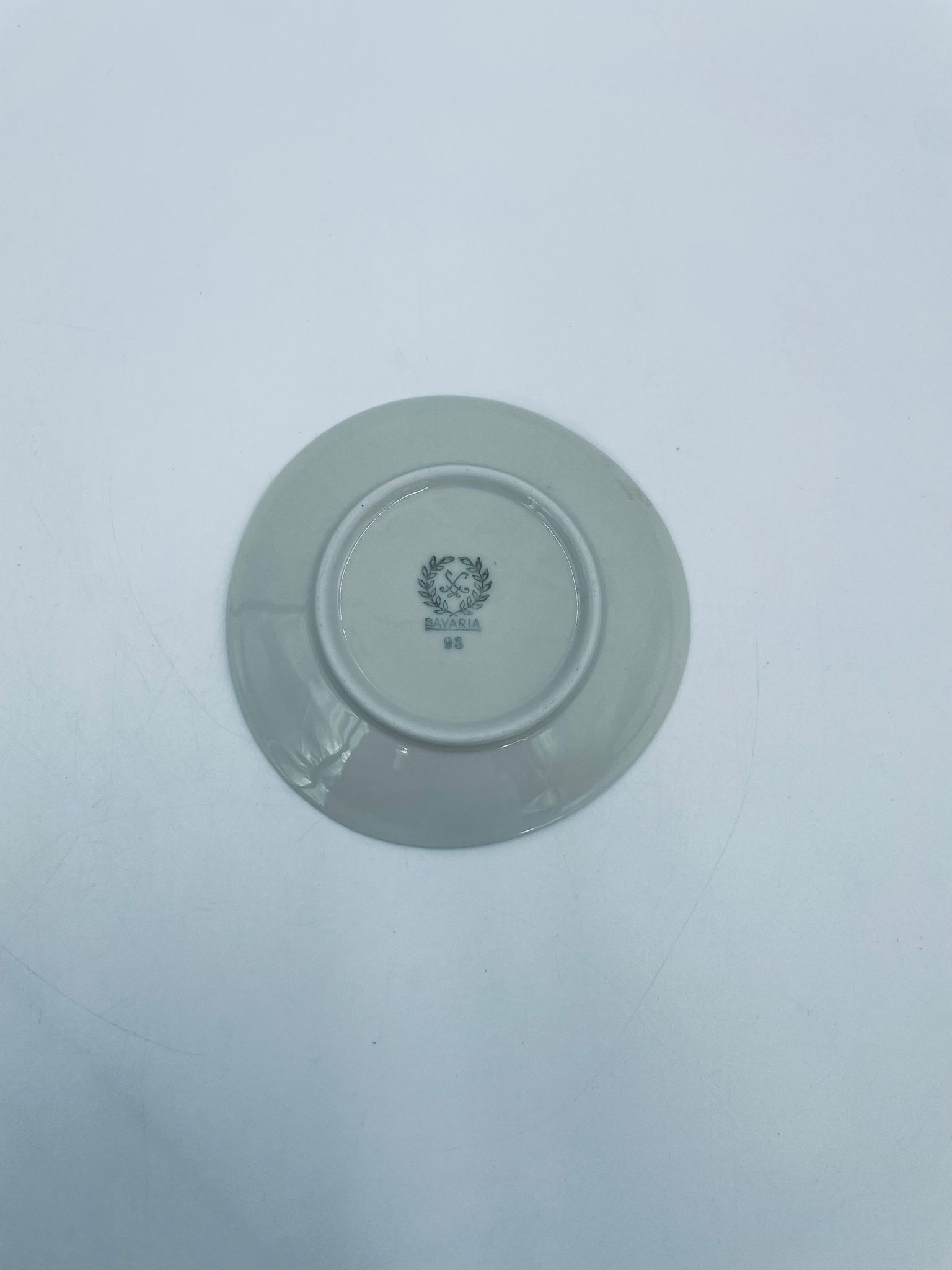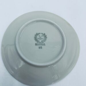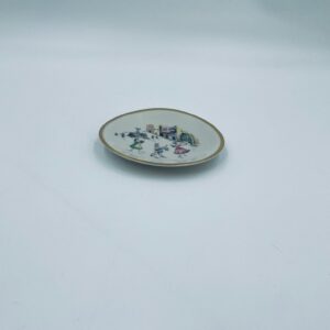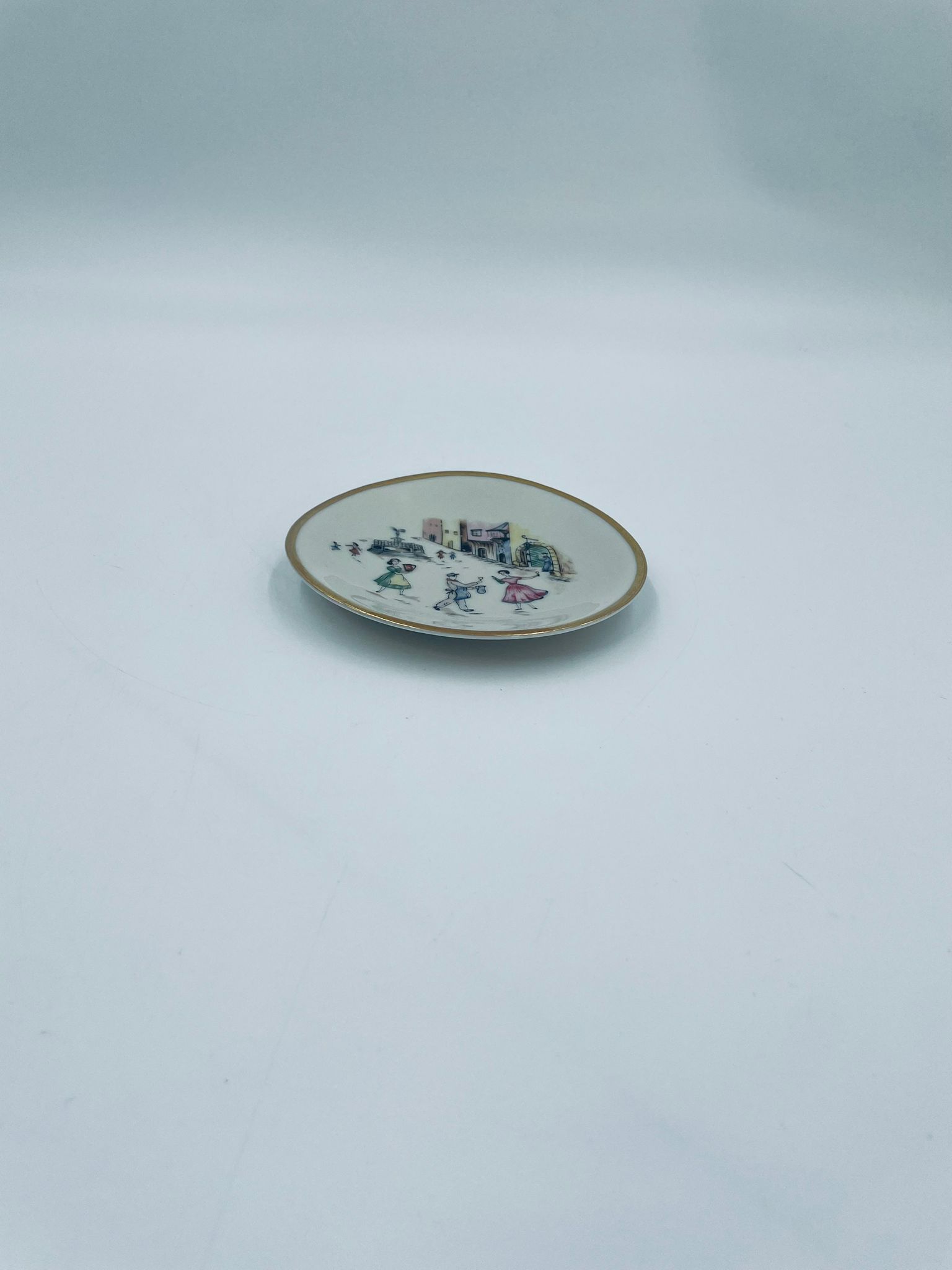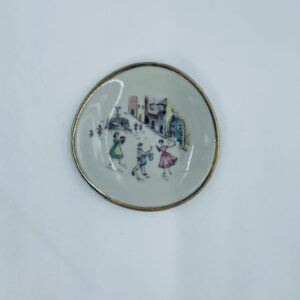 Mały talerzyk konfiturówka pochodzący z Bavarii, wykonany z wysokiej jakości porcelany w kolorze ecru. Talerzyk ręczne malowany, przedstawiający scenkę rodzajową z ludźmi tańczącymi i bawiącymi się na tle dawnego miasteczka, wykończony złoceniem na rancie. Posiada przetarcie na złoceniu.